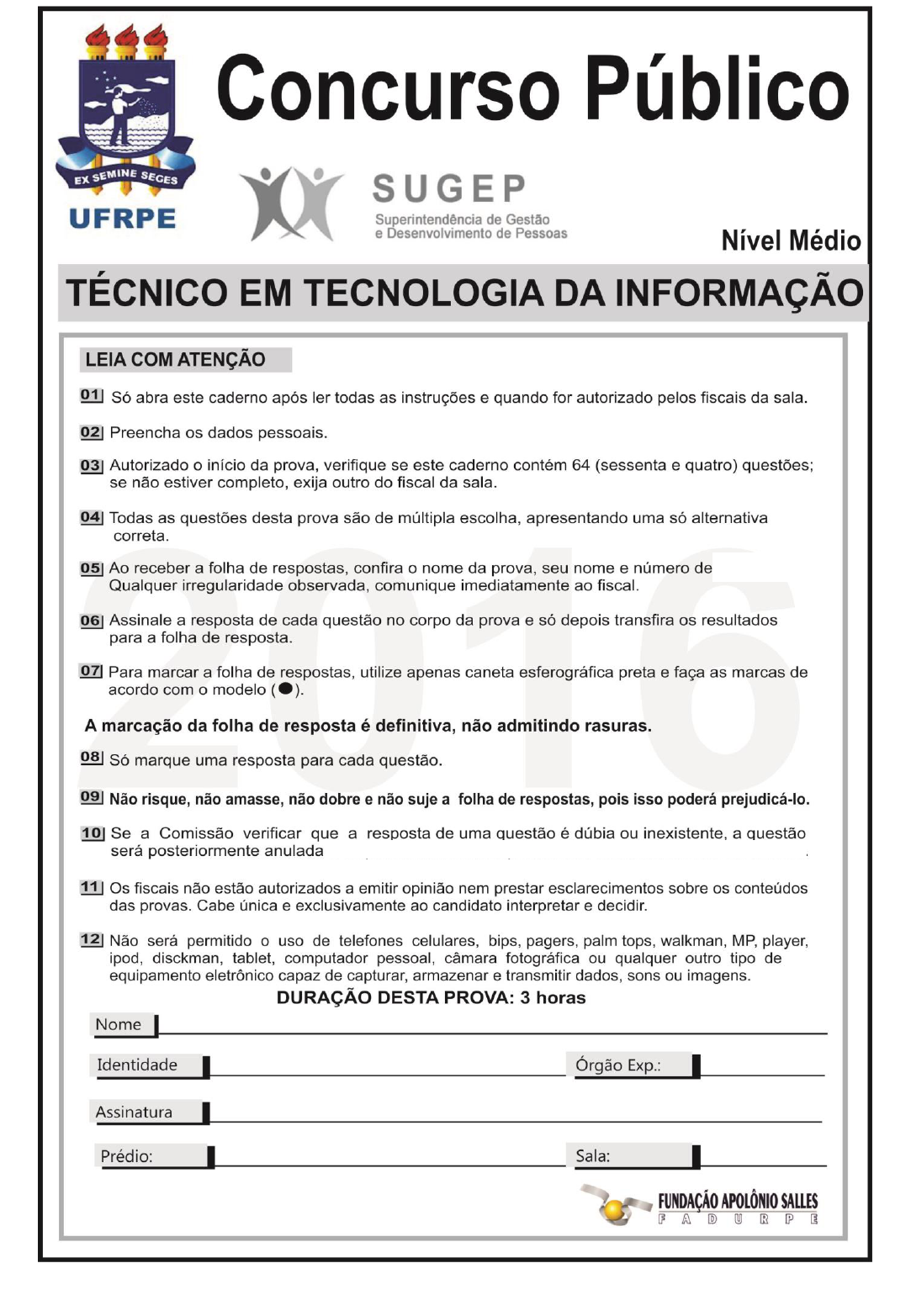 Concurso Público / SUGEP / UFRPE / CARGO: TÉCNICO EM TECNOLOGIA DA INFORMAÇÃO 1 identidade. Concurso Público / SUGEP / UFRPE / CARGO: TÉCNICO EM TECNOLOGIA DA INFORMAÇÃO 2 Português TEXTO 1 A Linguagem verbal e os textos As diferenças que podem ser observadas entre os textos dizem respeito à sua situação de produção e de circulação, inclusive a finalidade a que se destinam. São os chamados gêneros de texto. Por exemplo: se o locutor quer instruir seu interlocutor, ele indica passo a passo o que deve ser feito para a obtenção de um bom resultado, como ocorre numa receita de bolo. Se quer persuadir alguém a consumir um produto, ele argumenta, como faz em um anúncio de chocolate. Se quer contar fatos reais, ele pode escrever uma notícia. Se quer contar uma história ficcional, ele pode produzir um conto. Se quer transmitir conhecimentos, ele deve construir um texto em que exponha com clareza os saberes relacionados ao objeto em foco. Ou seja, quando interagimos com outras pessoas por meio da linguagem, seja ela oral ou escrita, produzimos certos textos que, com poucas variações, se repetem no tipo de conteúdo, no tipo de linguagem e de estrutura. Esses textos constituem os chamados ‘gêneros textuais’ e foram historicamente criados pelas pessoas a fim de atender a determinadas necessidades de interação social. De acordo com o momento histórico, pode nascer um gênero novo, podem desaparecer gêneros de pouco uso ou, ainda, um gênero pode sofrer mudanças. Numa situação de interação verbal, a escolha do gênero textual é feita de acordo com os diferentes elementos que fazem o contexto, tais como: quem está falando ou escrevendo; para quem; com que finalidade; em que momento histórico etc. Os gêneros estão ligados a esferas de circulação da linguagem. Assim, por exemplo, na esfera jornalística, são comuns gêneros como notícias, reportagens, editoriais, entrevistas; na esfera da divulgação científica, são comuns gêneros como verbete de dicionário ou de enciclopédia, artigo ou ensaio científico, seminário, conferência etc. Desse modo, os gêneros de texto que circulam na sociedade têm uma grande vinculação com o momento histórico-cultural de cada contexto. (William Cereja; Thereza Cochar; Ciley Cleto. Interpretação de textos. São Paulo: Editora Atual, 2009, p. 29. Adaptado). 01. Assinale a alternativa que apresenta a síntese do tema em torno do qual se desenvolve o Texto 1. A) A finalidade a que se destinam os textos escritos é decisiva para fixar o seu conteúdo e a sua estrutura. B) As áreas sociais em que os textos circulam muito pouco se alteram, daí resultando regulares tipos de texto. C) Os textos, apesar de regulares, apresentam variações em decorrência das condições em que eles são produzidos e recebidos. D) Os momentos históricos e culturais em que ocorrem as atividades de linguagem são absolutamente autônomos. E) Aos usuários da comunicação verbal é negada a possibilidade de alterar os modelos dos textos, orais e escritos, em que se expressam. 02. O Texto 1 tem como objetivo central chamar a atenção do leitor para o fato de que, quando usamos a linguagem: A) produzimos textos que devem seguir a estrutura própria de cada língua, conforme se trate da oralidade ou da escrita. B) estamos desvinculados dos momentos e dos espaços históricos em que acontecem nossas atividades verbais. C) devemos atentar para a sua finalidade expositiva e esclarecedora, sobretudo quando se trata da divulgação científica. D) recorremos a certas regularidades textuais, as quais, apesar de flexíveis, constituem modelos mais ou menos padronizados. E) podemos criar novos padrões de texto, um processo que geralmente é responsável por gerar problemas de compreensão. 03. As afirmações feitas no Texto 1 nos levam a concluir que: A) a fala e a escrita seguem normas invariáveis, independentes de seus contextos de uso. B) as pessoas cumprem as mesmas finalidades no exercício de suas interações sociais. C) os textos, sobretudo aqueles escritos, são completamente imprevisíveis. D) os usos da linguagem verbal são determinados pelas regras da estrutura de cada língua. E) os textos em que nos expressamos são, ao mesmo tempo, padronizados e flexíveis. 04. Para a compreensão do primeiro parágrafo, é fundamental perceber: A) seu conteúdo explicativo; daí a incidência das enumerações e seu caráter enfático. B) sua finalidade argumentativa; por isso, ocorreram tantas e tão diferentes figuras de linguagem. C) o interesse do autor em ser claro e objetivo; escreveu como quem faz literatura. D) o propósito de ser convincente, algo sempre ligado ao uso de uma linguagem gramaticalmente correta. E) a distanciamento do texto em relação à língua oral; por isso, o uso de palavras eruditas. 05. Interprete o seguinte trecho do Texto 1: “Esses textos constituem os chamados gêneros textuais e foram historicamente criados pelas pessoas”. Assinale a alternativa em que o sentido global desse trecho está mantido. A) Esses textos constituem os chamados gêneros textuais uma vez que foram historicamente criados pelas pessoas. B) Esses textos constituem os chamados gêneros textuais, como foram historicamente criados pelas pessoas. C) Esses textos constituem os chamados gêneros textuais conforme foram historicamente criados pelas pessoas. D) Esses textos não só constituem os chamados gêneros textuais, mas também foram historicamente criados pelas pessoas. E) Esses textos constituem os chamados gêneros textuais, porém foram historicamente criados pelas pessoas. Concurso Público / SUGEP / UFRPE / CARGO: TÉCNICO EM TECNOLOGIA DA INFORMAÇÃO 3 06. Para circular em contextos públicos formais, um texto escrito deve estar de acordo com a norma-padrão da língua. Assinale a alternativa em que as normas da concordância verbal foram atendidas. A) De acordo com o momento histórico, gêneros de pouco uso podem desaparec