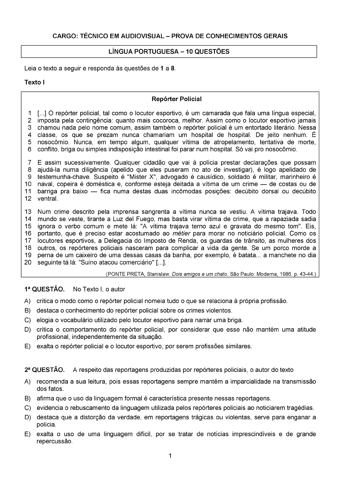 CARGO: TÉCNICO EM AUDIOVISUAL - PROVA DE CONHECIMENTOS GERAIS LÍNGUA PORTUGUESA - 10 QUESTÕES Leia o texto a seguir e responda às questões de 1 a 8. Texto I Repórter Policial 1 [...] O repórter policial, tal como o locutor esportivo, é um camarada que fala uma língua especial, 2 imposta pela contingência: quanto mais cocoroca, melhor. Assim como o locutor esportivo jamais 3 chamou nada pelo nome comum, assim também o repórter policial é um entortado literário. Nessa 4 classe, os que se prezam nunca chamariam um hospital de hospital. De jeito nenhum. É 5 nosocômio. Nunca, em tempo algum, qualquer vítima de atropelamento, tentativa de morte, 6 conflito, briga ou simples indisposição intestinal foi parar num hospital. Só vai pro nosocômio. 7 E assim sucessivamente. Qualquer cidadão que vai à polícia prestar declarações que possam 8 ajudá-la numa diligência (apelido que eles puseram no ato de investigar), é logo apelidado de 9 testemunha-chave. Suspeito é "Mister X", advogado é causídico, soldado é militar, marinheiro é 10 naval, copeira é doméstica e, conforme esteja deitada a vítima de um crime — de costas ou de 11 barriga pra baixo — fica numa destas duas incômodas posições: decúbito dorsal ou decúbito 12 ventral. 13 Num crime descrito pela imprensa sangrenta a vítima nunca se vestiu. A vítima trajava. Todo 14 mundo se veste, tirante a Luz del Fuego, mas basta virar vítima de crime, que a rapaziada sadia 15 ignora o verbo comum e mete lá: "A vítima trajava terno azul e gravata do mesmo tom". Eis, 16 portanto, que é preciso estar acostumado ao métier para morar no noticiário policial. Como os 17 locutores esportivos, a Delegacia do Imposto de Renda, os guardas de trânsito, as mulheres dos 18 outros, os repórteres policiais nasceram para complicar a vida da gente. Se um porco morde a 19 perna de um caixeiro de uma dessas casas da banha, por exemplo, é batata... a manchete no dia 20 seguinte tá lá: "Suíno atacou comerciário" [...]. ______________________________ (PONTE PRETA, Stanislaw. Dois amigos e um chato. São Paulo: Moderna, 1986. p. 43-44.) 1a QUESTÃO. No Texto I, o autor A) critica o modo como o repórter policial nomeia tudo o que se relaciona à própria profissão. B) destaca o conhecimento do repórter policial sobre os crimes violentos. C) elogia o vocabulário utilizado pelo locutor esportivo para narrar uma briga. D) critica o comportamento do repórter policial, por considerar que esse não mantém uma atitude profissional, independentemente da situação. E) exalta o repórter policial e o locutor esportivo, por serem profissões similares. 2a QUESTÃO. A respeito das reportagens produzidas por repórteres policiais, o autor do texto A) recomenda a sua leitura, pois essas reportagens sempre mantêm a imparcialidade na transmissão dos fatos. B) afirma que o uso da linguagem formal é característica presente nessas reportagens. C) evidencia o rebuscamento da linguagem utilizada pelos repórteres policiais ao noticiarem tragédias. D) destaca que a distorção da verdade, em reportagens trágicas ou violentas, serve para enganar a polícia. E) exalta o uso de uma linguagem difícil, por se tratar de notícias imprescindíveis e de grande repercussão. 1 3a QUESTÃO. No texto, o uso da expressão "entortado literário” (linha 3) denota que, para o autor, A) a escrita do repórter policial é carregada de linguagem poética. B) a reportagem policial assemelha-se aos escritos exclusivamente literários. C) o repórter policial faz uso de palavras que nunca existiram. D) o uso de termos incomuns prejudica a leitura do texto do repórter policial. E) a literatura ficcional necessariamente integra as notícias policiais. 4a QUESTÃO. No texto, o uso da expressão "imprensa sangrenta” (linha 13) denota que, para o autor, A) as manchetes policiais só consideram os mínimos detalhes dos crimes. B) a imprensa não perde a oportunidade de relatar imparcialmente os fatos. C) as notícias são veiculadas com o objetivo principal de enganar o espectador. D) as reportagens policiais geralmente enfatizam o aspecto trágico dos fatos. E) os repórteres são responsáveis pela execução dos fatos narrados. 5a QUESTÃO. No excerto "Eis, portanto, que é preciso estar acostumado ao métier para morar no noticiário policial” (linhas 15-16), o verbo "morar” é empregado no sentido A) literal. B) hiperbólico. C) denotativo. D) comparativo. E) pejorativo. 6a QUESTÃO. Analise as afirmativas a seguir, considerando os recursos referenciais empregados no texto. I. O termo "que” (linha 4) refere-se a "os” (linha 4). II. O termo "-la” (linha 8) refere-se a "polícia” (linha 7). III. O termo "destas” (linha 11) refere-se a "declarações” (linha 7). IV. O termo "lá” (linha 15) refere-se a "vítima” (linha 14). É CORRETO o que se afirma em A) I, apenas. B) I e II, apenas. C) II e III, apenas D) III, apenas. E) IV, apenas. 2 7a QUESTÃO. Ao se referir ao grupo de pessoas que "nasceram para complicar a vida da gente” (linha 18), o autor do texto NÃO INCLUI entre essas: A) os locutores esportivos. B) os marinheiros navais. C) os guardas de trânsito. D) as mulheres dos outros. E) os repórteres policiais. 8a QUESTÃO. No excerto "Num crime descrito pela imprensa sangrenta a vítima nunca se vestiu” (linha 13), a expressão "pela imprensa sangrenta” exerce a mesma função sintático-semântica do trecho destacado em: A) O bandido preso pela denúncia anônima recebeu um castigo. B) Aquela porta trocada pela janela ampla deixou a sala mais arejada. C) A modelo exposta pela foto comprometedora ficou sem ação. D) O garoto encontrado pela secretária executiva era filho do diretor. E) O cofre escondido pela pintura famosa passou despercebido. Leia o texto a seguir e responda às questões 9 e 10. Texto II www.hortHruti.com.tir Disponível em:< http://www.hortifruti.com.br/comunicacao/campanhas/cascas/>. Acesso em: