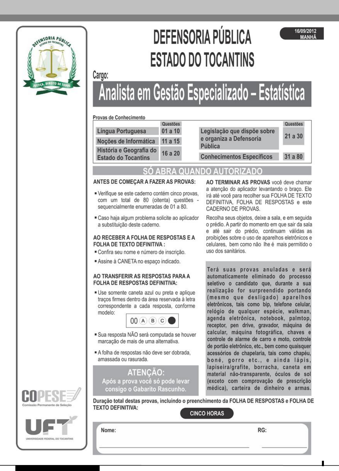 UUUFFFTTT ///CCCOOOPPPEEESSSEEE DDDEEEFFFEEENNNSSSOOORRRIIIAAA PPPÚÚÚBBBLLL IIICCC AAA DDD OOO EEESSSTTTAAADDDOOO DDDOOO TTTOOOCCCAAANNNTTT IIINNNSSS 1 Analista em Gestão Especializado – Estatística UUUFFFTTT ///CCCOOOPPPEEESSSEEE DDDEEEFFFEEENNNSSSOOORRRIIIAAA PPPÚÚÚBBBLLL IIICCC AAA DDD OOO EEESSSTTTAAADDDOOO DDDOOO TTTOOOCCCAAANNNTTT IIINNNSSS 2 Analista em Gestão Especializado – Estatística LÍNGUA PORTUGUESAaA O fragmento a seguir será o texto base para se responderem as questões de 1 a 10 desta prova. Ele compõe a obra “O Processo”, escrita pelo tcheco Franz Kafka (em tradução de Torrieri Guimarães. São Paulo: Abril Cultural, 1979. p. 228- 230.). Autores e estudiosos têm denominado o excerto como sendo uma parábola, intitulando-a “Diante da lei”. 1 5 10 15 20 25 30 35 40 45 50 55 60 65 Diante da lei está postado um guarda. Até ele se chega um homem do campo que lhe pede que o deixe entrar na lei. Mas o sentinela lhe diz que nesse momento não é permitido entrar. O homem reflete e depois pergunta se mais tarde lhe será permitido entrar. “É possível”, diz o guarda, “mas agora não.” A grande porta que dá para a lei está aberta de par em par como sempre, e o guarda se põe de lado; então o homem, inclinando-se para diante, olha para o interior através da porta. Quando o guarda percebe isso desata a rir e diz: “Se tanto te atrai entrar, procura fazê-lo não obstante a minha proibição. Mas guarda bem isto: eu sou poderoso e contudo não sou mais do que o guarda mais inferior; em cada uma das salas existem outros sentinelas, um mais poderoso do que o outro. Eu não posso suportar já sequer o olhar do terceiro”. O camponês não esperara tais dificuldades; parece-lhe que a lei tem de ser acessível sempre a todos, mas agora que examina com maior atenção o guarda, envolto em seu abrigo de peles, que tem grande nariz pontiagudo e barba longa, delgada e negra à moda dos tártaros, decide que é melhor esperar até que lhe deem permissão para entrar. O guarda dá-lhe então um escabelo e o faz sentar-se a um lado, frente à porta. Ali passa o homem, sentado, dias e anos. Faz infinitas tentativas para entrar na lei e cansa o sentinela com suas súplicas. O sentinela às vezes o submete a pequenos interrogatórios, pergunta-lhe por sua pátria e por muitas outras coisas, mas no fundo não lhe interessam especialmente as respostas. Pergunta como o faria um grande senhor; e sempre termina por manifestar-lhe que ainda não pode entrar. O homem, que para realizar aquela viagem teve de se abastecer de muitas coisas, emprega tudo, por mais valioso que seja, para subornar o porteiro. Este aceita tudo, mas diz: “Aceito-o para que não julgues que te descuidaste de alguma coisa”. Durante muitos anos aquele homem não afasta os seus olhos do sentinela. Esquece-se dos outros sentinelas e chega a parecer-lhe que este primeiro é o único obstáculo que lhe impede entrar na lei. Nos primeiros anos maldiz a gritos sua funesta sorte, mas depois, quando se torna velho, limita-se a grunhir entre dentes. E, como nos longos anos que passou estudando o sentinela, chega a conhecer também as pulgas de seu abrigo de pele, tornado outra vez à infância, roga até a essas pulgas para que o auxiliem a quebrar a resistência do guarda. Por fim vê que a luz que seus olhos percebem é mais fraca e não consegue distinguir se realmente se fez noite ao redor dele ou se simplesmente são os olhos que o enganam. Mas agora, em meio às trevas, percebe um raio de luz inextinguível através da porta. Resta-lhe pouca vida. Antes de morrer concentram-se em sua mente todas as lembranças e pensamentos daquele tempo em uma pergunta que até esse momento não tinha ainda formulado ao sentinela. Como seu corpo já rígido não se pode mover, faz um sinal ao guarda para que se aproxime. Este precisa inclinar-se profundamente pois a diferença de dimensões entre um e outro chegou a fazer- se muito grande em virtude do empequenecimento do homem. “Que é o que ainda queres saber?”, pergunta o sentinela. “És incontestável”. “Dize-me”, diz o homem, “se todos desejam entrar na lei, como se explica que em tantos anos ninguém, além de mim, tenha pretendido fazê-lo?” O guarda percebe que o homem está já às portas da morte, de modo que para alcançar o seu ouvido moribundo ruge sobre ele: “Ninguém senão tu podia entrar aqui, pois esta entrada estava destinada apenas para ti. Agora eu me vou e a fecho”. QQUUEESSTTÃÃOO 0011 Tomando como referência a figura do porteiro, analise as assertivas a seguir e marque a alternativa correta: I. Ele nega, em caráter definitivo, o acesso do homem ao campo da Lei; II. Ele adia constantemente o acesso do camponês ao conhecimento encerrado na Lei; III. Ele oferece explicitamente a ignorância ao camponês, como forma de lhe preservar a vida; IV. Ele é venal, pois admite receber presentes do camponês, embora continue lhe barrando a entrada; V. Ele se contradiz ao dizer que não podia franquear a entrada ao camponês e, noutro momento, afirma que a entrada estava destinada apenas àquele homem; (A) Apenas a II está correta. (B) Apenas a IV está correta. (C) Apenas a II e a III estão corretas. (D) Apenas a I, a III, a IV e a V estão corretas. QQUUEESSTTÃÃOO 0022 Releia o fragmento final da parábola: “Ninguém senão tu podia entrar aqui, pois esta entrada estava destinada apenas para ti. Agora eu me vou e a fecho.” (linhas 65 a 67). Dentre as alternativas a seguir, qual delas NÃO se relaciona a um dos sentidos possíveis do texto? (A) O homem foi alcançado pela lei, no sentido restrito desta de se estabelecer uma ordem e de se obedecer a ela. (B) O homem deve preservar-se e submeter-se a uma intimidação constante ao longo de sua vida terrena, como lhe julga a lei. (C) O empecilho enfrentado pelo homem frente à lei pode ser ele próprio, que se resigna e se contenta com a ignorância, conservando 