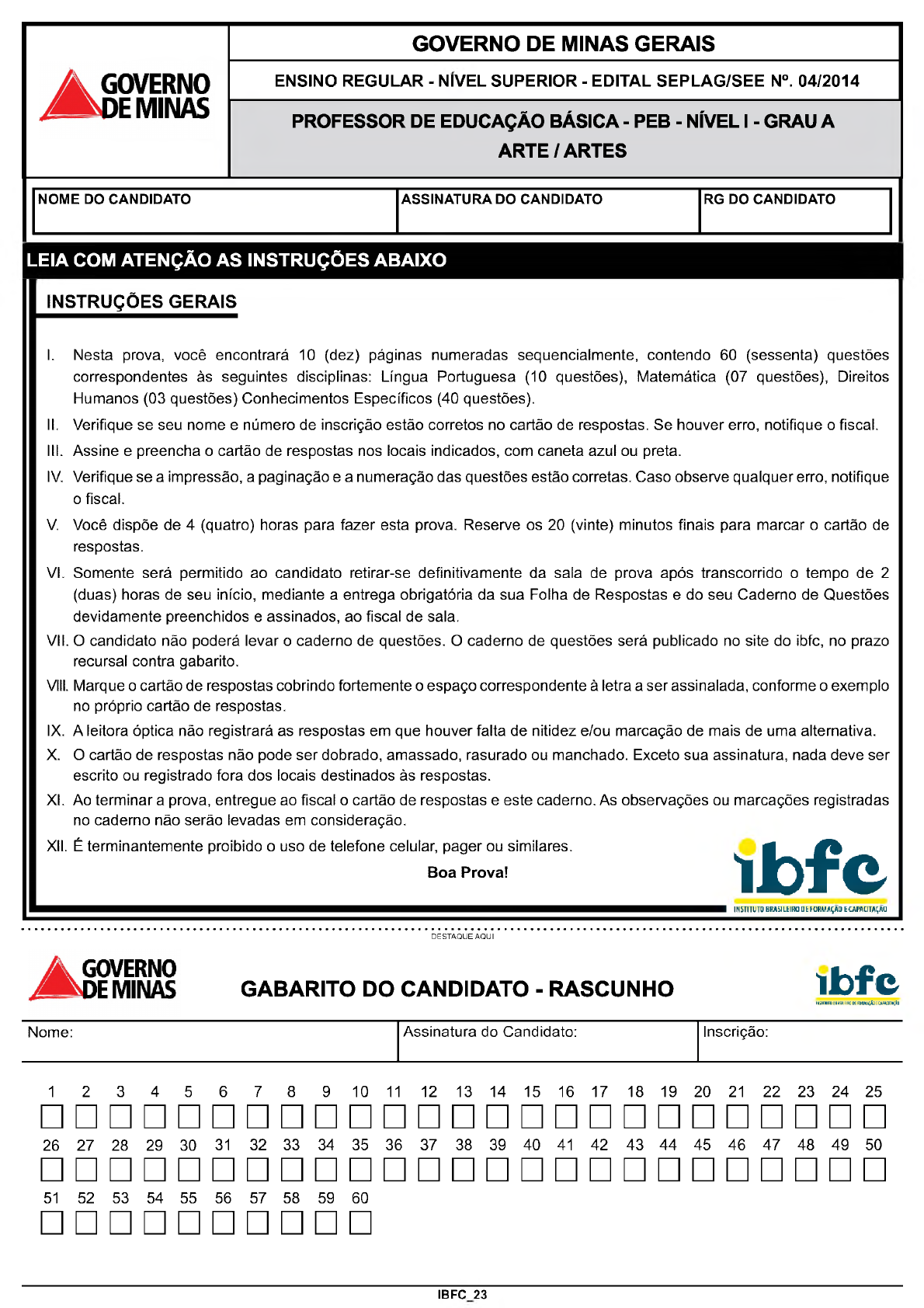 GOVERNO DE MINAS GERAIS ENSINO REGULAR - NIVEL SUPERIOR - EDITAL SEPLAG/SEE N°. 04/2014 PROFESSOR DE EDUCAÇÃO BÁSICA - PEB - NÍVEL I - GRAU A ARTE/ARTES NOME DO CANDIDATO ASSINATURA DO CANDIDATO RG DO CANDIDATO LEIA COM ATENÇÃO AS INSTRUÇÕES ABAIXO INSTRUÇÕES GERAIS I. Nesta prova, você encontrará 10 (dez) páginas numeradas sequencialmente, contendo 60 (sessenta) questões correspondentes às seguintes disciplinas: Língua Portuguesa (10 questões), Matemática (07 questões), Direitos Humanos (03 questões) Conhecimentos Específicos (40 questões). II. Verifique se seu nome e número de inscrição estão corretos no cartão de respostas. Se houver erro, notifique o fiscal. III. Assine e preencha o cartão de respostas nos locais indicados, com caneta azul ou preta. IV. Verifique se a impressão, a paginação e a numeração das questões estão corretas. Caso observe qualquer erro, notifique o fiscal. V. Você dispõe de 4 (quatro) horas para fazer esta prova. Reserve os 20 (vinte) minutos finais para marcar o cartão de respostas. VI. Somente será permitido ao candidato retirar-se definitivamente da sala de prova após transcorrido o tempo de 2 (duas) horas de seu início, mediante a entrega obrigatória da sua Folha de Respostas e do seu Caderno de Questões devidamente preenchidos e assinados, ao fiscal de sala. VII. O candidato não poderá levar o caderno de questões. O caderno de questões será publicado no site do ibfc, no prazo recursal contra gabarito. VIII. Marque o cartão de respostas cobrindo fortemente o espaço correspondente à letra a ser assinalada, conforme o exemplo no próprio cartão de respostas. IX. A leitora óptica não registrará as respostas em que houver falta de nitidez e/ou marcação de mais de uma alternativa. X. O cartão de respostas não pode ser dobrado, amassado, rasurado ou manchado. Exceto sua assinatura, nada deve ser escrito ou registrado fora dos locais destinados às respostas. XI. Ao terminar a prova, entregue ao fiscal o cartão de respostas e este caderno. As observações ou marcações registradas no caderno não serão levadas em consideração. XII. É terminantemente proibido o uso de telefone celular, pager ou similares. Boa Prova! ibfc INSTITUTO BRASILEIRO DE FQRMAÇAQ E CAPACITAÇAQ DESTAQUE AQUI GABARITO DO CANDIDATO - RASCUNHO ibfc INSTITUTO BRASILEIRO IX FORMAÇÃO E CAPACITAÇÃO Nome: Assinatura do Candidato: Inscrição: 1 2 3 4 5 6 7 8 9 10 11 12 13 14 15 16 17 18 19 20 21 22 23 24 25□ □ □ □ □ □ □ □ □ □ □ □ □ □ □ □ □ □ □ □ □ □ □ □ D 26 27 28 29 30 31 32 33 34 35 36 37 38 39 40 41 42 43 44 45 46 47 48 49 50□ □ □ □ □ □ □ □ □ □ □ □ □ □ □ □ □ □ □ □ □ □ □ □ D 51 52 53 54 55 56 57 58 59 60 □ □ □ □ □ □ □ □ □ □ IBFC 23 RASCUNHO PORTUGUÊS Texto I Ler devia ser proibido A pensar fundo na questão, eu diria que ler devia ser proibido. Afinal de contas, ler faz muito mal às pessoas: acorda os homens para realidades impossíveis, tornando-os incapazes de suportar o mundo insosso e ordinário em que vivem. A leitura induz à loucura, desloca o homem do humilde lugar que lhe fora destinado no corpo social. Não me deixam mentir os exemplos de Don Quixote e Madame Bovary. O primeiro, coitado, de tanto ler aventuras de cavalheiros que jamais existiram meteu- se pelo mundo afora, a crer-se capaz de reformar o mundo, quilha de ossos que mal sustinha a si e ao pobre Rocinante. Quanto à pobre Emma Bovary, tornou-se esposa inútil para fofocas e bordados, perdendo-se em delírios sobre bailes e amores cortesãos. Ler realmente não faz bem. A criança que lê pode se tornar um adulto perigoso, inconformado com os problemas do mundo, induzido a crer que tudo pode ser de outra forma. Afinal de contas, a leitura desenvolve um poder incontrolável. Liberta o homem excessivamente. Sem a leitura, ele morreria feliz, ignorante dos grilhões que o encerram. Sem a leitura, ainda, estaria mais afeito à realidade quotidiana, se dedicaria ao trabalho com afinco, sem procurar enriquecê-la com cabriolas da imaginação. Sem ler, o homem jamais saberia a extensão do prazer. Não experimentaria nunca o sumo Bem de Aristóteles: O conhecer. Mas para que conhecer se, na maior parte dos casos, o que necessita é apenas executar ordens? Se o que deve, enfim, é fazer o que dele esperam e nada mais? Ler pode provocar o inesperado. Pode fazer com que o homem crie atalhos para caminhos que devem, necessariamente, ser longos. Ler pode gerara invenção. Pode estimular a imaginação de forma a levar o ser humano além do que lhe é devido. Além disso, os livros estimulam o sonho, a imaginação, a fantasia. Nos transportam a paraísos misteriosos, nos fazem enxergar unicórnios azuis e palácios de cristal. Nos fazem acreditar que a vida é mais do que um punhado de pó em movimento. Que há algo a descobrir. Há horizontes para além das montanhas, há, estrelas por trás das nuvens. Estrelas jamais percebidas. É preciso desconfiar desse pendor para o absurdo que nos impede de aceitar nossas realidades cruas. Não, não deem mais livros às escolas. Pais, não leiam para os seus filhos, pode levá-los a desenvolver esse gosto pela aventura e pela descoberta que fez do homem um animal diferente. Antes estivesse ainda a passear de quatro patas, sem noção de progresso e civilização, mas tampouco sem conhecer guerras, destruição, violência. Professores, não contem histórias, pode estimular uma curiosidade indesejável em seres que a vida destinou para a repetição e para o trabalho duro. Ler pode ser um problema, pode gerar seres humanos conscientes demais dos seus direitos políticos em um mundo administrado, onde ser livre não passa de uma ficção sem nenhuma verossimilhança. Seria impossível controlar e organizar a sociedade se todos os seres humanos soubessem o que desejam. Se todos se pusessem a articular bem sua