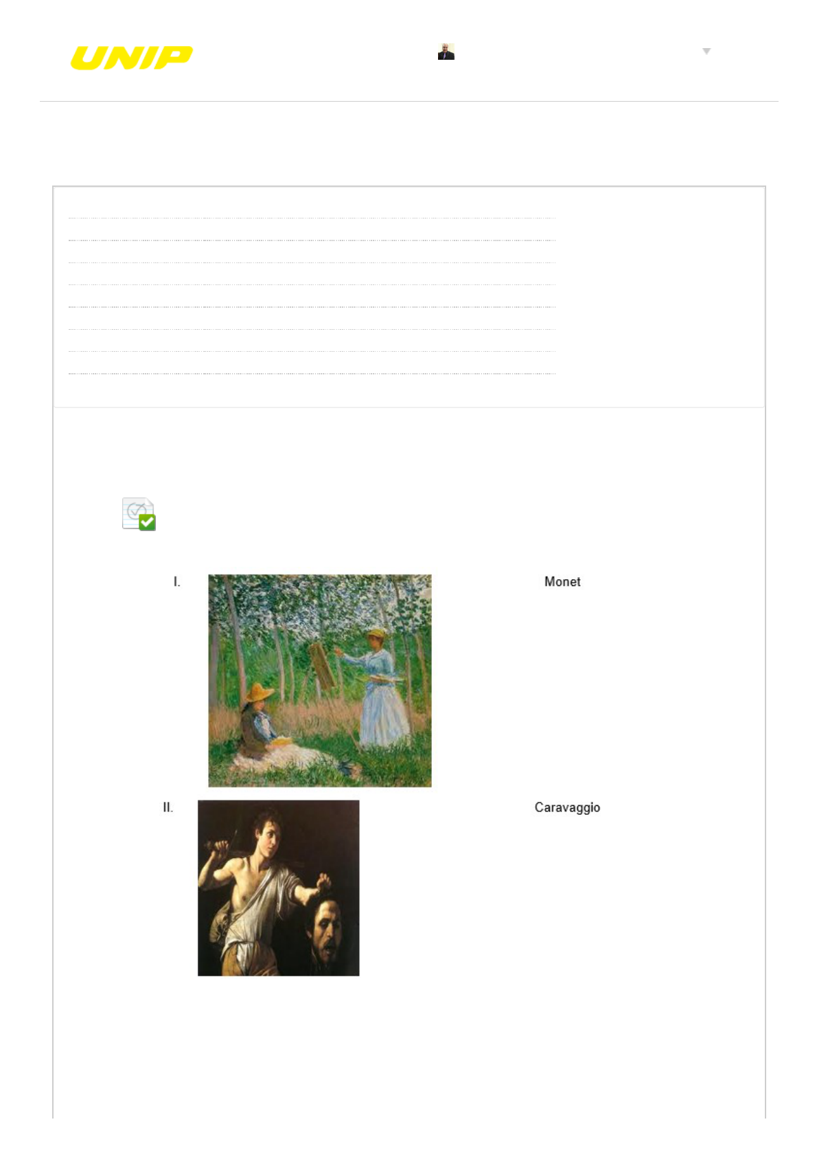 31/03/2019 Revisar envio do teste: AVALIAÇÃO - TI I – 6581-05_... https://ava.ead.unip.br/webapps/assessment/review/review.jsp?attempt_id=_15735578_1&course_id=_38274_1&content_id=_603683_1&return_… 1/6 Revisar envio do teste: AVALIAÇÃO - TI I ESTUDOS DISCIPLINARES V 6581-05_SEI_HS_0718_R_20191 CONTEÚDO Usuário rogerio.costa11 @unipinterativa.edu.br Curso ESTUDOS DISCIPLINARES V Teste AVALIAÇÃO - TI I Iniciado 31/03/19 12:26 Enviado 31/03/19 12:39 Status Completada Resultado da tentativa 10 em 10 pontos Tempo decorrido 13 minutos Resultados exibidos Respostas enviadas, Perguntas respondidas incorretamente Pergunta 1 O texto da pintura é formado tanto pelo plano do conteúdo, quanto pelo plano da expressão. Quanto ao plano da expressão, a pintura pode ser constituída pictórica ou linear. Indique a obra que seja linear, ou seja, construída por linhas. UNIP EAD BIBLIOTECAS MURAL DO ALUNO TUTORIAISCONTEÚDOS ACADÊMICOS 1 em 1 pontos rogerio.costa11 @unipinterativa.edu.br 1 31/03/2019 Revisar envio do teste: AVALIAÇÃO - TI I – 6581-05_... https://ava.ead.unip.br/webapps/assessment/review/review.jsp?attempt_id=_15735578_1&course_id=_38274_1&content_id=_603683_1&return_… 2/6 Resposta Selecionada: b. São lineares apenas as pinturas: IV. Pergunta 2 1 em 1 pontos 31/03/2019 Revisar envio do teste: AVALIAÇÃO - TI I – 6581-05_... https://ava.ead.unip.br/webapps/assessment/review/review.jsp?attempt_id=_15735578_1&course_id=_38274_1&content_id=_603683_1&return_… 3/6 Resposta Selecionada: a. Observe as tirinhas e indique a alternativa falsa . As tirinhas são textos sincréticos, unidimensionais. Pergunta 3 Resposta Selecionada: a. Tendo por base o texto não verbal: I - Existe a relação entre conteúdo e expressão. II - É mais relevante o entendimento do conteúdo. III - É mais relevante o entendimento da expressão. I está correta. Pergunta 4 Leia a tirinha: Sobre a tirinha, considere as a�rmações que seguem. I - A palavra e a imagem se complementam. II - O humor no último quadro é entendido pela interação entre o verbal e a imagem. III - A imagem supera em entendimento. IV - A forma animal – coruja – não pode ser substituída por outro bicho para não corromper o sentido do texto. 1 em 1 pontos 1 em 1 pontos 31/03/2019 Revisar envio do teste: AVALIAÇÃO - TI I – 6581-05_... https://ava.ead.unip.br/webapps/assessment/review/review.jsp?attempt_id=_15735578_1&course_id=_38274_1&content_id=_603683_1&return_… 4/6 Resposta Selecionada: c. V - A tirinha é um texto sincrético. Está correto o que se a�rma apenas em: I, II, IV e V. Pergunta 5 Resposta Selecionada: b. Na análise dos dois textos, conclui-se que: Houve mudanças no status da imagem, tornando-a complementar ao verbal. Pergunta 6 A leitura hipertextual ou digital é a realidade dos leitores contemporâneos e, no caso dos jovens que nasceram na era digital, forma os "nativos digitais". Nesse contexto 1 em 1 pontos 1 em 1 pontos 31/03/2019 Revisar envio do teste: AVALIAÇÃO - TI I – 6581-05_... https://ava.ead.unip.br/webapps/assessment/review/review.jsp?attempt_id=_15735578_1&course_id=_38274_1&content_id=_603683_1&return_… 5/6 Resposta Selecionada: d. atual, consideram-se: I - O hipertexto constitui-se em uma escrita não sequencial e não linear, que permite ao internauta acessar outros textos, por links que o fazem interagir com outras mensagens, em um novo espaço – o ciberespaço. II - Outras linguagens ou outras formas de usar as linguagens que já existem caracterizam esse tempo como um tempo de informação rápida, que abre uma enorme gama de possibilidades, novos contatos e relacionamentos. III - O blog – forma contraída de weblog – é uma versão eletrônica dos antigos diários pessoais. Por ser registro de caráter íntimo, existe restrição de acesso dos leitores. I e II estão corretas. Pergunta 7 Resposta Selecionada: e. O termo hipertexto designa um processo de escrita/leitura não linear e não hierarquizada que permite o acesso ilimitado a outros textos de forma instantânea. A leitura hipertextual traz novas concepções de texto e leitor. Com base nessa a�rmação, qual a�rmação não condiz com essa nova realidade? O leitor percorre vários links, em construção textual, de forma linear. Pergunta 8 Resposta Selecionada: c. Sobre o texto de uma planta de prédio residencial, pode-se a�rmar: A verticalidade, marcada pelos andares, constitui-se de espaço privado. 1 em 1 pontos 1 em 1 pontos 31/03/2019 Revisar envio do teste: AVALIAÇÃO - TI I – 6581-05_... https://ava.ead.unip.br/webapps/assessment/review/review.jsp?attempt_id=_15735578_1&course_id=_38274_1&content_id=_603683_1&return_… 6/6 Domingo, 31 de Março de 2019 12h39min58s BRT Pergunta 9 Resposta Selecionada: a. A linguagem não verbal consiste em sistema único, sem relação com a língua nem com junção de sistemas. Assim, qual texto a seguir é formado por sistema não verbal? Pergunta 10 Resposta Selecionada: c. Leia o texto: Entre os elementos da linguagem, temos: Linguagem não verbal que forma movimento, per�l de rosto com um leve sorriso, �ores e folhas desabrochadas. ← OK 1 em 1 pontos 1 em 1 pontos