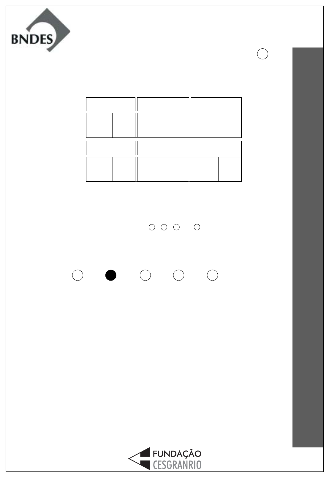 1TÉCNICO ADMINISTRATIVO PROVA 1 TTTTT ÉÉÉÉÉ CCCCC NNNNN IIIII CCCCC OOOOO AAAAA DDDDD MMMMM IIIII NNNNN IIIII SSSSS TTTTT RRRRR AAAAA TTTTT IIIII VVVVV OOOOO BANCO NACIONAL DE DESENVOLVIMENTO ECONÔMICO E SOCIAL - BNDES LEIA ATENTAMENTE AS INSTRUÇÕES ABAIXO. 01 - Você recebeu do fiscal o seguinte material: a) este caderno, com as 60 questões das Provas Objetivas, sem repetição ou falha, assim distribuídas: b) 1 Cartão-Resposta destinado às respostas às questões objetivas formuladas nas provas. 02 - Verifique se este material está em ordem e se o seu nome e número de inscrição conferem com os que aparecem no CARTÃO. Caso contrário, notifique IMEDIATAMENTE o fiscal. 03 - Após a conferência, o candidato deverá assinar no espaço próprio do CARTÃO, preferivelmente a caneta esferográfica de tinta na cor preta. No CARTÃO-RESPOSTA, o candidato deverá assinalar também, no espaço próprio, o gabarito correspondente às suas provas: 1 , 2 , 3 ou 4 . Se assinalar um gabarito que não corresponda ao de sua prova ou deixar de assinalá-lo, será eliminado. 04 - No CARTÃO-RESPOSTA, a marcação das letras correspondentes às respostas certas deve ser feita cobrindo a letra e preenchendo todo o espaço compreendido pelos círculos, a lápis preto nº 2 ou caneta esferográfica de tinta na cor preta, com um traço contínuo e denso. A LEITORA ÓTICA é sensível a marcas escuras; portanto, preencha os campos de marcação completamente, sem deixar claros. Exemplo: A B C D E 05 - Tenha muito cuidado com o CARTÃO, para não o DOBRAR, AMASSAR ou MANCHAR. O CARTÃO SOMENTE poderá ser substituído caso esteja danificado em suas margens superior ou inferior - BARRA DE RECONHECIMENTO PARA LEITURA ÓTICA. 06 - Para cada uma das questões objetivas, são apresentadas 5 alternativas classificadas com as letras (A), (B), (C), (D) e (E); só uma responde adequadamente ao quesito proposto. Você só deve assinalar UMA RESPOSTA: a marcação em mais de uma alternativa anula a questão, MESMO QUE UMA DAS RESPOSTAS ESTEJA CORRETA. 07 - As questões objetivas são identificadas pelo número que se situa acima de seu enunciado. 08 - SERÁ ELIMINADO da Seleção Pública o candidato que: a) se utilizar, durante a realização das provas, de máquinas e/ou relógios de calcular, bem como de rádios gravadores, headphones, telefones celulares ou fontes de consulta de qualquer espécie; b) se ausentar da sala em que se realizam as provas levando consigo o Caderno de Questões e/ou o CARTÃO- RESPOSTA. 09 - Você poderá levar o Caderno de Questões somente se permanecer dentro da sala até 30 (trinta) minutos antes do horário estabelecido para o encerramento das provas. 10 - Reserve os 30 (trinta) minutos finais para marcar seu CARTÃO-RESPOSTA. Os rascunhos e as marcações assinaladas no Caderno de Questões NÃO SERÃO LEVADOS EM CONTA. 11 - Quando terminar, entregue ao fiscal O CADERNO DE QUESTÕES, O CARTÃO-RESPOSTA E ASSINE A LISTA DE PRESENÇA. 12 - O TEMPO DISPONÍVEL PARA ESTAS PROVAS DE QUESTÕES OBJETIVAS É DE 4 (QUATRO) HORAS. O BANCO DO DESENVOLVIMENTO ABRIL 2004PROVA 1 LÍNGUA PORTUGUESA Questões 1 a 5 6 a 10 Pontos 1,5 2,5 Questões 11 a 15 16 a 20 Pontos 1,5 2,5 Pontos 1,5 2,5 Questões 21 a 25 26 a 30 MATEMÁTICA ARQUIVO EPROTOCOLO CONHECIMENTOS ESPECÍFICOS Questões 41 a 45 46 a 50 Pontos 1,0 2,0 CONHECIMENTOS GERAIS Questões 51 a 55 56 a 60 Pontos 0,5 1,5 Pontos 1,0 2,0 Questões 31 a 35 36 a 40 LÍNGUA ESTRANGEIRA 2 TÉCNICO ADMINISTRATIVOPROVA 1 R E D A Ç Ã O Caçador de mim Por tanto amor, por tanta emoção, A vida me fez assim: Doce ou atroz, manso ou feroz, Eu caçador de mim. Milton Nascimento Com base nos versos da música de Milton Nascimento, bem como nas idéias dos Textos I e II, construa um texto dissertativo, em prosa, com o mínimo de 20 e o máximo de 25 linhas, utilizando a norma culta da língua, sobre o seguinte tema: O segredo da existência humana está em saber viver. Obs: Não se esqueça de dar um título à sua redação. Faça a redação a tinta azul ou preta. R E D A Ç Ã O 3TÉCNICO ADMINISTRATIVO PROVA 1 LÍNGUA PORTUGUESA Texto I Se eu quiser falar com Deus Se eu quiser falar com Deus Tenho que ficar a sós, Tenho que apagar a luz, Tenho que calar a voz, Tenho que encontrar a paz, Tenho que folgar os nós Dos sapatos, Da gravata, Dos desejos, Dos receios, Tenho que esquecer a data, Tenho que perder a conta, Tenho que ter mãos vazias, Ter a alma e o corpo nus. Se eu quiser falar com Deus Tenho que aceitar a dor, Tenho que comer o pão Que o diabo amassou. Tenho que virar um cão, Tenho que lamber o chão Dos palácios, Dos castelos suntuosos Do meu sonho, Tenho que me ver tristonho Tenho que me achar medonho, E, apesar do mal tamanho, Alegrar meu coração. Se eu quiser falar com Deus Tenho que me aventurar Tenho que subir aos céus Sem cordas para segurar, Tenho que dizer adeus, Dar as costas, caminhar Decidido pela estrada Que ao findar Vai dar em nada Do que eu pensava encontrar. Gilberto Gil 2 Com relação às idéias do Texto I, é INCORRETO afirmar que o (a): (A) texto constrói-se por uma situação hipotética em relação ao momento da enunciação. (B) consecução do objeto do desejo depende do rompi- mento com a realidade exterior e a substituição de seus respectivos valores. (C) interdependência dos segmentos marca-se pelas etapas a serem vencidas numa progressão ordenada. (D) relação material-abstrato dá-se numa progressão proporcionalmente direta de valores. (E) realização do desejo está condicionada à postura do sujeito que se marca por uma trajetória progressiva e introspectiva. 3 Assinale a opção em que o comentário gramatical está correto. (A) No verso “Tenho que ficar a sós,” (l. 2), a expressão a sós equivale, semântica e gramaticalmente, à palavra só. (B) No verso “Tenho que apagar a luz,” (l. 3), gramati- calmente, o vocábulo em destaque classifica-se como conjunção subordin