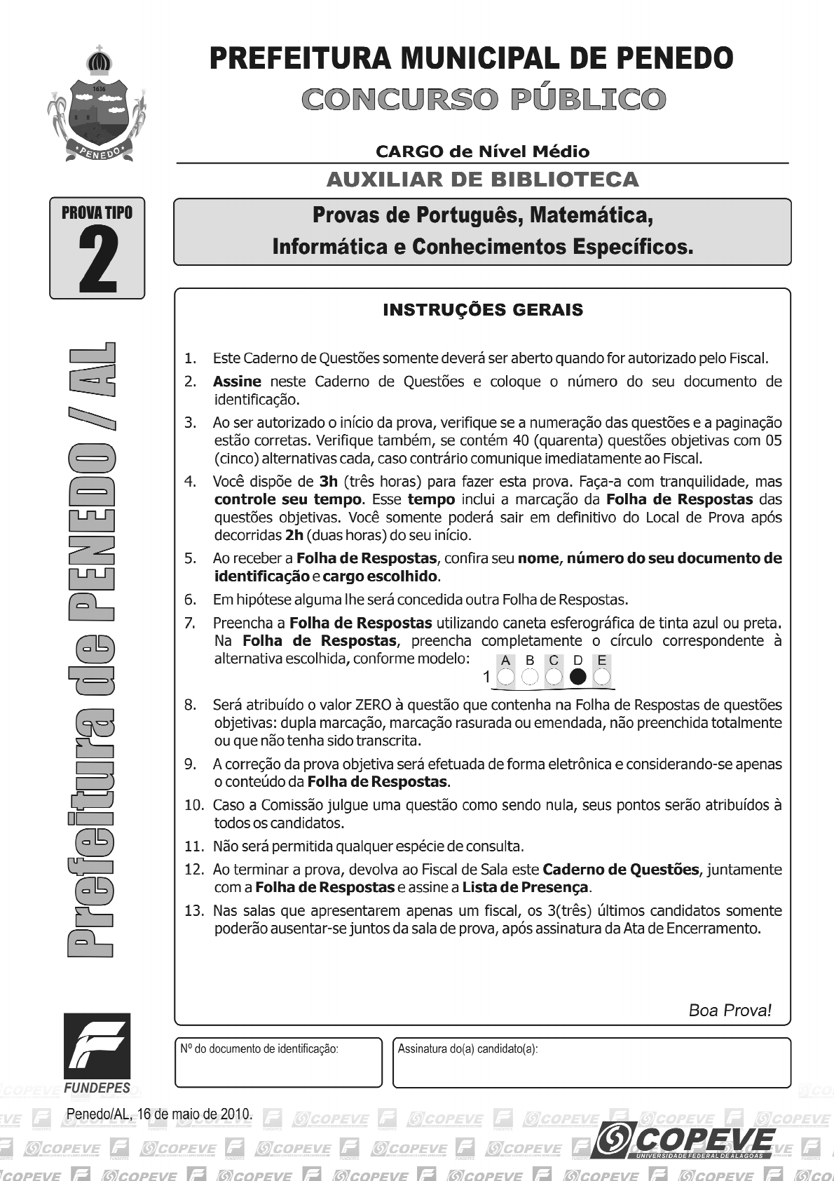 Prefeitura Municipal de Penedo Prova tipo 2 16 - MAI - 2010 Nível Médio – AUXILIAR DE BIBLIOTECA 1 PORTUGUÊS 1.1.1.1. No período “Desde que alcançou o topo das vendas globais, a Toyota registrou uma série de recalls decorrentes de defeitos de fabricação.”, as expressões em negrito são, respectivamente, A) adjunto adnominal – complemento nominal. B) complemento nominal – complemento nominal. C) adjunto adnominal – adjunto adnominal. D) objeto indireto – objeto indireto. E) objeto indireto – complemento nominal. 2.2.2.2. Quais os números entre parênteses que ocupam uma vírgula pontuando adequadamente o texto abaixo, de acordo com a norma-padrão da língua portuguesa? “A extensão da frase foi (1) durante muito tempo (2) característica exclusiva da poesia (3) mas o que distingue o verso da prosa (4) vai além da disposição gráfica.” A) 1 – 2 – 3 – 4 B) 3 – 4 C) 2 – 3 – 4 D) 1 – 2 – 3 E) 2 – 3 3.3.3.3. Em qual opção o conetivo foi empregado adequadamente, de acordo com a norma-padrão da língua portuguesa? A) “Até a pesquisa mais brilhante está condicionada às ferramentas que se dispõe em cada momento.” B) “O primeiro avanço tecnológico é a cápsula pressurizada atrelada a um balão de hélio a que ele será levado até a estratosfera.” C) Extremamente triste com a condição que se encontra, ele passa a se culpar [...] D) De repente, é a solução que todos gostariam. E) “Ninguém discorda de que é imperativo para o país ampliar o acesso ao ensino superior, em que somente ingressa hoje um de cada quatro jovens.” 4.4.4.4. A palavra se, no período abaixo, é, respectivamente, “A prancha desliga-se automaticamente se alguém toca no equipamento ou se ele entra em contato com outro metal.” A) objeto direto, conjunção subordinativa, conjunção subordinativa. B) partícula apassivadora, conjunção subordinativa, partícula de reciprocidade. C) partícula expletiva, partícula de indeterminação do sujeito, partícula apassivadora. D) partícula integrante do verbo, partícula de indeterminação do sujeito, conjunção subordinativa. E) objeto direto, conjunção subordinativa, partícula de indeterminação do sujeito. 5.5.5.5. Em qual opção o pronome oblíquo não viola a norma-padrão da língua portuguesa? A) “Eles lhe haviam contado que o Congresso é uma mamata.” B) “Não ficarão órfãs porque deixei-as já adultas.” C) “Quando transferiu-se para Maceió, tudo foi resolvido.” D) “Havia formado-se em Engenharia, mas não exercia a profissão.” E) “Nem tudo perdeu-se naquela terrível noite chuvosa.” As questões de 6 a 8 referem-se ao texto seguinte. “Viver e não ter a vergonha de ser feliz cantar e cantar e cantar a beleza de ser um eterno aprendiz eu sei que a vida devia ser bem melhor e será mas isso não impede que eu repita É bonita, é bonita e é bonita” [...] (Gonzaguinha) 6.6.6.6. No último verso “É bonita, é bonita e é bonita”, o poeta reitera essa caracterização porque A) há beleza em ser um eterno aprendiz. B) é preciso cantar e cantar. C) necessita repetir. D) a vida é bonita, e será bem melhor. E) tem certeza de que a vida é bem melhor. 7.7.7.7. Considerando-se o aspecto da estrutura sintática, o verso “a beleza de ser um eterno aprendiz” A) provoca um sentido de oposição ao verso anterior. B) é apenas uma soma de ações com relação aos versos anteriores. C) complementa o verso anterior. D) é a finalidade do que está expresso no verso posterior. E) é referência sutil ao objetivo expresso nos versos anteriores. 8.8.8.8. Por ser um texto contemporâneo, o autor suprimiu a pontuação. Mas é possível utilizá-la. Em qual das opções o uso dos sinais de pontuação ficou gramaticalmente incorreto? A) cantar, e cantar, e cantar. B) Eu sei, C) Mas isso não impede que eu repita: D) e será. E) e não ter a vergonha de ser feliz. Prefeitura Municipal de Penedo Prova tipo 2 16 - MAI - 2010 Nível Médio – AUXILIAR DE BIBLIOTECA 2 As questões 9 e 10 referem-se ao texto seguinte. “Um dos complexos estuarinos mais importantes do país está morrendo. Em parte das lagoas já não se encontram mais as grandes e suculentas ostras, os siris tradicionais por seu coral e também o caranguejo. Sem falar na ausência que mais atinge os pescadores, a dos próprios peixes. Eles afirmam que existem mais pescadores do que peixe para ser pescado. No trecho da Mundaú, que vai do cais da lancha no dique estrada até ao papódromo, não existe quase mais vida lacunar. É só lixo, e lixo, e lixo. E os peixes que ainda sobrevivem não são bons para o consumo” (O Jornal, 28/02/2010). 9.9.9.9. Considerando-se o contexto, é correto afirmar: A) como não há mais siris, peixes, ostras e caranguejos, as lagoas certamente estão mortas. B) o grande número de pescadores tem provocado a morte das lagoas. C) parte das lagoas já está morta, pois não há mais siris, ostras e caranguejos. D) o trecho da Mundaú, que vai até ao papódromo, está completamente morto. E) segundo a reportagem, também não há mais peixes nas lagoas. 10.10.10.10. Considerando-se aspectos da norma-padrão da língua portuguesa, a oração “Eles afirmam que existem mais pescadores do que peixe” aceita a seguinte reescrita: A) Eles afirmam: há mais pescadores do que peixe. B) Eles afirmam que devem haver mais pescadores do que peixe. C) Eles afirmam: existe mais pescadores do que peixe. D) Eles afirmam que deve existir mais pescadores do que peixe. E) Afirmam eles, que existem mais pescadores do que peixe. Prefeitura Municipal de Penedo Prova tipo 2 16 - MAI - 2010 Nível Médio – AUXILIAR DE BIBLIOTECA 3 MATEMÁTICA 11.11.11.11. Na figura abaixo, r//s, s//t e as retas m e n são retas transversais às retas r, s e t. Se 52 −= xAB , 10=BC , 5+= xDE e 8=EF , então: A) x é múltiplo de 7. B) o valor de x é 16. C) x é divisível por 6. D) x é maior que 50. E) o t