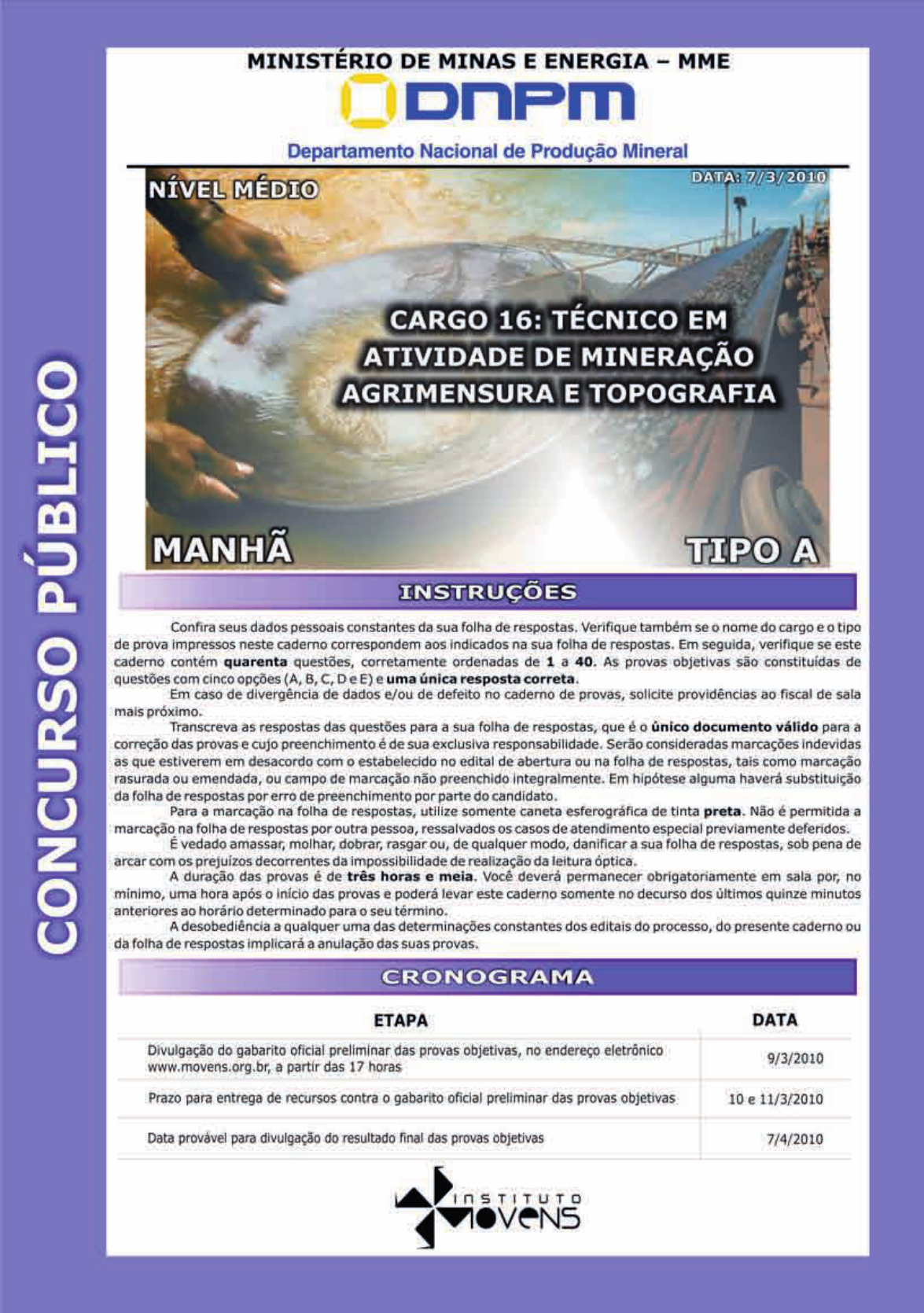 Concurso Público do DNPM/2010 2 CARGO 16: TÉCNICO EM ATIVIDADE DE MINERAÇÃO AGRIMENSURA E TOPOGRAFIA – TIPO A U t i l i z e e s t e e s p a ç o p a r a r a s c u n h o . 3 CARGO 16: TÉCNICO EM ATIVIDADE DE MINERAÇÃO AGRIMENSURA E TOPOGRAFIA – TIPO A Concurso Público do DNPM/2010 CONHECIMENTOS BÁSICOS Leia o texto abaixo para responder às questões de 1 a 4. Depois dos ataques praticados na véspera de Natal pelos “maroons” (como são chamados os descendentes de escravos que vivem no Suriname), será difícil manter uma relação de cordialidade entre os surinameses e os brasileiros que trabalham como garimpeiros naquele país. A avaliação é da pesquisadora da Universidade Federal do Rio de Janeiro – UFRJ, Maria Célia Coelho. Ela lembrou que já havia um ressentimento da população nativa com os brasileiros. “Acho que o fato de os brasileiros darem 10% do que garimpam aos nativos não é suficiente para manter uma relação de cordialidade. Porque a disputa dos negros da região é pelo acesso à riqueza do garimpo, e só aqueles 10% do lucro não satisfazem. Com isso, a atrição permanece”. A pesquisadora ressaltou que a presença dos garimpeiros no Suriname é uma questão complicada para os governantes brasileiros, já que eles estão lá ilegalmente. “Deve-se retirar a população de lá, até para evitar problemas com o Suriname, e dar assistência às mulheres que foram estupradas. O Brasil não pode fazer mais do que isso, já que se trata de uma atividade que é ilegal”. A professora, que pesquisou a imigração de brasileiros no Suriname, disse que os estudos mostram que há muitos imigrantes envolvidos em uma rede de prostituição local, financiada pelo garimpo. Agência Brasil. Internet: http://www.americaeconomia.com.br. Acesso em 6/1/2010 (com adaptações). Questão 1 A respeito das ideias do texto, assinale a opção correta. (A) A presença dos garimpeiros brasileiros no Suriname é uma questão complicada pelo fato de a população nativa exigir 10% de tudo que é garimpado. (B) Antes dos ataques da véspera de Natal, já havia ressentimento entre os nativos e os garimpeiros brasileiros pelo acesso à riqueza do garimpo. (C) De acordo com a pesquisadora da UFRJ, será difícil estabelecer uma relação cordial entre garimpeiros surinameses e brasileiros. (D) Os ataques dos maroons a garimpeiros brasileiros foram motivados pela exigência de um aumento de 10% na porcentagem do produto do garimpo destinada aos nativos. (E) Pelo fato de os garimpeiros brasileiros estarem no Suriname ilegalmente, o governo brasileiro nada pode fazer por eles. Questão 2 Acerca de aspectos linguísticos do texto, assinale a opção correta. (A) As aspas na linha 2 e nas linhas 9, 14, 18 e 21 têm a mesma finalidade. (B) O pronome “eles” (linha 17) refere-se a “governantes brasileiros”. (C) Os termos “havia” (linha 8) e “há” (linha 23) podem ser substituídos por existia e existe, respectivamente, sem acarretar erro gramatical. (D) A substituição de “satisfazem” (linha 13) por satisfaz acarretaria erro gramatical, pois o verbo, nesse caso, só pode ocorrer no plural. (E) Poderia ser colocada uma vírgula após “brasileiros” (linha 4) sem acarretar mudança de sentido do texto. Questão 3 Na linha 13, a palavra “atrição” está empregada com o sentido de (A) aflição. (B) desgaste. (C) fricção. (D) violência. (E) relação. Questão 4 As opções a seguir apresentam trechos textuais. Assinale aquela em que a tipologia é semelhante à do texto referente às questões de 1 a 4. (A) Ao todo, 62 equipes de resgate estrangeiras ainda trabalham para encontrar sobreviventes na capital haitiana, onde 133 pessoas já foram salvas dos escombros do terremoto. (B) Em uma panela junte o leite, a margarina e misture. Leve ao fogo baixo, mexendo por 2 minutos. Em seguida, acrescente o refresco em pó e misture bem. Deixe mais 1 minuto. Retire, deixe esfriar e enrole. Coloque em forminhas de papel. (C) Quando solicitar serviço pós-venda, levar a câmera ao centro de atendimento e informar ao técnico responsável as características de seu mau funcionamento. (D) Imenso trabalho nos custa a flor. Por menos de oito contos vendê-la? Nunca. Primavera não há mais doce, rosa tão meiga onde abrirá? Não, cavalheiros, sede permeáveis. (E) Compre hoje e ganhe 50% de desconto na sua próxima compra. Faça seu cadastro agora! Essa promoção é válida até acabarem os estoques. Questão 5 Assinale a opção que NÃO apresenta erro gramatical. (A) A história que vou contar não tem à rigor um princípio, um meio e um fim. O tempo é um rio sem nascentes à correr incessantemente para a eternidade. (B) O homem lançou-me um olhar enviezado, misto de estranhesa e alarma. Hora, estou habituado a ser olhado desse modo. (C) Naquele dia de abril andava eu pelas ruas numa espécie de sonambulismo, com a impressão que o outono era uma opala dentro da qual estava imbutida a minha cidade. (D) Devo confessar que não gostava da minha profissão e que, se não abandonava-a, era por que não saberia fazer outra coisa para ganhar a vida, pois, repugnava- me à ideia de tocar músicas vulgares nessas casas públicas onde se dança, come e bebe a noite. (E) A luz do lampião batia em cheio no rosto de Adriana. E quando ela me viu com seus olhos de um verde úmido de alga, o escafandrista finalmente compreendeu por que havia descido às profundezas do mar. (Opções adaptadas de Érico Veríssimo. Fantoches e outros contos. 13. ed. São Paulo: Globo, 1996.) 1 5 10 15 20 25 Concurso Público do DNPM/2010 4 CARGO 16: TÉCNICO EM ATIVIDADE DE MINERAÇÃO AGRIMENSURA E TOPOGRAFIA – TIPO A Leia o texto abaixo para responder às questões 6 e 7. Aos sete anos, projetava que minha vida estaria resolvida aos 37. Administraria somente a felicidade. Dei o prazo de três décadas para não me preocupar. Talvez o paraíso naquela época fosse cabular temas, não ir 