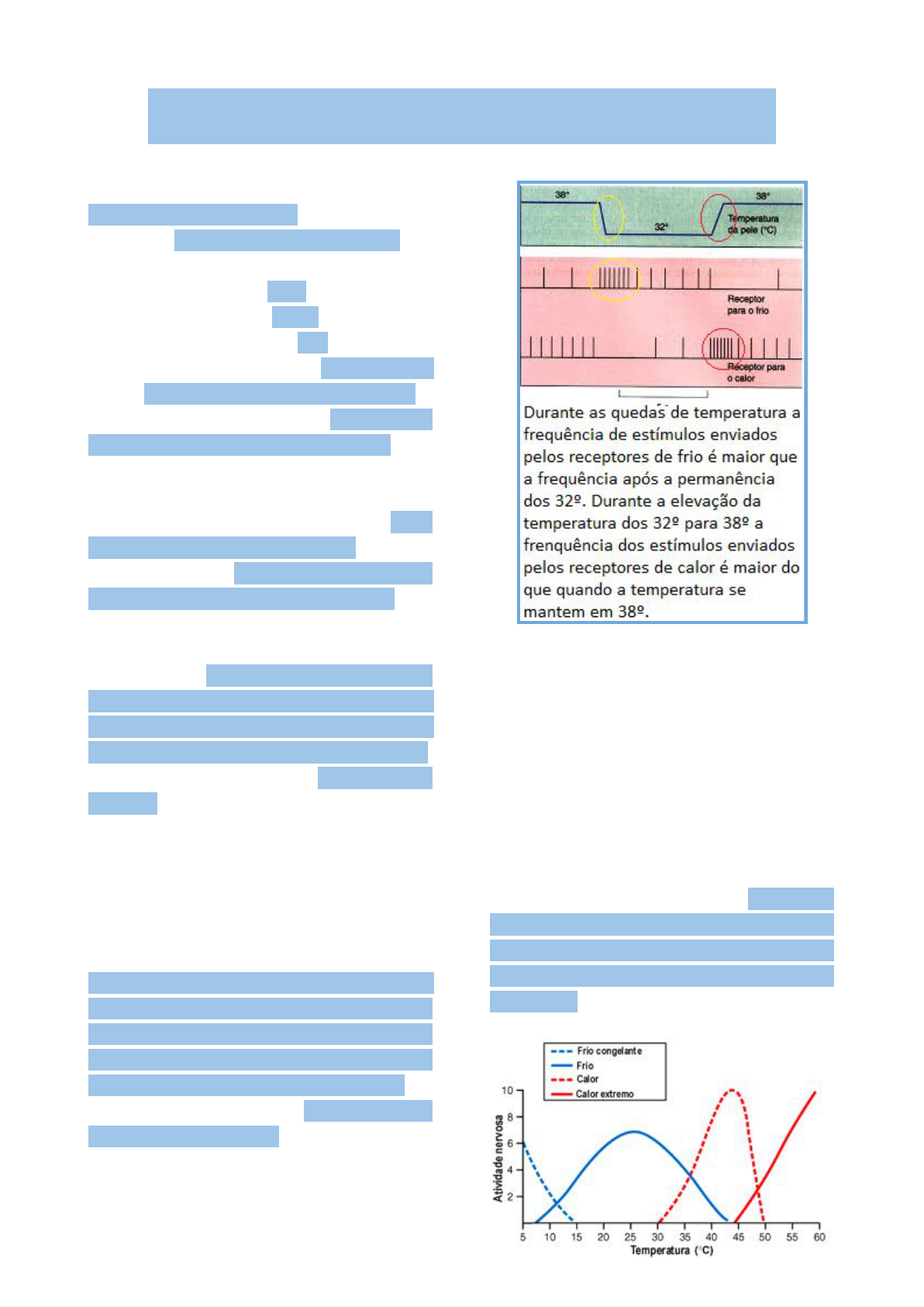 Termorrecepção e termorregulação A TERMORRECEPÇÃO se dá pela captação de estímulos sensoriais na pele por TRÊS TIPOS DIFERENTES DE RECEPTORES: - Receptores de Frio - Receptores de Calor - Receptores de dor, os quais geram potencial apenas em casos de calor ou frio extremos. Esses receptores estão distribuídos abaixo da pele de todo o corpo, em mais quantidade em algumas áreas do que outras. O corpo dos animais é mais consciente e sensível ao frio que ao calor devido ao número de receptores de frio que é de 3 a 10 vezes maior que os de calor. Os potenciais gerados por ambos os receptores são mais frequentes durante mudanças de temperatura (esfriando ou esquentando) do que quando permanece uma faixa de temperatura, são receptores de ADAPTAÇÃO RÁPIDA, assim se você sai de um lugar quente e entra em uma sala com ar-condicionado, por exemplo, inicialmente você sentirá que está mais frio do que quando seu corpo se acostuma com a temperatura, ou seja, quando você entra na sala, seus receptores de frio mandam estímulos com maior frequência mas na medida em que se adaptam a temperatura os estímulos têm sua frequência diminuída, porém NUNCA CESSAM, já que o corpo deve ter a consciência de que está fazendo frio. O mesmo se dá para os receptores de calor. Os receptores de dor são ativados quando a temperatura é tão baixa ou tão alta que podem gerar prejuízos para o corpo. Os receptores de frio são estimulados a partir de, aproximadamente, 7ºC até os 25ºC, os de calor são estimulados a partir dos 30ºC e atingem o máximo de sua atividade próximo aos 45ºC, antes dos 7ºC e após os 45ºC os receptores de dor são estimulados para o frio excessivo quanto para o calor excessivo. A TERMORREGULAÇÃO é controlada pelo equilíbrio entre produção e perda de calor. Todo organismo produz calor devido as reações de METABOLISMO BASAL, ATIVIDADE MUSCULAR, HORMÔNIOS DA TIREOIDE (que regulam o metabolismo basal), ESTIMULAÇÃO SIMPÁTICA E DIGESTÃO E METABOLIZAÇÃO DOS ALIMENTOS. O corpo está a todo momento produzindo calor devido às reações do metabolismo sendo que os órgãos profundos, os com maior metabolismo como coração, fígado, cérebro, músculos e etc, são os que mais produzem calor, e o órgão principal responsável pela perda de calor é a PELE e a CAVIDADE ORAL pela qual animais de pelagem densa, que não possuem uma termorregulação adequada pela pele, fazem suas trocas através do OFEGO, processo de respiração rápida e superficial no qual há perda de calor pela passagem da energia aquecendo o ar respirado principalmente nas regiões do palato e orofaringe que possuem muitos pequenos vasos sanguíneos. A termorregulação, assim como a termorrecepção, é coordenada pelo HIPOTÁLAMO, que também é o centro da fome, sede entre outros. Quando a temperatura média corporal fica abaixo ou acima do PONTO DE AJUSTE, temperatura corporal considerada normal para cada espécie, o hipotálamo ativa mecanismos de ajuste por meio de RESPOSTAS AUTÔNOMAS e também voluntárias. Mecanismos de diminuição da temperatura: Autônomos: - Vasodilatação periférica: ao dilatar os capilares da superfície aumenta a perda de calor para o ambiente. - Sudorese: o suor é composto de água e eletrólitos, só a água já possui um calor específico e latente bem altos (energia necessária para variar a temperatura em um grau e energia necessária para mudar de estado físico) os eletrólitos no suor aumentam a quantidade de energia necessária ainda mais, assim, para que o suor evapore ele rouba uma grande quantidade de energia na forma de calor da pele resfriando-o. - Diminuição do metabolismo: quanto mais ativo o metabolismo mais calor é gerado pelas reações químicas que fazem parte dele, assim para evitar a elevação da temperatura o organismo tende a diminuir o metabolismo. Voluntários: Os mecanismos de controle de temperatura voluntários são de suma importância já que sem eles apenas os autônomos podem não ser o suficiente para garantir o ajuste da temperatura média corporal, assim ambos devem ser executados em conjunto. Beber mais água e água mais fresca ou fria; busca por sombra; reduzir atividade física já que para movimentar o corpo os músculos geram energia que, em parte, é perdida na forma de calor. Formas de perda de calor superficial: - Irradiação: perda de calor na superfície através de radiação infravermelha. - Condução: trocas de energia de molécula para molécula por meio de sua agitação, ocorre em sólidos, principalmente, devido a proximidade de suas moléculas. - Convecção: trocas de energia na forma de calor a partir da movimentação de fluidos como gases e líquidos. - Evaporação: perda de calor pelo suor que já foi explicado anteriormente, através das glândulas sudoríparas, glândulas tubulares enoveladas que produzem o suor por meio da filtração do plasma sanguíneo secretando água e eletrólitos. - Sistema de contracorrente: evita a perda excessiva de energia pelo organismo “economizando calor”. Uma artéria que levaria um sangue mais quente para a superfície da pele perdendo muito calor passa próxima ou é revestida por capilares de uma veia que faz o caminho oposto trazendo sangue mais frio vinda da superfície e que chegaria nos grandes vasos tendo que ser aquecido gerando um grande gasto de energia, assim por estarem bem próximas, o calor passa da artéria para a veia, resfriando o sangue que vai para a superfície e aquecendo o sangue que volta para o coração evitando gasto de calor e energia necessária para geração de calor. Exemplo do que acontece com as patas das aves aquáticas que ficam nadando em águas muitas vezes bem geladas, ou também no que ocorre na descida do sangue para o escroto, que não pode ser da mesma temperatura corporal ou prejudicaria a produção dos espermatozoides, assim o sangue que está voltando pelo plexo pampiniforme mais frio rece