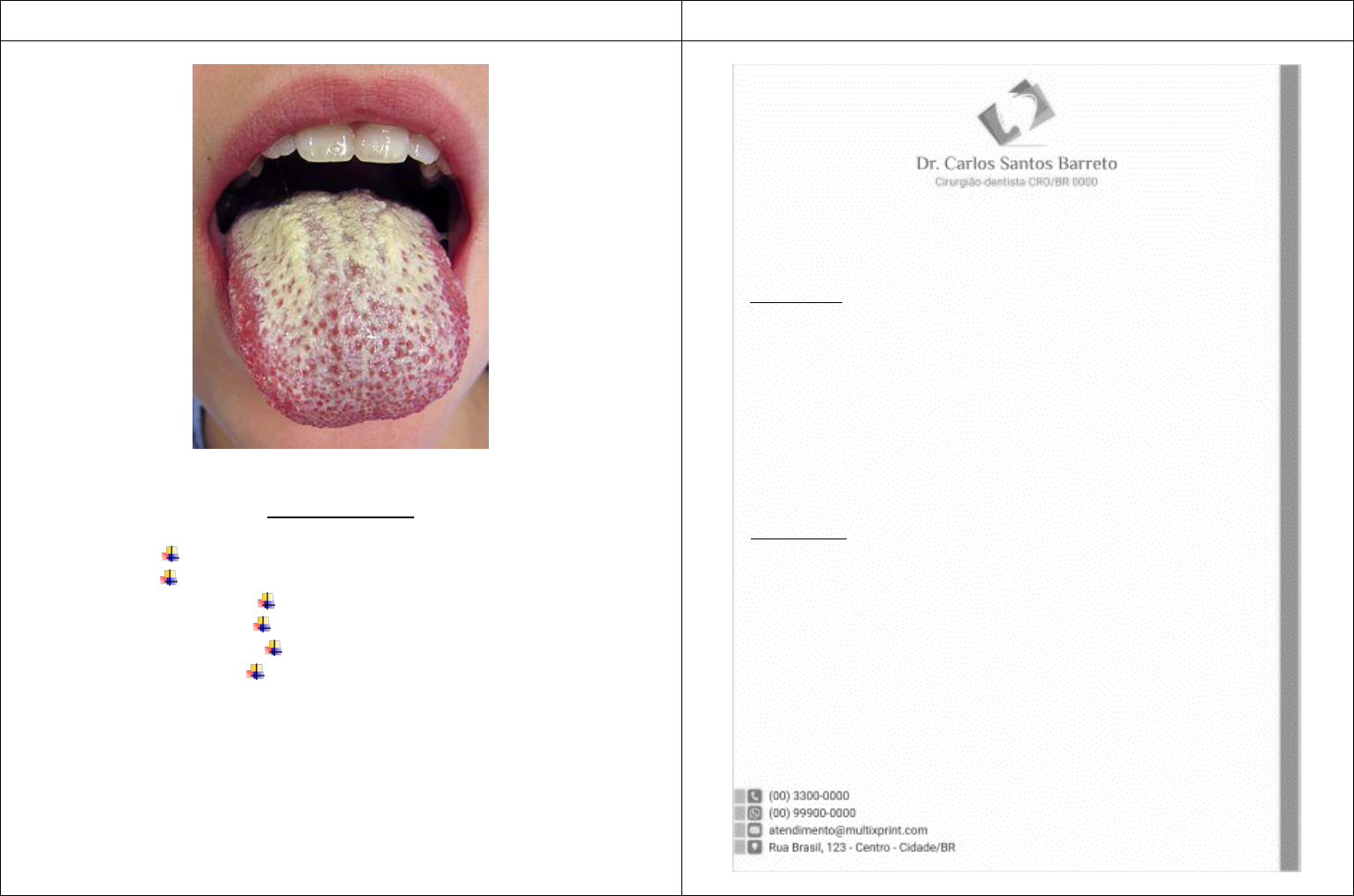 CANDIDÍASE PSEUDOMEMBRANOSA RECEITUÁRIO CARACTERÍSTICAS: Placas espessas brancas, difusas, punfiformes Localização: língua, palato mole, mucosa jugal Facilmente removido Quantidade: múltiplas Cor: esbranquiçada Superfície: lisa/cremosa Conduta: citologia esfoliativa Uso interno Nizoral (cetoconazol) 100mg ...............................28 comprimidos Tomar 1 comp. De 12/12hrs nas refeições por 4 a 8 semanas Uso externo Nistatina suspensão oral (miscotatin ................................1 vidro Bochechar 3 a 4 vezes ao dia dirante 5 minutos e cuspir. Fazer o tratamento por 15 dias e retornar para consulta. CANDIDÍASE ATRÓFICA CRÔNICA RECEITUÁRIO CARACTERÍSTICAS: Placas espessas avermelhadas Localização: palato duro, palato mole Causada por dentaduras. Quantidade: múltiplas Cor: avermelhado Superfície: lisa Conduta: coleta do material e análise laboratorial Uso externo Daktarin gel (miconazol) ......................................1 tubo Aplicar sobra a lesão 3 a 4 vezes ao dia e aplicas a casa da prótese durante 15 dias e retornar para nova consulta. HERPES LABIAL RECEITUÁRIO CARACTERÍSTICAS: Lesão fundamental: vesículas Localização: mucosa labial, gengiva Cor: levemente amarelada ou esbranquiçada Borda: contorno regular, circunscrita Superfície: lisa Tamanho: menor que 5 mm Quantidade: múltiplas Apresenta dor, dormência ou prurido Transmissão: gotículas de saliva, contato cutâneo Uso interno Aciclovir 400mg ........................................... 21/42 comprimidos Tomar via oral um comprimido de 8/8 horas por 7 a 14 dias. Uso externo Aciclovir creme ...................................................... 1 bisnaga Aplicar na lesão 3 a 4 vezes ao dia até formar crosta. GENGIVOESTOMATITE HERPETICA PRIMÁRIA RECEITUÁRIO CARACTERÍSTICAS: Lesões avermelhadas Localização: aparecimento de manchas vermelhas na superfície do palato duro, gengiva, garganta Quantidade: múltiplas Cor: avermelhada Superfície: lisa Bordas: bem definidas, extremamente dolorosa Pequenas no início, elas podem aumentar de tamanho, romper-se e ligar-se a outras formando úlceras rasas Uso interno Paracetamol solução oral ......................................... 1 frasco Tomar via oral (X) gostas por (1/kg) de 6/6 horas por até 4 dias Uso interno Paracetamol 500 mg ................................. 12 comprimidos Tomar via oral, 1 comprimido de 6/6 horas por até 3 dias. PENFIGOIDE BENIGNO DE MUCOSA RECEITUÁRIO CARACTERÍSTICAS: Bolhas que estouram e formam ulceras Lesão fundamental: ulceração Localização: gengiva Cor: avermelhada Tratamento: uso de corticoides tópico e sistêmicos Superfície: lisa Bordas: contornos regulares Uso externo Omcilon – A oral base (acetonido de triancinolon) ........1 bisnaga Aplicar 4 vezes ao dia na lesão, aplicar em moldeira de acetato à noite. Uso externo Decadron (dexametosona elixir) ....................... 1 frasco 0,1 mg/ml Bochechar 1 colher de sopa diluído em 1 colher de água, 4 vezes ao dia e cuspir. Uso externo Celestone (betametasona elixir) .................... 1 frasco 0,5 mg/ml Bochechar 1 colher de sopa diluído em 1 colher de água, 4 vezes ao dia e cuspir. LIQUEN PLANO RECEITUÁRIO CARACTERÍSTICAS: Lesão fundamental: placa Lesões quase sempre bilaterais e especulares Fina rede em forma de laço de linhas brancas, estrias esbranquiçadas Localização: mucosa jugal posterior Associação ao estresse Cor: esbranquiçada Aspecto superficial: liso Linhas: mal delimitadas Conduta: citologia esfoliativa, se não cedes a raspagem, fazer biopsia incisional Uso externo Omcilon – A oral base (acetonido de triancinolon) .........1 bisnaga Aplicar 4 vezes ao dia na lesão, aplicar em moldeira de acetato à noite. Uso externo Decadron (dexametosona elixir) ....................... 1 frasco 0,1 mg/ml Bochechar 1 colher de sopa diluído em 1 colher de água, 4 vezes ao dia e cuspir. Uso externo Celestone (betametasona elixir) ...................... 1 frasco 0,5 mg/ml Bochechar 1 colher de sopa diluído em 1 colher de água, 4 vezes ao dia e cuspir. PENFIGOIDE VULGAR RECEITUÁRIO CARACTERÍSTICAS: Localização: mucosa jugal, ventre da língua e gengiva Cor: avermelhada Quantidade: única Tamanho: acima de 5 mm Bordas: mal delimitadas Sintomático Tratamento: corticoides sistêmicos Uso externo Omcilon – A oral base (acetonido de triancinolon) ..........1 bisnaga Aplicar 4 vezes ao dia na lesão, aplicar em moldeira de acetato à noite. Uso externo Decadron (dexametosona elixir) .................... 1 frasco 0,1 mg/ml Bochechar 1 colher de sopa diluído em 1 colher de água, 4 vezes ao dia e cuspir. Uso externo Celestone (betametasona elixir)...................... 1 frasco 0,1 mg/ml Bochechar 1 colher de sopa diluído em 1 colher de água, 4 vezes ao dia e cuspir. PENFIGOIDE BENIGNO DE MUCOSA RECEITUÁRIO CARACTERÍSTICAS: Lesão fundamental: ulceras Localização: gengiva, e lingua Cor: esbranquiçada Superfície: lisa, verrucosa Bordas: contornos regulares, avermelhados Arredondada ou ovalada, recoberta por uma membrana branco-amarelada e com uma mancha avermelhada em volta Uso externo Omcilon – A oral base (acetonido de triancinolon) ........1 bisnaga Aplicar 4 vezes ao dia na lesão, aplicar em moldeira de acetato à noite. Uso externo Decadron (dexametosona elixir) .................... 1 frasco 0,1 mg/ml Bochechar 1 colher de sopa diluído em 1 colher de água, 4 vezes ao dia e cuspir. Uso externo Celestone (betametasona elixir)..................... 1 frasco 0,1 mg/ml Bochechar 1 colher de sopa diluído em 1 colher de água, 4 vezes ao dia e cuspir.