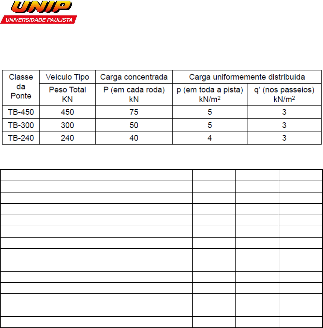 __________________________________________________________________________________________________ Christiane Luz P. R. Gurgeira Pontes e Grandes Estruturas Tabela de cargas dos veículos tipo Características do veículo tipo Características dos veículos Tipo 45 Tipo 30 Tipo 12 Quantidade de eixos 3 3 2 Peso total do veículo (kN) 450 300 120 Peso de cada roda dianteira (kN) 75 50 20 Peso de cada roda trazeira (kN) 75 50 40 Peso de cada roda intermediária (kN) 75 50 - Largura de contato b , roda dianteira (m) 0,50 0,40 0,20 Largura de contato b , roda trazeira (m) 0,50 0,40 0,30 Largura de contato b , roda intermediária (m) 0,50 0,40 - Comprimento do contato de cada roda 0,20 0,20 0,20 Área de contato de cada roda (m²) 0,2 x b 0,2 x b 0,2 x b Distância entre eixos (m) 1,50 1,50 3,00 Distância entre os centros de roda/eixo (m) 2,00 2,00 2,00 __________________________________________________________________________________________________ Christiane Luz P. R. Gurgeira Dimensões dos veículos tipo __________________________________________________________________________________________________ Christiane Luz P. R. Gurgeira Trem tipo Trem tipo seção transversal q (kN/m²) = carga “p” majorada q = p ∙ CIV ∙ CNF ∙ CIA q’= carga uniformemente distribuída nos passeios Q (kN) = carga “P” majorada Q = P∙ CIV ∙ CNF ∙ CIA __________________________________________________________________________________________________ Christiane Luz P. R. Gurgeira CIV – Coeficiente de Impacto Vertical LIV – vão em metros para o cálculo do CIV CNF – Coeficiente de Número de Faixas CIA – Coeficiente de Impacto Adicional CIA = 1,25 Para obras em concreto ou mistas CIA = 1,15 Para obras em aço • Para estruturas com vão menor que 10 m: CIV = 1,35 • Para estruturas com vão entre 10 m e 200 m: CIV=1+1,06 ∙ ( 20 LIV+50 ) • Para estruturas com vãos acima de 200 m deve-se realizar estudo específico • LIV é o valor do vão para estruturas de vão isostático; • LIV é a média aritmética dos vãos no caso de vãos contínuos; • LIV é o comprimento do próprio balanço para estruturas em balanço; • LIV é a média aritmética dos vãos quando os balanços se apresentarem com vãos diferentes e Lmenor ≥ 70% Lmaior CNF = 1 - 0,05 ∙ (n - 2) > 0,9 n número (inteiro) de faixas de tráfego rodoviário. Obs.: não se considera faixa de tráfego da rodovia os acostamentos e faixas de segurança.