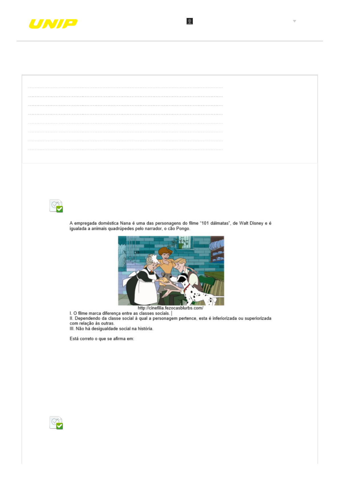 31/03/2019 Revisar envio do teste: AVALIAÇÃO - TI I – 6717-20_... https://ava.ead.unip.br/webapps/assessment/review/review.jsp?attempt_id=_15742919_1&course_id=_38099_1&content_id=_601648_1&return_… 1/6 Revisar envio do teste: AVALIAÇÃO - TI I ESTUDOS DISCIPLINARES IX 6717-20_SEI_PD_0417_R_20191 CONTEÚDO Usuário cristiane.silva92 @unipinterativa.edu.br Curso ESTUDOS DISCIPLINARES IX Teste AVALIAÇÃO - TI I Iniciado 31/03/19 13:52 Enviado 31/03/19 14:05 Status Completada Resultado da tentativa 10 em 10 pontos Tempo decorrido 12 minutos Resultados exibidos Respostas enviadas, Perguntas respondidas incorretamente Pergunta 1 Resposta Selecionada: b. Apenas I e II. Pergunta 2 Ao trabalhar �lme em sala de aula, pressupõe-se que o professor: I. Faça um planejamento prévio, por meio do qual tenha clareza quanto aos objetivos relativos à utilização do �lme. II. Decida se o �lme será utilizado na íntegra ou apenas em alguns trechos (e quais seriam, nesse caso, as sequências selecionadas). III. De�na qual a relação entre o �lme e os conteúdos que estão sendo trabalhados em sala de UNIP EAD BIBLIOTECAS MURAL DO ALUNO TUTORIAISCONTEÚDOS ACADÊMICOS 1 em 1 pontos 1 em 1 pontos cristiane.silva92 @unipinterativa.edu.br 3 31/03/2019 Revisar envio do teste: AVALIAÇÃO - TI I – 6717-20_... https://ava.ead.unip.br/webapps/assessment/review/review.jsp?attempt_id=_15742919_1&course_id=_38099_1&content_id=_601648_1&return_… 2/6 Resposta Selecionada: a. aula. Está(ão) correto(s): Todos os pressupostos são corretos. Pergunta 3 Resposta Selecionada: c. A construção da imagem cinematográ�ca vai além do visual, tendo como apoio a estrutura de cenas, o trabalho de câmera, o som, os diálogos, as locações, entre outras. Todo esse conjunto que compõe a imagem do �lme traz, além da narrativa propriamente dita, a intertextualidade construída por uma variedade de meios de representação. Assinale a alternativa em que se veri�ca que não há relação de intertextualidade entre as histórias. 101 dálmatas (�lme de Walt Disney) – Madagascar (�lme Eric Darnell e Tom McGrath). Pergunta 4 Resposta Selecionada: d. São vários os posicionamentos sobre cinema na escola, entre eles: I. “Uma característica do cinema é permitir uma pronta identi�cação com a plateia. É comum o estudante se projetar no papel dos personagens, o que deve ser aproveitado pelo professor para trabalhar comportamentos e paradigmas sociais com �lmes”. Revista Nova Escola. Disponível em http://revistaescola.abril.com.br/formacao/formacao-continuada/cinema-escola-�l mes-tecnologia-audiovisual-556044.shtml?page=3 II. “O valor das imagens não se encontra na conformidade possível com uma pretensa realidade que elas espelham, mas, sim, no universo de signi�cações que se exprime através delas”. Disponível em http://observatoriogeogra�coamericalatina.org.mx/egal12 III. “Para apreciarmos a arte, é necessário aprender sobre ela. Aprender a observar, a analisar, a re�etir, a criticar e a emitir opiniões fundamentadas sobre gostos, estilos, materiais e modos diferentes de fazer arte”. Disponível em http://pt.slideshare.net/lozo95/apostila-de-arte Considera(m)-se adequado(s) o(s) posicionamento(s) exposto na(s) a�rmativa(s): I, II e III; Pergunta 5 1 em 1 pontos 1 em 1 pontos 1 em 1 pontos 31/03/2019 Revisar envio do teste: AVALIAÇÃO - TI I – 6717-20_... https://ava.ead.unip.br/webapps/assessment/review/review.jsp?attempt_id=_15742919_1&course_id=_38099_1&content_id=_601648_1&return_… 3/6 Resposta Selecionada: b. Houve alteração no reino, percebida pela mudança de cores, com cores quentes na cena I e cores sombrias e escuras na cena II. Pergunta 6 Resposta Selecionada: d. Leia as a�rmações que podemos associar ao cinema na escola. I. Ver signi�ca essencialmente conhecer, perceber pela visão, alcançar com as vista os seres, as coisas e as formas do mundo ao redor. Ver é também um exercício de construção perceptiva em que os elementos selecionados e o percurso visual podem ser educados. II. Observar é olhar, pesquisar, detalhar, estar atento, de diferentes maneiras, às particularidades visuais, relacionando-as entre si. III. O saber ver e observar podem ser trabalhados de maneira que a pessoa possa analisar, re�etir, interferir e produzir visualmente por meio do entendimento da linguagem visual. Está(ao) correta(s) a(s) a�rmativa(s): I, II e III; Pergunta 7 Algumas cenas, no decorrer da história do cinema, tornaram-se extremamente famosas, sendo repetidas em muitos �lmes posteriores ou em situações fora do cinema. Tais cenas são copiadas, plagiadas, parodiadas, 1 em 1 pontos 1 em 1 pontos 31/03/2019 Revisar envio do teste: AVALIAÇÃO - TI I – 6717-20_... https://ava.ead.unip.br/webapps/assessment/review/review.jsp?attempt_id=_15742919_1&course_id=_38099_1&content_id=_601648_1&return_… 4/6 Resposta Selecionada: e. prestigiadas, sendo representadas em outros �lmes, festas, nas ruas etc. A este fenômeno chamamos intertextualidade. Dos pares de cenas a seguir, identi�que aquele que não tem relação intertextual entre as cenas. . Pergunta 8 Resposta Selecionada: b. O �lme “Rio”, de 2011, é americano e dirigido por um brasileiro, Carlos Saldanha. A história é sobre a arara azul, em extinção, que é levada para o Rio de Janeiro para se acasalar. Destacam-se duas cenas e sobre elas podemos a�rmar: A história destaca a cultura brasileira por meio da festa carnavalesca e pela diferença arquitetônica da cidade do Rio de Janeiro. Pergunta 9 1 em 1 pontos 1 em 1 pontos 31/03/2019 Revisar envio do teste: AVALIAÇÃO - TI I – 6717-20_... https://ava.ead.unip.br/webapps/assessment/review/review.jsp?attempt_id=_15742919_1&course_id=_38099_1&content_id=_601648_1&return_… 5/6 Resposta Selecionada: c. Veri�ca-se a relação entre cinema e atualidade pelas imagens tecnológicas de cada cena. Pergunta 10 1 em 1 pontos