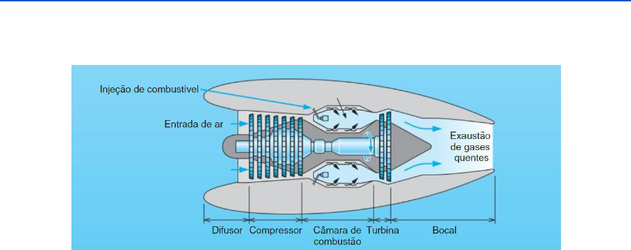 Ciclos padrão de Ar Fluidos de trabalho que permanecem gasoso durante todo o ciclo, a diferença em processos de expansão e compressão é consideravelmente menor. Conceito de ciclos padrão Ar: muitos equipamentos dedicados a produção de trabalho, utilizam um fluido de trabalho que está sempre em estado gasoso. Ex: ignição por centelha. Variam de uma mistura de ar e combustível para produtos de combustão, (motores de combustão interna), ou a queima de combustível ocorre fora do motor, o calor é transferido dos produtos de combustão para o fluido de trabalho (motores de combustão externa). --------------------------------------------------------------------------------------------------------------------------- Propulsão a Jato O trabalho realizado pela turbina é exatamente igual para acionar o compressor. Portanto, os gases são expandidos na turbina, até uma pressão que o trabalho da turbina seja o mesmo que o compressor. A pressão na seção de descarga da turbina será superior a da vizinhança e o gás será expandido em um bocal até a pressão desse ambiente. O gases saem do bocal a alta velocidade, apresentando uma variação na quantidade de movimento e disso resulta um empuxo sobre o avião. http://motoresdecarrosrdf.blogspot.com/2016/12/motor-de-combustao-interna-e-externa.html https://issuu.com/editorablucher/docs/issu_fundamentos_da_termodinamica/55 Existem dois tipos de motores a reação na indústria aeronáutica. O Turbojato e o Turbofan. Turbinas a gás, como o ramjet, são equipamentos nos quais a energia térmica proveniente da queima de um combustível com ar é convertida em trabalho útil. O ramjet (motor a jato) consiste de uma região de entrada (difusor), uma câmara de combustão e um bocal como esquematizado na Figura. Já no motor turbofan, consiste em um fan, para empurrar o ar para a câmara de compressão. Uma câmara de combustão, uma turbina e um bocal. E o motor turbojato consiste em um compressor, uma câmara de combustão, uma turbina e um bocal. Um motor com baixa propulsão específica tem um jato de menor velocidade, como mostra a equação abaixo (aproximada) para propulsão: Colocar as eqs Turbofans de baixa taxa de contorno: Motores a reação com baixa taxa de contorno, ou seja, um motor de alta propulsão. Ele consiste em uma ventoinha de vários estágios, criando uma taxa de pressurização relativamente alta e, consequentemente, conseguindo uma alta velocidade de exaustão. O mesmo são mais econômicos e mais eficientes. O turbofan de baixa taxa de contorno provavelmente operaria a pressões de bocal maiores que as do turbofan, mas com uma temperatura de exaustão menor para reter a propulsão específica. Uma vez que o aumento de temperatura através de todo o motor (da entrada ao bocal) seria menor, o fluxo de combustível também seria menor, resultando em um menor consumo específico de combustível. Turbojato O Turbojato ou turborreator é o tipo mais simples e mais antigo de motor a jato para fins gerais. Dois engenheiros diferentes, Frank Whittle no Reino Unido e Hans von Ohain na Alemanha, desenvolveram independentemente o conceito durante o final da década de 1930. https://pt.wikipedia.org/wiki/Turbofan https://pt.wikipedia.org/wiki/Turbojato http://www.fem.unicamp.br/~llagost/ES748/motor%20a%20jato.pdf http://cienciatecnologiafoco.blogspot.com/2014/10/turbofan.html