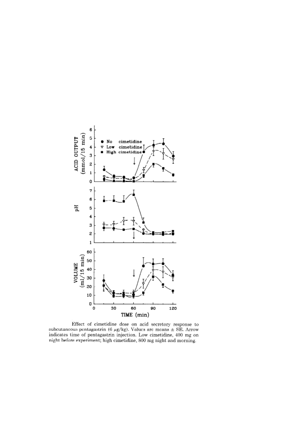 AÇÕES DA GASTRINA, SECRETINA E INSULINA Foram analisadas amostras de 48 indivíduos, os quais foram divididos em grupos de 12 para permitir uma análise estatística adequada. Neste teste, 2 grupos foram tratados com cimetidina – low cimetidine = receberam 400 mg na noite anterior ao experimento e high cimetidine = 800 mg na noite anterior ao experimento e 800 mg na manhã do experimento. Obs . pentagastrina é um análogo da gastrina. Amostras foram coletadas em intervalos de 15 minutos até completar 2horas. ! ! INJEÇÃO SUBCUTANEA DE INSULINA ! INJEÇÃO ENDOVENOSA DE INSULINA 1. Como a secreção ácida gástrica pode ser estimulada? 2. Qual a relação entre a insulina e a secreção ácida gástrica? 3. Por que a velocidade do efeito da pentagastrina é diferente do efeito da insulina? 4. Por que se observa diferenças nos resultados quando se compara os efeitos da insulina administrada por via subcutânea e endovenosa? 5. Quais os potenciais efeitos colaterais do uso da cimetidina? Explique 6. Qual o efeito adverso mais importante no experimento com insulina? Seria possível controlar esses efeitos? OUTRO EXPERIMENTO- COM CÃES. ! 1) Descreva brevemente os efeitos sobre a secreção ácida gástrica: 1. Infusão intravenosa de gastrina 2. Administração intravenosa de secretina na presença da gastrina 3. Adição de ácido no duodeno na presença secretina intravenosa 2) Qual é a condição fisiológica que mimetiza a infusão de ácido no duodeno, representada no gráfico por “HCl”? Qual o objetivo de incluir este grupo experimental? 3) Com base nos dados apresentados, qual seria o mecanismo pelo qual a secretina regula a secreção ácida gástrica? ! 4)Descreva brevemente os efeitos sobre a secreção ácida gástrica: 1) Infusão intravenosa de histamina 2) Administração intravenosa de secretina na presença da histamina Adição de ácido no duodeno na presença de histamina intravenosa