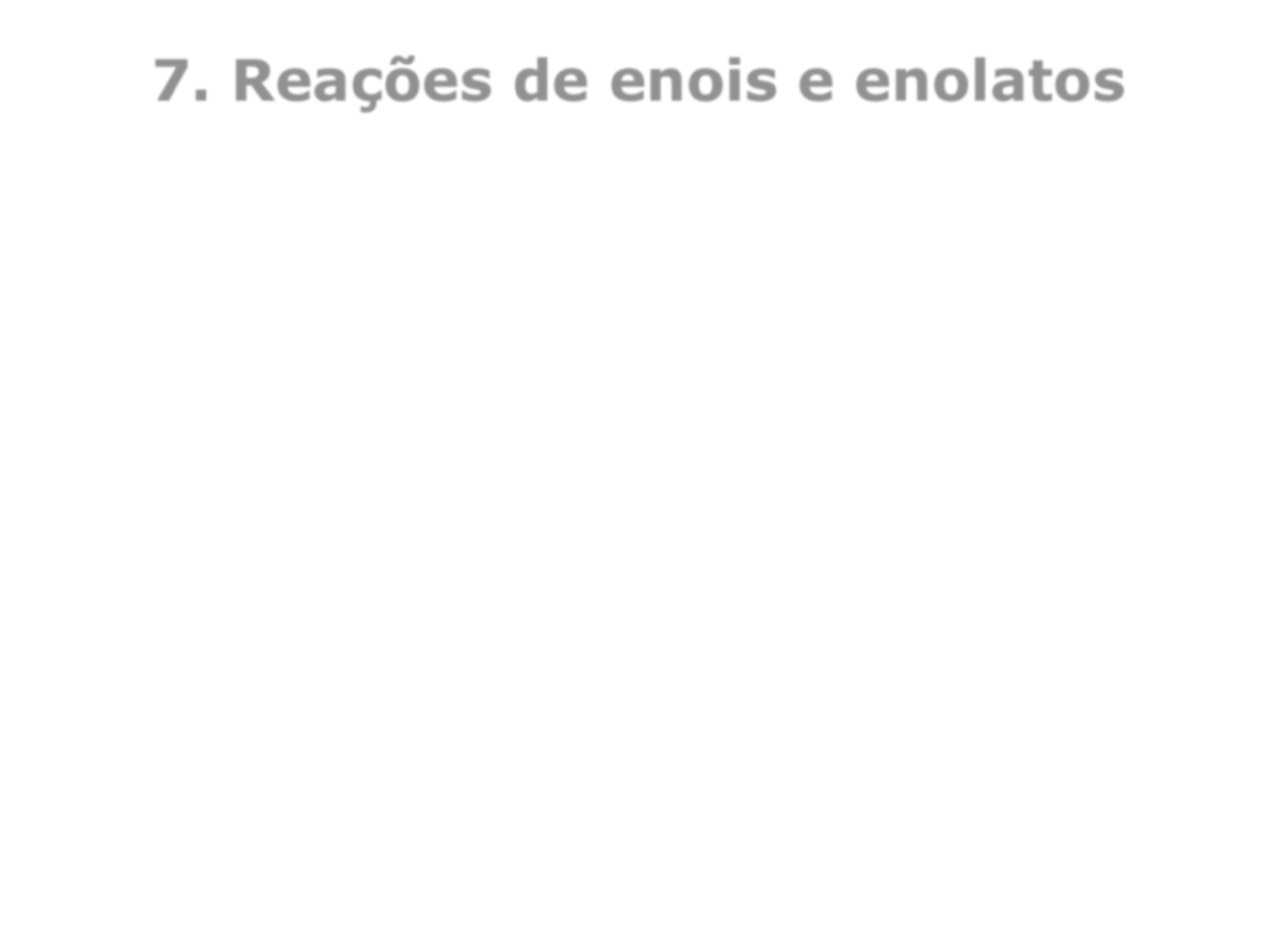 7. Reações de enois e enolatos 7.1. Acidez do Hidrogênio-α de Compostos Carbonílicos 7.2. Tautomerismo Ceto–Enôlico 7.3. Reações de Enois e Enolatos: Substituição-α 7.4. Alquilação de Carbono- α de Compostos Carbonílicos 7.5. Condensação Aldólica 7.6. Condensação de Claisen 7.7. Alquilação de Compostos 1,3-Dicarbonílicos 7.8. Reação de Wittig 7.1. Acidez do Hidrogênio-α de Compostos Carbonílicos O ânion é estabilizado por ressonância (enolato) Resonance-stabilized enolate anion -OO O CH3-C-CH 2 CH3-C=CH 2 A-CH3-C-CH 2-H + + H-A 2 Acidez do Hidrogênio-α de Compostos Carbonílicos: Valores de pKa Tipo de ligação pK a 16 20 25 44 51 O CH 3 C C-H CH 3 CH 2 O-H CH 3 CCH 2 -H CH 2 =CH-H CH 3 CH 2 -H 3 4 Acidez C-H de Diferentes Derivados Os elétrons no carbono α não são deslocalizados com facilidade devido à existência da estrutura de ressonância na esquerda: Ésteres menos ácidos Ésteres versus Aldeídos/Cetonas: Deslocalização dos pares de elétrons do oxigênio Deslocalização da carga negativa do carbono α nitroetano pKa = 8,6 propanonitrila pKa = 26 N,N-dimetilacetamida pKa = 30 C-H Ácidos não Compostos Carbonílicos A acidez do hidrogênio-α é atribuída à estabilização da carga por ressonância. Maior deslocalização da carga. Acidez do Hidrogênio-α de Compostos Dicarbonílicos 5 6 7 7.2. Tautomerismo Ceto–Enôlico Compostos Carbonílicos Simples: Predomina o Tautômero CETO Compostos Dicarbonílicos : Aumento do Tautômero ENOL ligação de hidrogênio Fenóis : Somente ‘Enol’ – Sistema Aromático conjugação 100 % 0,0 % Tautômeros versus Estruturas de Ressonância Ânion enolato A - + 8 Forma enólica Forma cetônica - O O OH O CH 3 -C-CH 2 CH 3 -C=CH 2 CH 3 -C=CH 2 H-A CH 3 -C-CH 3 + A - H-A - Tautômeros Estruturas de Ressonância Equilíbrio Ceto–Enólico O CH3CCHCCH3 H CH2CH O H CH2CCH3 O O H CCH2 H OH CCH2 OH CH3 CH3C C H O CCH3 O H ΔGº ~ + 9 kcal mol-1 K = 5 x 10-6 etanal (acetaldeído) etenol (álcool vinílico) K = 6 x 10-9 propanona (acetona) 2-propenol ΔGº ~ + 11 kcal mol-1 hexano 10% 2,4-pentanodiona (acetilacetona) 90% Z-4-hidroxipent-3-en-2-ona 9 10 Mecanismos da Enolização Catálise Básica: Catálise Ácida: 11 Troca Hidrogênio – Deutério CH3CHCH2CH3 O CD3CCD2CH3 O D2O, DO - 1,1,1,3,3-pentadeuterio-2-butanona2-butanona C H C O C C O + DO- - + DOH C C O D OD C D C O- + + DO- C C OD + H+C H C O C C H O D + D+ C C OD D C D C O + D+ C D C O + D+ Catálise Básica Catálise Ácida 12 Isomerização no Carbono-α Isomerização cis/trans em 2,3-dialquilciclopentanona: O-K+ CH2CH=CH2 CH3 O CH2CH=CH2 CH3 10% KOH, CH3CH2OH O CH2CH=CH2 CH3 Racemização da 3-fenil-2-butanona: CH3CH2O - CH3CH2OH C C6H5 H3C C O- CH3 CH3CH2O - CH3CH2OH C CCH3 C6H5 H H3C C CCH3 C6H5 H3C H O (S)-3-fenil-2-butanona aquiral (R)-3-fenil-2-butanona O CH3CH2O- CH3CH2OH CH3CH2OH CH3CH2O- Um enol é um melhor nucleófilo do que um alceno. Compostos carbonílicos que formam enóis sofrem reações com eletrófilos: substituição no carbono-α 13 7.3. Reações de Enois e Enolatos: Substituição-α Estrutura de ressonâncio do enol com separação de cargas Porem: Todos os átomos possuem octeto. Um Enolato é um Nucleófilo Bidentado Reações no C ou O dependem do eletrófilo e das condições de reação. A protonação ocorre preferencialmente no oxigênio. 14 Nucleofilicidade de Enois e Enolatos Estrutura de Ressonâncio do Enolato estrutura com carga negativa no oxigênio contribui mais. Mecanismo da Substituição-α de Enois Catálise Ácida: Via Enol 15 Catálise Básica: Via Enolato Halogenação Catalisada por Ácido Sob condições ácidas, um único hidrogênio-α é substituído pelo bromo. 16 Sob condições básicas, todos os hidrogênios-α são substituídos pelo bromo. Halogenação Catalisada por Base 17 Halogenação-α de Cetonas: Comparação entre Catálise Ácida e Básica 18 CH3CCH3 O + H+ CH3CCH3 O - H+ H O RC CH2 H C R O CH2+ OH + HOH CH2CCH3 O + H+ CH2CCH3 O - H+ H Br Br O RC CH H C R O C+ OH + HOH Br H Br Equilíbrio acima mais favorável: Efeito –I do bromo desestabiliza o ácido correspondente Equilíbrio abaixo mais favorável: Efeito –I do bromo estabiliza o enolato Conversão de Metil Cetona à Ácido Carboxílico (Reação Halofórmio) 19 Reação Halofórmio: Formação de Enolato com Bases Fortes 20 LDA (amideto de diisopropil lítio) 7.4. Alquilação de Carbono-α de Compostos Carbonílicos 21 Ocorrência de Poli-alquilação: Dois produtos diferentes podem ser formados com cetonas não simétricas. 22 Alquilação de Carbono-α de Compostos Carbonílicos: Regio-Química 23 Alquilação de Compostos Carbonílicos: Regio-Seletividade na Formação de Enolatos enolatos regio-isômeros produtos regio-isoméricos 24 Alquilação de Compostos Carbonílicos: Enolatos Termodinâmicos enolato mais estável formado exclusivamente ambos os grupos são introduzidos de maneira regio-seletiva alquilação descarboxilação Formação altamente preferencial do enolato mais estável, pela abstração do H mais ácido (duplamente ativado pelos grupo cetos e éster), enolato termodinâmico. Formação altamente preferencial do enolato conjugado mais estável, enolato termodinâmico. formação do enolato conjugado enolato não-conjugado não formado KH como base forte e pequena Ph 25 Alquilação de Compostos Carbonílicos: Equivalentes de Enolatos Termodinâmicos Silil enol éter com C=C mais substituida enolato de Li termodinâmico Este método permite a alquilação regio-específica de compostos carbonílicos no carbono mais substituido. Formação preferencial do silil-enol éter mais substituido: enol minoritário: menos substituido enol majoritário: mais substituido 26 Alquilação de Compostos Carbonílicos: Formação de Enolatos Cinéticos adicionar a cetona a à H menos acessível (mais impedido) H mais acessível (menos impedido) enolato cinético Enolato Cinético formado com base forte 