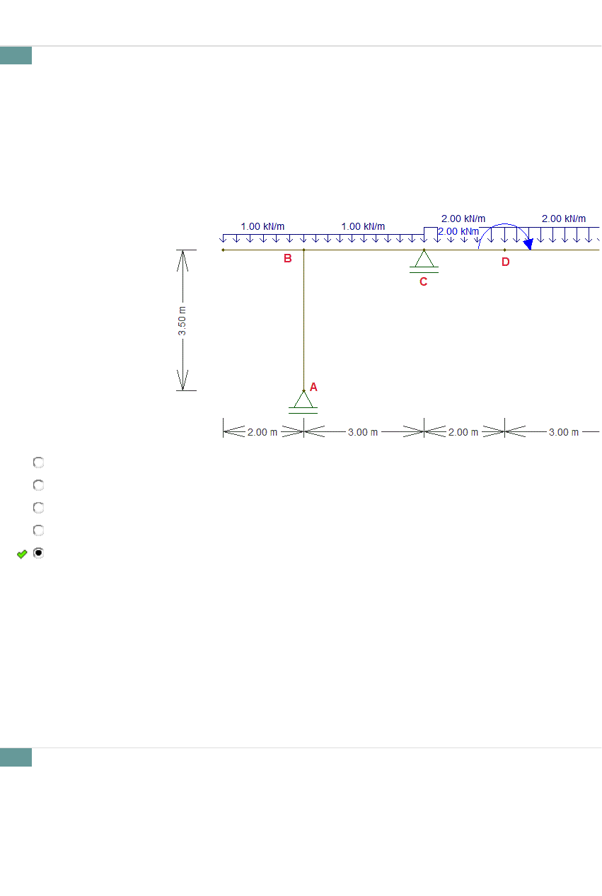 1. Obter o momento fletor na seção C, da estrutura abaixo, conforme mostra a figura. Dados: J = 1,00 mm4 (em toda a estrutura) E = 100000 MPa MC = -5,61 kNm MC = -7,61 kNm MC = +5,61 kNm MC = +7,61 kNm MC = -2,61 kNm Explicação: Usar 5 casas decimais 2. Obter a reação de apoio no apoio C (VC), da estrutura abaixo, conforme mostra a figura. Dados: J = 1,00 mm4 (em toda a estrutura) E = 100000 MPa VC = +935,31 kN VC = +925,31 kN VC = +915,31 kN VC = +945,31 kN VC = +955,31 kN Explicação: Usar 5 casas decimais 3. Obter o momento fletor na seção H, da estrutura abaixo, conforme mostra a figura. Dados: J = 1,00 mm4 (em toda a estrutura) E = 100000 MPa MH = -69,53 kNm MH = -65,53 kNm MH = -29,53 kNm MH = -25,53 kNm MH = -55,53 kNm Explicação: Usar 5 casas decimais 4. Obter o momento fletro na seção D, da estrutura abaixo, conforme mostra a figura. Dados: J = 1,00 mm4 (em toda a estrutura) E = 100000 MPa MD = -440,62 kNm MD = -430,62 kNm MD = +420,62 kNm MD = -320,62 kNm MD = -420,62 kNm Explicação: Usar 5 casas decimais 5. Obter o momento fletor na seção E, da estrutura abaixo, conforme mostra a figura. Dados: J = 1,00 mm4 (em toda a estrutura) E = 100000 MPa ME = -5,47 kNm ME = -7,47 kNm ME = -6,47 kNm ME = -4,47 kNm ME = -8,47 kNm Explicação: Usar 5 casas decimais 6. Obter o momento fletor na seção E, da estrutura abaixo, conforme mostra a figura. Dados: J = 1,00 mm4 (em toda a estrutura) E = 100000 MPa ME = -8,52 kNm ME = -6,52 kNm ME = +6,52 kNm ME = -5,52 kNm ME = +8,52 kNm Explicação: Usar 5 casas decimais