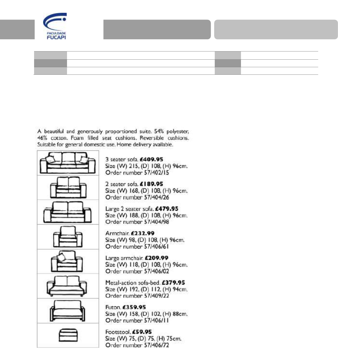 Fonte:http://www.bbc.co.uk/apps/ifl/skillswise/mod_quizzes/words/reading/techniques/scanning/1/quize ngine?quiz=simplequiz1;templateStyle=simplequiz 1 Exercícios de fixação 2 SCANNING Leia os textos a seguir para marcar a alternativa correta em cada questão: TEXTO I 1. Os sofás anuciados no texto têm aproxidamente: a) 50% polyester, 50% algodão b) 49% polyester, 51% algodão c) 54% polyester, 46% algodão d) 46% polyester, 54% algodão 2. O catálogo oferece entrega em domicílio? a) Sim. Ela custa £100.00 b) Sim. A entrega é grátis. c) O catálogo não oferece serviço de entrega. d) Sim, mas o preço do serviço de entrega é desconhecido. 3: A poltrona grande custa £232.99. a) Verdadeiro b) Falso 4: Quanto custa o sofá com três lugares? a) £409.95 b) £359.95 c) £232.99 d) £479.95 5: Para que tipo de uso os produtos anunciados são feitos? a) Uso doméstico pesado b) Uso doméstico geral c) Uso doméstico leve d) Uso comercial 6: O futon custa mais que a poltrona. a) Verdadeiro b) Falso 7: Qual é a altura da maioria dos produtos? a) 94cm b) 95cm c) 96cm d) 97cm Disciplina Inglês Instrumental Nota Professor Augusto Bücker Turno Aluno (a) Data Pâmella Realce Pâmella Realce Pâmella Realce Pâmella Realce Pâmella Realce Pâmella Realce Pâmella Realce Fonte:http://www.bbc.co.uk/apps/ifl/skillswise/mod_quizzes/words/reading/techniques/scanning/1/quize ngine?quiz=simplequiz1;templateStyle=simplequiz 2 8: Quanto custa o menor móvel anunciado? a) £59.95 b) £189.95 c) £79.99 d) £69.99 9: O sofá-cama Metal-action é mais largo que o sofá com dois lugares. a) Verdadeiro b) Falso 10: Quantos produtos custa mais que £350? a) 1 b) 2 c) 3 d) 4 TEXTO II Considerando que o circuito percorrido pela linha de ônibus descrita acima vai da Murraufield Drive ao Centro da Cidade, responda: 1: Que hora o ônibus de 08.42 de Murrayfield Drive chega ao Trenton Hospital na quinta- feira? a) 08:59 b) 09:02 c) 09:22 d) 11:02 2: Que hora o ônibus de 10.49 de Trenton Parade chega à Gately Road na segunda-feira? a) 11:10 b) 12;10 c) 12;15 d) 11:55 3: Se você precisar estar no centro da cidade às11am no domingo pela manhã, que ônibus você deve tomar desde o Tilfield Park? a) O das 07:58 b) O das 10:04 c) O das 10:00 d) O das 11:59 Pâmella Realce Pâmella Realce Pâmella Realce Pâmella Realce Pâmella Realce Pâmella Realce Pâmella Realce Fonte:http://www.bbc.co.uk/apps/ifl/skillswise/mod_quizzes/words/reading/techniques/scanning/1/quizen gine?quiz=simplequiz1;templateStyle=simplequiz 3 4: Se você precisar estar no centro da cidade às10.30am na quarta-feira pela manhã, que ônibus você deve tomar desde o Trenton Hospital? a) O das 11:02 b) O das 08:02 c) O das 08:10 d) O das 09:02 5: Se você quer chegar na Broadwalk às 15.30 na terça-feira, que ônibus você deve pegar desde a St. Clement's Church? a) O das 14:55 b) O das 13:55 c) O das 13:59 d) O das 14:59 6: Se você perder o ônibus das 17.00 saindo do Tilfield Park em uma sexta-feira, que horas sairá o próximo ônibus? a) 17:03 b) 17:12 c) 18:03 d) 18:07 7: Se você perder o ônibus das 08.10 saindo de Gately Road em uma segunda-feira, quando chega o próximo ônibus? a) 08:15 b) 09:15 c) 11:10 d) 08:22 8: Se você precisar chegar ao Trenton Hospital às 17.15 em um domingo, que ônibus você deve pegar desde a Murrayfield Drive? a) 13:41 b) 15:43 c) 16:43 d) 16:01 9: Quanto tempo dura o percurso do ônibus de 11.42 desde a Murrayfield Drive para o Trenton Hospital em um sábado? a) 19 minutos b) 20 minutos c) 21 minutos d) 22 minutos 10: Se você precisar estar no Tilfield Park às 09.00 em uma quinta-feira, que ônibus você precisa pegar desde a Trenton Parade? a) O das 07:48 b) O das 08:42 c) O das 08:49 d) O das 08:55 Pâmella Realce Pâmella Realce Pâmella Realce Pâmella Realce Pâmella Realce Pâmella Realce Pâmella Realce Pâmella Realce