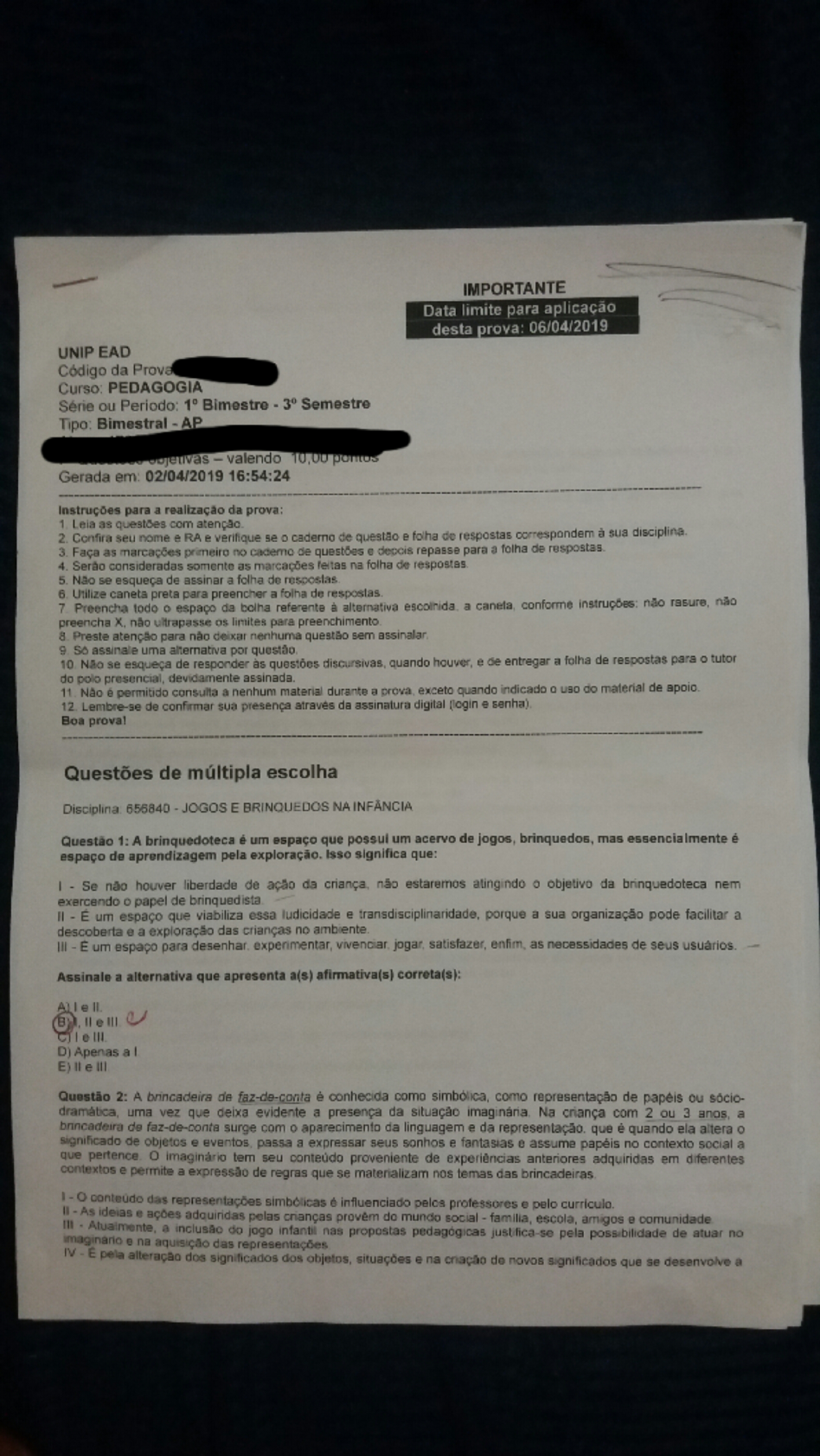 PROVA UNIP 2019 JOGOS E BRINQUEDOS NA INFÂNCIA CORRIGIDA