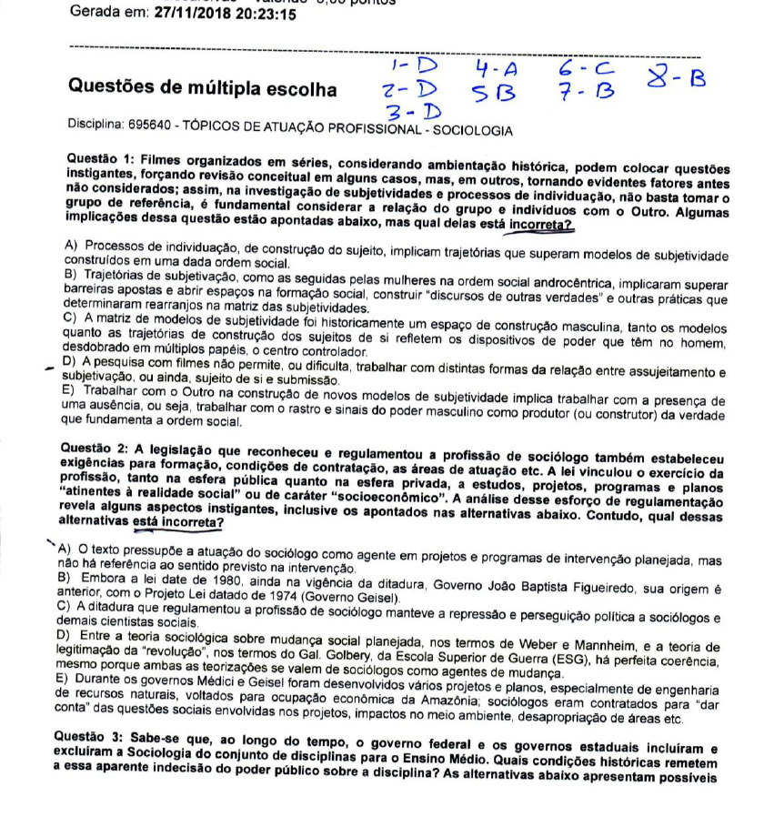 PROVAS TÓPICOS DE ATUAÇÃO PROFISSIONAL SOCIOLOGIA