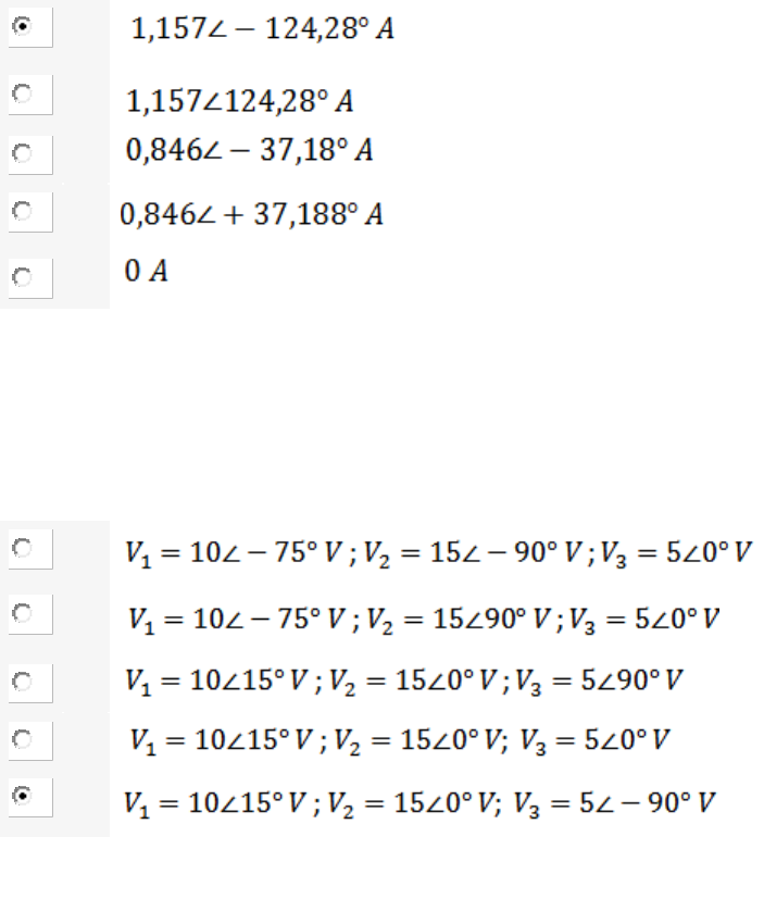 Apol 05 Eletricidade nota 100 Questão 1/5 - Eletricidade Se uma fonte de tensão v(t) = 220cos(314,16t) V alimenta uma carga composta de um indutor de 0,5 H conectado em série a um conjunto composto por um resistor de 50 ohms em paralelo com um capacitor de 63,66 uF, calcular a corrente que circula no resistor. (Considere o fasor da fonte de tensão como referência). A B C D E Questão 2/5 - Eletricidade Encontrar os fasores das funções v1 = 10 cos(200t + 15°), v2 = 15 cos(200t) e v3 = 5 sen(200t), considerando V2 como sendo o fasor de referência. Assinale a alternativa correta. A B C D E Questão 3/5 - Eletricidade No circuito da figura a seguir, calcular as correntes de malha I1 e I2. Assinale a alternativa correta. A I1 = 0,55 + j 0,165 A; I2 = 2 + j 2 A. B I1 = 1,468 + j 0,44 A; I2 = 0 - j 0 A. C I1 = 1,468 + j 0,44 A; I2 = 0 + j 2 A. D I1 = 0,55 + j 0,165 A; I2 = -2 + j 0 A. E I1 = 1,468 - j 0,44 A; I2 = 2 + j 0 A. Questão 4/5 - Eletricidade Obter o circuito equivalente de Thévenin do circuito a seguir, sabendo que: A B C D E Questão 5/5 - Eletricidade Obter os valores de Zth e Vth e do circuito equivalente de Thévenin do circuito a seguir. A B C D E