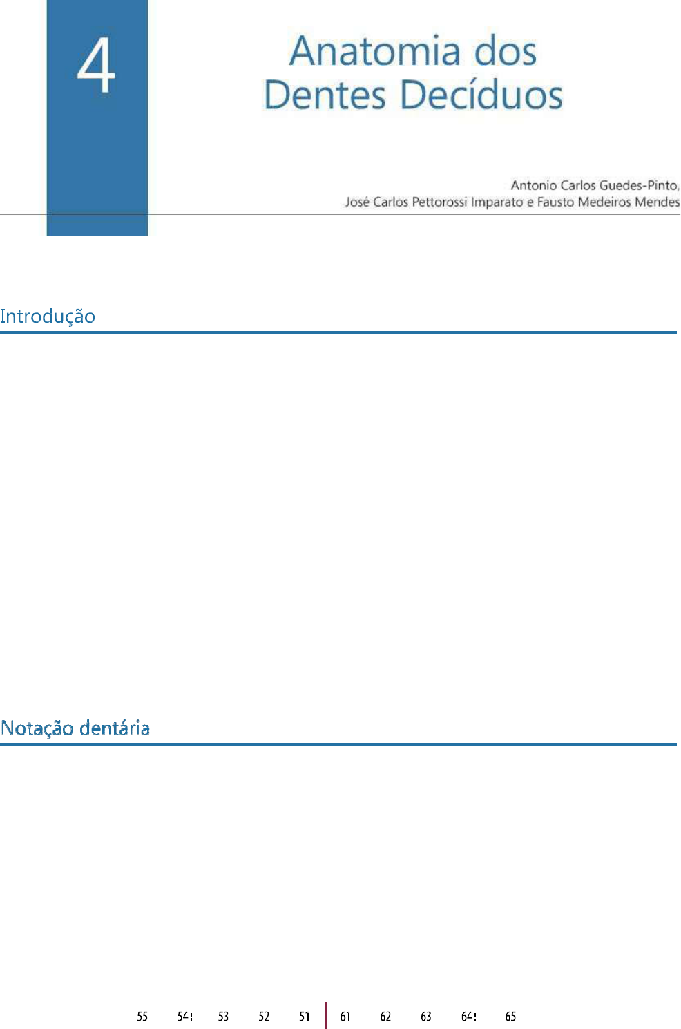 https://jigsaw.vitalsource.com/api/v0/books/9788527728881/print?fr... 1 de 2 03/02/2017 13:14 A anatomia dentária é a parte da anatomia humana que estuda o órgão dentário e os tecidos em que ele está inserido, os quais, juntos, formam o complexo aparelho mastigatório do ser humano.1 Os profissionais que optam pela especialidade da Odontopediatria têm a obrigação de conhecer a morfologia dos dentes decíduos em todos os seus aspectos, haja vista a grande parte do trabalho clínico realizado sobre essa fase da dentição. Segundo Braly, não há ciência básica mais valiosa ao cirurgião-dentista que o conhecimento da forma e da função das dentições humanas.2 Apesar disso, esse tema pouco enfatizado nas disciplinas de Odontopediatria. Muitos autores descrevem a importância do conhecimento da anatomia dentária no restabelecimento anatomofuncional quando ocorre a perda de estrutura dentária decorrente dos processos de cárie.2-4 Além disso, o conhecimento da morfologia dos dentes decíduos tem grande relevância em muitos outros aspectos da prática clínica. Na realização de terapêuticas pulpares, o clínico deve ter o conhecimento da espessura e das proporções dos diferentes tecidos dentários, bem como da anatomia interna dos dentes decíduos. Em relação aos traumatismos dentários, o conhecimento da anatomia radicular em conjunto com o ciclo biológico e da relação desse dente com seu sucessor permanente é fundamental para o estabelecimento de um diagnóstico preciso e de um bom prognóstico das condutas adotadas. A forma do dente também influencia as terapêuticas cirúrgicas, ortodônticas e de reabilitação bucal em casos de próteses e grandes reconstruções. Até mesmo para o diagnóstico de lesões de cárie, o cirurgião-dentista, conhecendo as regiões mais suscetíveis, leva vantagem sobre o leigo nesse assunto. Várias formas foram descritas para representar graficamente os dentes. O sistema universal utiliza números de 1 a 32 para os dentes permanentes e letras de A a T para os decíduos.1,5 O número 1, ou a letra A, no caso dos dentes decíduos, simboliza o molar mais posterior do arco superior direito, com a sequência no sentido horário. O último símbolo representa o molar mais posterior do lado inferior direito. Já o sistema de notação de Palmer utiliza números de 1 a 8 para a dentição permanente e letras de A a E na dentição decídua. A indicação do quadrante é feita por meio de dois traços. O traço horizontal corresponde ao quadrante, e o vertical, ao lado. Por exemplo, o canino superior decíduo do lado direito é representado por C. Alguns autores preconizam para os dentes decíduos o uso de algarismos romanos no lugar das letras.6 Atualmente, o sistema utilizado em maior escala é o preconizado pela Fédération Dentaire Internationale (FDI), que utiliza dois dígitos para dentes permanentes e decíduos. O primeiro corresponde ao quadrante e o segundo ao dente, como se observa no esquema abaixo. https://jigsaw.vitalsource.com/api/v0/books/9788527728881/print?fr... 2 de 2 03/02/2017 13:17 18 17 16 15 14 13 12 11 21 22 23 24 26 27 28 48 47 46 45 44 43 42 41 31 32 34 36 38 85 83 82 81 71 72 75 Nomenclatura das estruturas anatômicas Superfícies ou faces. São as paredes das coroas ou raízes, que se orientam de maneira diversa. São nomeadas e diferenciadas entre si de acordo com a sua posição (superfície vestibular, superfície oclusal etc.). Cristas. Elevações lineares na superfície de um dente. Também são nomeadas de acordo com sua localização. As cristas marginais são aquelas que cercam a periferia de algumas faces dos dentes, principalmente oclusal nos posteriores e lingual nos anteriores. Quando as cristas partem das pontas das cúspides em direção às fossas e aos sulcos, são denominadas cristas triangulares. Quando a crista interrompe um sulco, unindo duas cúspides obliquamente por suas cristas triangulares, denomina-se crista oblíqua ou ponte de esmalte. Quando esta corre no meio da superfície oclusal paralela às cristas marginais, é denominada crista transversa. Lóbulos. Segmentos das faces vestibulares e linguais dos dentes anteriores, separados por sulcos, que representam partes primárias desses dentes. Têm correlação com as cúspides nos molares. Cúspides. São elevações na porção coronária do dente, que caracterizam a divisão das superfícies oclusais (em pré-molares e molares) ou incisivas (em caninos). Representam também partes primárias dos dentes. Tubérculo. É uma pequena elevação do esmalte localizada em alguma porção da coroa do dente. São diferentes das cúspides, pois não são partes primárias. Cíngulo. Saliência acentuada localizada na face lingual dos dentes anteriores. Fossas. São depressões irregulares ou concavidades amplas. Estão localizadas nas superfícies oclusais dos molares e pré-molares ou nas faces linguais dos dentes anteriores. Fossetas. São pequenas depressões localizadas no fundo das fossas ou nas junções ou terminações dos sulcos de desenvolvimento. Sulcos de desenvolvimento. São longas depressões lineares na superfície de um dente entre cristas e cúspides, separando partes primárias do dente ou da raiz. Sulcos suplementares ou secundários. São sulcos mais rasos que não dividem partes primárias do dente e partem das fossas e dos sulcos principais. Fissura. É um sulco estreito que se localiza na junção dos planos inclinados dos sulcos, ou seja, na sua profundidade. • Os incisivos são os dentes localizados mais anteriormente no arco. São em número de quatro para cada arco, em ambas as dentições. Sua forma é designada primordialmente para cortar. A superfície lingual tem forma de pá para ajudar a guiar o alimento dentro da boca • Os caninos seguem na sequência dos arcos e são em número de dois para cada, tanto na dentição permanente quanto na decídua. Têm as funções de segurar e rasgar os alimentos