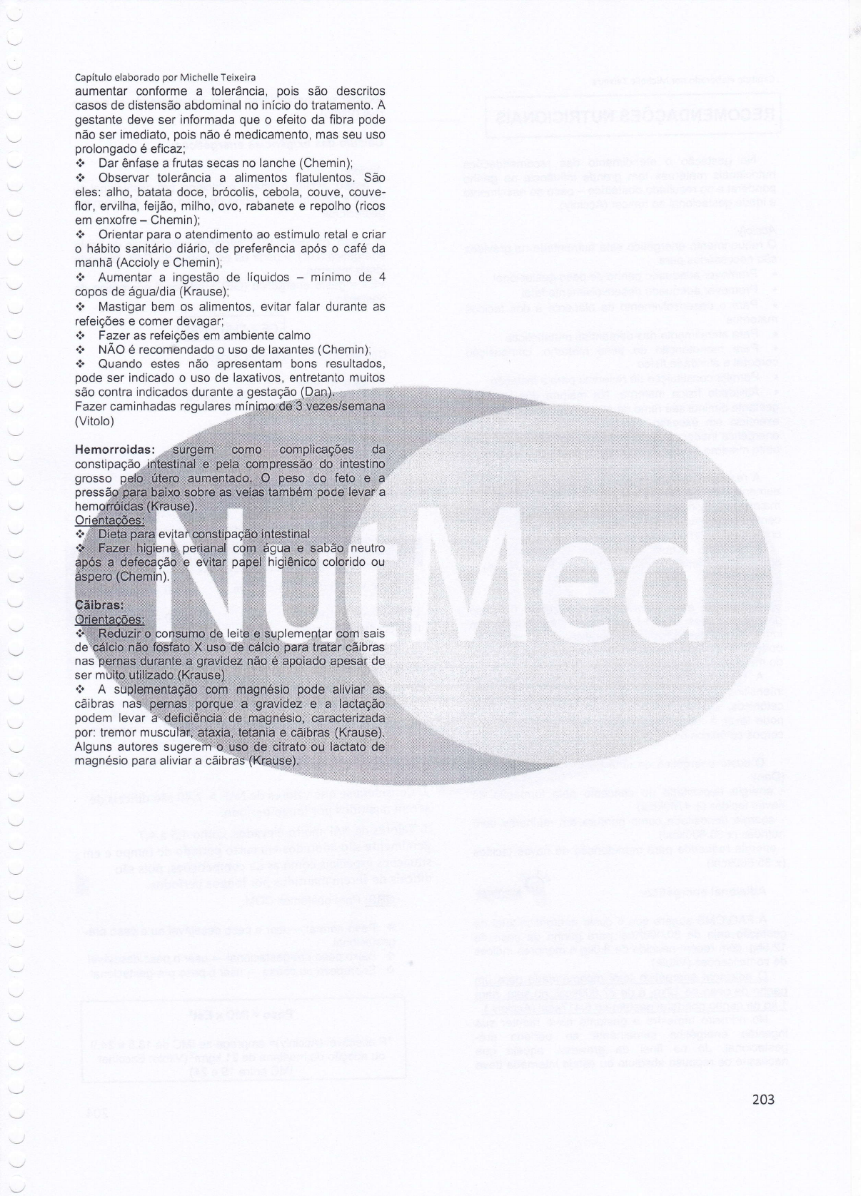 Capítulo elaborado por Michelle Teixeira aumentar conforme a tolerância, pois são descritos casos de distensão abdominal no início do tratamento. A gestante deve ser informada que o efeito da Íibra pode não ser imediato, pois não é medicamento, mas seu uso prolongado é eÍicazi * Dar ênÍase a frutas secas no lanche (Chemin); * Observar tolerância a alimentos flatulentos. São eles: alho, batata doce, brócolis, cebola, couve, couve- Ílor, ervilha, feijão, milho, ovo, rabanete e repolho (ricos em enxofre - Chemin); l. Orientar para o atendimento ao estímulo retal e criar o hábito sanitário diário, de preÍerência após o cafe da manhã (Accioly e Chemin), * Aumentar a ingestão de líquidos - mínimo de 4 copos de água/dia (Krause); .:. Mastigar bem os alimentos, evitar falar durante as refeições e comer devagar; .:. Fqzer as refeições em ambiente calmo * NAO é recomendado o uso de laxantes (Chemin); * Quando estes não apresentam bons resultados, pode ser indicado o uso de laxativos, entretanto muitos são contra indicados durante a gestação Fazer caminhadas regulares m(Vitolo) .,,-.".,í*il) de nas ser{.4 cãibras podem levar ã »i Ill $,{l[(mffl sars Hemorroidas: constipaçãoj por: tremor muscúÍãɧ Alguns autores sugereiii 203 Capítulo elaborado por Michelle Teixeira RECOMENDAÇOES NUTR|CtONAtS Na gestação o atendimento das recomendações nutricionais maternas tem grande influência no ganho ponderal e no resultado obstétrico - peso ao nascimento e idade gestacional ao nascer (Accioly). Accioly: O requerimento energético está aumentado na gravidez são necessários para: . Promover adequado ganho de peso gestacional r Promover adequado desenvolvimento fetal . Para o desenvolvimento da placenta e dos tecidos maternos . Para atendimento das demandas metabólicas . Para manutenção do peso materno, composição corporal e atividade física r Permitir constituição de reservas para a lactação . Atividade física materna. Na maioria das..veaesrr:â;ir novos tecidos (t 4780kcal) - energia depositada como gordura em mulheres bem nutridas (t 35.800kcat) - energia requerida para manutenção de novos tecidos(r 35.800kcar) receber seu metabolismo basal, considerando-se o peso real(Vitolo). Cálculo das exigências energéticas: Accioly: '1o passo: avaliar o estado nutricional pré-gestacional ou inicial e determinar o ganho de peso até a 4Oa semana gestacional 2o passo: calcular o VET, iniciando pelo cálculo do gasto energético (GE), a partir da estimativa da TMB, segundo idade materna. VET = gasto energético (GE) + adicional energético da gestação GE=TMBxNAF Cálculo da TMB, segundo a idade: / 18 a 30 anos: :. . TMB.(kcal/dia) = 14,818 (kS)* +40,0 / 30 a 60 anos: lillli iriii:.:.:::i"'' TMB (kcal/dia) = 8,126,(kS) +845,6 Níyel dê Atividâde ÍíSica: i: ,,,,. ,,:':, , ,, , : tJível cle Atiyidade Físiça {F{ÂF} para ãdulras3 §stilo de vida serienrári* ou leve [stilo dc vida arivo ou ntocleraciarnente ari\,tr Estilo de vida vigoroso ou lrrodrradarncnte vig()r.oso r,40 * 1,6§ {'t,53} 1 ,70 = 1,?9 (t,76) 2,00 - ?.40 {2,25) Notas: l. Valores de NAF extremamenfe baixos só clevem seri,a adotados"enr situações especiais, pois não são compatíveis, ;; tr" com a saúde dos indirríduos. O valor de NAF mínimo íii#; reconrenclado pelo comitê é 1,4 para intervenções a curto ,,:jlL11 Prazo' 'É 2. Considera-se que valores cle NAF > Z,4}são dificeis de serent mêntidos por longo período. 3. Valores de NAF muito elevados, como 4,5 a 4,7 gerallnente são adotaclos em.curto período de tempo e em s.it_uaçôes especiais como as de competições, pois áo dificeis de serem nranridos por longos plríodos. ,,li OBS: Para gestantes COM: * Peso normal+ usar o peso desejável ou o peso pré_ gestacional * Baixo peso pré-gestacional + usar o peso desejável * Sobrepeso ou obesa + usar o peso pré-gestacional A FAO/OMS sugere que o custo energético total dagestação seja de B0.000Kcal para ganho de peso de 12,5k9, com recém-nascido de 3,0kg e menores índices de complicações (Vitolo). O adicional eneroético total recomendado para um qanhq de oeso de 12ko, é de 77.000kca1. ou seia. para 'l kq de qanho ponderal oastam-se 6.4'l Tkcal (Acóiolv ), No primeiro trimestre a gestante deve manter sua ingestão energética semelhante ao período pré- gestacional. Já no final da gravidez, aquela que necessite de repouso absoluto ou esteja internada deve Adicional energético: 'p*n Peso=lMCxEst2 *P aceitável (Accioly)= emprega-se IMC de 1,B,S a 24,g ou adoção da mediana de 21 kglm2 (Vitolo: Escolher IMC entre 19 e 24 204 Referência: Adicional: Chemin e Vitolo 285 I 250 Kcal/dia Desde o 1o trim FAO com ativ física 200 Kcal/dia Desde o 1o trim FAO sem ativ física Chemin e Vitolo 300 Kcal/dia A partir do 20 trim RDA Accioly 'S'*n 1o trim: 85 kcal/dia FAO 2004 20 trim: 285 kcalldia 30 trim: 475 kcalldia Krause Dan Chemin 20 trim: 340 a 360kcal/dia DRt 2002 30 trim: + 112 kcalldia = 4S2kcalldia r' Chemin: RDA - peso, esse "Oiçtp-dno caso de soüiêül , #ffiffik ; - ^t:,8,* ,*s:r: iiÍ,,ffiâ#Íffi.,ffi.§.iftl"e&.Sxts-Íff Hffi,êIffi ã. "útili2ado dé§{q o"t" trlmestre, é du bbesidadepnão"rse empreoa o ;il Capítulo elaborado por Michelle Teixeira Adicional energético: [[R para adolescentes ('14 a 18 anos) EER sesÍaçao = EER pre.s*st«;o*q + ôdicional de ener- giâ pâra o gâsto durante ã gestaçao + energia ne- ces§ária parâ depósitos le trimestre = fER 1p,*serracionary * 0 * 0 2q trimestre e 3e trimestres = IER (pré.sestaoonatr + (8kcal x lü em semanas) + lB0kcal 10 passo à Avaliar o estado nutricional pré- gestacional (lMC) e determinar o peso que se ganhou até o dia da consulta e o ganho de peso restante por semana recomendado até a 40" semana gestacional. Exemplo: data da consulta: 154 semana Ganho até a consulta: 2,1 kg Supondo IMC normal: Íaltam 25 sem x 0,42k9 = 10,5 kg Ganho de peso total da gestação será: 2,1+'