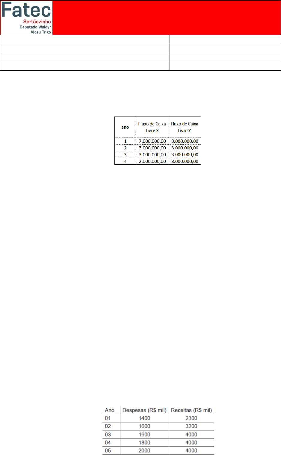 AVALIAÇÃO SUBSTITUTIVA NOME: RA: CURSO: Gestão Empresarial SÉRIE: 4º TURMA: DISCIPLINA: Análise de Investimento DATA: 05/04/2019 Professor: Silvânia Soares da Silva Santos Nota: 7 Questão 1- (1 ponto). Considere os projetos X e Y e seus fluxos de caixa, conforme tabela abaixo. Ambos os projetos exigem um investimento inicial de $ 10.000.000,00. A taxa de atratividade (custo de oportunidade para projetos com mesmo nível de risco dos projetos é 8% ao ano. Pede-se: a) Calcule o payback descontado, o VPL e a TIR de cada projeto; Questão 2- (1 ponto). Um gerente da Liquigás foi convidado a analisar a compra de um novo equipamento que custará R$ 1 milhão e gerará uma economia anual de R$ 200 mil durante 10 anos. O gerente usou o método de payback simples para avaliar a compra desse equipamento e chegou à conclusão de que o payback simples desse investimento é de A. 2 anos B. 4 anos C. 5 anos D. 8 anos E. 10 anos Questão 3- (1 ponto). Uma forma de realizar uma avaliação de um projeto é através do conceito de payback descontado. Assim, uma empresa desembolsa R$ 1.000,00 para executar um projeto no ano t e recebe como retorno R$ 900,00, R$ 100,00 e R$ 500,00 nos anos t+1, t+2 e t+3, respectivamente. Nesse caso, o payback descontado será A. de um ano. B. de dois anos. C. de três anos. D. entre um e dois anos. E. entre dois e três anos. Questão 4- (1 ponto). A Tabela a seguir apresenta as receitas e despesas anuais com a abertura de um novo depósito. O investimento inicial é estimado em R$ 5 milhões. Em relação à viabilidade do projeto sob o critério do pay-back simples, verifica-se que ele A. se paga até o final do período 2. B. se paga até o final do período 3. C. se paga até o final do período 4. D. gera um retorno de R$ 9,1 milhões. E. causa um prejuízo de R$ 8,4 milhões. Questão 5- (1 ponto). O Payback Descontado é uma técnica de análise de investimentos que: A. Informa o valor líquido de um investimento considerando o valor do dinheiro no tempo. B. Informa o tempo de retorno de um investimento considerando o valor do dinheiro no tempo. C. Informa o tempo de retorno de um investimento desconsiderando o valor do dinheiro no tempo. D. Informa a taxa de rentabilidade de um investimento considerando o valor do dinheiro no tempo. Questão 6- (1 ponto). Uma empresa transportadora está avaliando a aquisição de mais um caminhão no valor de R$ 150.000,00 para sua frota. Com base nas estimativas, a utilização desse novo veículo gerará, nos próximos quatro anos, fluxos de caixa anuais de R$ 22.000,00, R$ 60.500,00, R$ 66.550,00 e R$ 37.205,00. Ao final do quarto ano, espera-se, com a venda do veículo, obter um acréscimo de R$ 36.000,00 no respectivo fluxo de caixa. Considerando que a transportadora trabalha com uma taxa de retorno de 10% a.a., o Valor Presente Líquido (VPL) desse investimento, em R$, é de: A 5.600,00. B 9.000,00. C 11.500,00. D 20.000,00. E 31.200,00. Questão 7- (1 ponto). Uma empresa investiu R$ 110.000,00 em um projeto. O projeto dará um retorno de R$ 121.000,00 em exatos dois anos. O VPL que a empresa receberá, considerando uma taxa de retorno igual a 10% ao ano, será de A R$ 110.000,00. B R$ 100.000,00. C R$ 21.000,00. D – R$ 21.000,00. E - R$ 10.000,00.