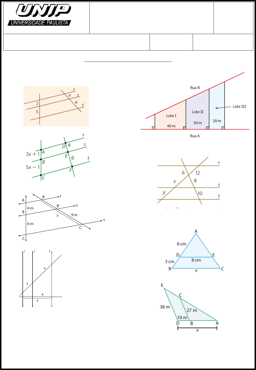 Curso: MATEMÁTICA (LICENCIATURA) Disciplina: GEOMETRIA PLANA Professor: STELLA PEREIRA Exercício de Sala 08 – PROPORCIONALIDADE Nome do aluno: RA: Turma: Exercício de Sala 08 – PROPORCIONALIDADE 1. Nas figuras a seguir, r // s // t. Em cada caso, calcule x. (a) (b) (c) (d) 2. Três terrenos têm frentes para a rua A e para a rua B, como mostra a figura. As divisas laterais são perpendiculares à rua A. Qual é a medida da frente para a rua B de cada lote, sa- bendo que a frente total para essa rua mede 180 m? 3. Na figura, r // s // t. Calcule xy. 4. Nas figuras, 𝐷𝐸̅̅ ̅̅ ∥ 𝐵𝐶̅̅ ̅̅ . Calcule x em cada caso. (a) (b) (c) 5. A sombra de um poste vertical, projetada pelo sol sobre um chão plano, mede 12 m. Neste mesmo instante, a som- bra de um bastão vertical de 1 m de altura mede 0,6 m. Qual a altura do poste? 6. Na figura abaixo considere que a medida da altura da árvore é 10 m, a distância entre ela e o observador é de 50 m e a distância da árvore ao ponto M é de 70 m. Consi- derando que o olho do observador, o topo da árvore e o topo da torre estão alinhados, qual é, aproximadamente, a medida da altura da torre? 7. Dados os triângulos ABC e DEF, isósceles de bases 𝐵𝐶̅̅ ̅̅ e 𝐸𝐹̅̅ ̅̅ , e sabendo que �̂� ≡ �̂� mostre que tais triângulos são se- melhantes. 8. Dos três triângulos desta figura (ΔABC, ΔBCD e ΔABD), há dois que são semelhantes. Quais são eles? 9. Determine a medida do lado 𝐴𝐵̅̅ ̅̅ . 10. Calcule x. 11. Dado ΔABC e um segmento 𝐷𝐸̅̅ ̅̅ , com D em 𝐴𝐵̅̅ ̅̅ e E em 𝐴𝐶̅̅ ̅̅ , prove que se 𝐴𝐷 𝐷𝐵 = 𝐴𝐸 𝐸𝐶 , então 𝐷𝐸̅̅ ̅̅ é paralelo a BC . Respostas: 1. (a) 1,6; (b) 1,25; (c) 15; (d) 6 2. 80 m, 60 m e 40 m, respectivamente 3. 320 4. (a) 12; (b) 40; (c) 9 5. 20 m 6. 24 m 7. Caso AA de semelhança 8. ΔABC e ΔABD 9. 21 10. 11,25 11. Considere E’ em 𝐴𝐶̅̅ ̅̅ , tal que 𝐷𝐸′̅̅ ̅̅ ̅ é paralelo a 𝐵𝐶̅̅ ̅̅ . Usando o teorema de Tales, prove que ce´= ce. Logo E’ = E e consequentemente 𝐷𝐸̅̅ ̅̅ é paralelo a 𝐵𝐶̅̅ ̅̅ .