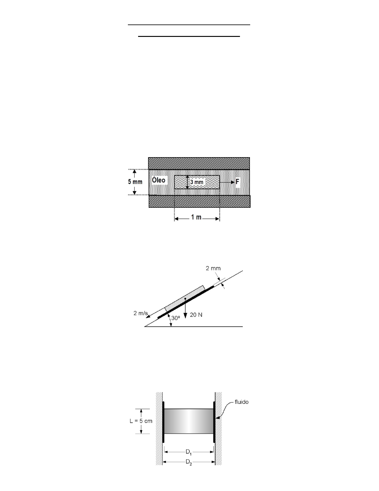 1 Lista– Fenômenos de Transporte 1 ponto, entrega individual. 1 MUNSON 1.29 – Um recipiente para transporte de refrigerante pesa 0,153 N e apresenta volume interno igual a 355 ml. Sabendo que o recipiente pode conter, no máximo, 0,369 Kg de refrigerante, determine o peso específico, a massa específica e a densidade do refrigerante. Compare os valores calculados com os da água a 20°C. Expresse seus resultados em SI. 2 Duas placas de grandes dimensões são paralelas. Considerando que a distância entre as placas é de 5 mm e que este espaço está preenchido com um óleo de viscosidade dinâmica 0,02 Ns/m², determine a força necessária para arrastar uma chapa quadrada de 1m de lado, espessura 3 mm, posicionada a igual distancia das duas placas, a uma velocidade constante de 0,15 m/s. 1 mm = 10-3 m. 3 (Exercício 1.5, pág. 12, Brunetti) Uma placa quadrada de 1.0 m de lado e 20 N de peso desliza sobre um plano inclinado de 30°, sobre uma película de óleo. A velocidade da placa é de 2 m/s constante. Qual a viscosidade dinâmica do óleo se a espessura da película é de 2 mm? 4 (Exercício 1.6, pág. 12, Brunetti) O pistão da figura tem uma massa de 0,5 kg. O cilindro de comprimento ilimitado é puxado para cima com velocidade constante. O diâmetro do cilindro é 10 cm e do pistão é 9 cm e entre os dois existe óleo com ν = 10-4 m2/s e γ = 8000 N/m3. Com que velocidade deve subir o cilindro para que o pistão permaneça em repouso? Dados: g = 9,81 m/s2; Scircunferência = πD.