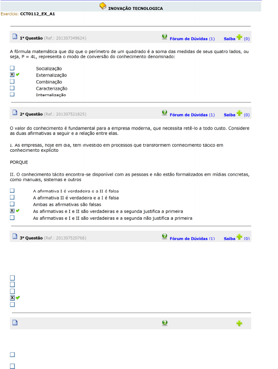 INOVAÇÃO TECNOLOGICA Exercício: CCT0112_EX_A1 1a Questão (Ref.: 201307349624) Fórum de Dúvidas (1) Saiba (0) A fórmula matemática que diz que o perímetro de um quadrado é a soma das medidas de seus quatro lados, ou seja, P = 4L, representa o modo de conversão do conhecimento denominado: Socialização Externalização Combinação Caracterização Internalização 2a Questão (Ref.: 201307521825) Fórum de Dúvidas (1) Saiba (0) O valor do conhecimento é fundamental para a empresa moderna, que necessita retê-lo a todo custo. Considere as duas afirmativas a seguir e a relação entre elas. I. As empresas, hoje em dia, tem investido em processos que transformem conhecimento tácico em conhecimento explícito PORQUE II. O conhecimento tácito encontra-se disponível com as pessoas e não estão formalizados em mídias concretas, como manuais, sistemas e outros A afirmativa I é verdadeira e a II é falsa A afirmativa II é verdadeira e a I é falsa Ambas as afirmativas são falsas As afirmativas e I e II são verdadeiras e a segunda justifica a primeira As afirmativas e I e II são verdadeiras e a segunda não justifica a primeira 3a Questão (Ref.: 201307520768) Fórum de Dúvidas (1) Saiba (0) Atualmente, o poder econômico e de produção de uma empresa estão mais diretamente relacionados à capacidade de criar e transferir conhecimento do que aos seus ativos tangíveis. Os ativos intangíveis são a chave para o sucesso e a longevidade das empresas num cenário extremamente competitivo. Com base no texto acima. Qual a alternativa apresenta duas características de ativo intangíveis? Máquinas e inovação. Equipamentos e criatividade. Inovação e equipamentos Criatividade e inovação. Instalação e inovação. 4a Questão (Ref.: 201307350514) Fórum de Dúvidas (1) Saiba (0) Nonaka & Takeuchi identificaram quatro modos de conversão para o processo de criação do conhecimento, dentre eles a combinação. Sobre combinação é correto afirmar que: é a sistematização de conceitos por meio da combinação de conjuntos diferentes de conhecimentos explícitos e outros conhecimentos oriundos das observações práticas. é visto no processo de criação de um conceito e, normalmente, é provocado pelo diálogo ou pela reflexão coletiva. é o processo de interação entre conhecimentos explícitos para geração de novos conhecimentos. é entendido como sendo um processo subjetivo e relacionado ao comportamento humano. é o processo de interação entre conhecimentos explícito e tácito 5a Questão (Ref.: 201307903269) Fórum de Dúvidas (1) Saiba (0) Analise as proposições abaixo sobre conversão do conhecimento e, em seguida, assinale a única alternativa correta: I) O conhecimento tácito é simples de ser articulado na linguagem formal. II) O conhecimento tácito possui natureza intangível e pessoal. III) Os conhecimentos tácito e explícito são complementares e suas interações proporcionam dinamismo às organizações. Se somente as afirmativas I e II estiverem corretas. Se somente as afirmativas II e III estiverem corretas. Se somente a afirmativa II estiver correta. Se somente a afirmativa I estiver correta. Se somente a afirmativa III estiver correta. 6a Questão (Ref.: 201307344080) Fórum de Dúvidas (1) Saiba (0) Analise as proposições abaixo sobre Conhecimento e Capital Intelectual: I - Entende-se como Conhecimento a soma de todos os pensamentos, criações e invenções da mente humana. O "conhecimento" não se encontra apenas nos documentos, nas bases de dados e nos sistemas de informação, mas também nos processos de negócio, nas práticas dos grupos e na experiência acumulada pelas pessoas para aumentar sua produtividade e conquistar novas oportunidades. II - O Conhecimento Explícito é aquele que o indivíduo adquiriu ao longo da vida, que está na cabeça das pessoas. Geralmente é difícil de ser formalizado ou explicado a outra pessoa, pois é subjetivo e inerente as habilidades de uma pessoa. III - O capital intelectual é um valor mensurável devido a uma nova sociedade que surge onde pressupõe uma mudança de cultura refletindo nas organizações, ou seja, capital intelectual ou conhecimento é gerenciar o conhecimento de funcionários. IV - O conhecimento Tácito é aquele formal, claro, regrado, fácil de ser comunicado. Pode ser formalizado em textos, desenhos, diagramas, etc. assim como guardado em bases de dados ou publicações. É incorreto afirmar as proposições: I, III e IV II, III e IV I e III II e IV Somente a I INOVAÇÃO TECNOLOGICA Exercício: CCT0112_EX_A2 1a Questão (Ref.: 201307530079) Fórum de Dúvidas (0) Saiba (0) Para que o conhecimento esteja em constante processo de difusão, é necessário que seja transferido do local onde foi criado para outras organizações. Qual o fator que inibe esse processo de transferência? Apropriação do conhecimento Universalidade do conhecimento Tempo despendido no processo Atritos Implicitabilidade 2a Questão (Ref.: 201307344119) Fórum de Dúvidas (0) Saiba (0) A Flutuação e Caos é definida com uma das cinco condições de nível organizacional que promovem a criação do conhecimento, portanto pode-se definir esta condição como: É a existência de informações que transcendem as exigências operacionais imediatas dos membros da organização. Refere-se à superposição intencional de informações sobre atividades da empresa, responsabilidades da gerência e sobre a empresa como um todo. É definida como a interação entre a organização e o ambiente externo, onde envolve rotinas, hábitos ou estruturas cognitivas. Quando introduzida em uma organização, seus membros enfrentam um colapso de rotinas, hábitos ou estruturas cognitivas. Um colapso refere-se a uma interrupção de nosso estado de ser habitual e confortável. É a forma como todos os membros de uma organização agem de acordo com as circunstâncias para introduzir oportunidades inesperadas e moti