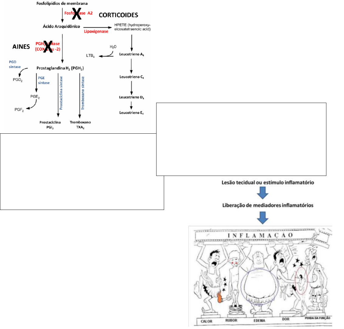 Ainti-inflamatórios não esteroidai (aines) Como funcionam? Mediadores da inflamação – São ativados pelas prostaglandinas Histamina à Liberadas pela ativação de mastócitos e plaquetas; promove vasodilatação e aumento da permeabilidade vascular. Bradicinina à é um peptídeo vasoativo, que atua induzindo vasodilatação e aumento da permeabilidade vascular; ativa potentemente os nociceptores (induz aumento do influxo de sódio nesses neurônios , provocando dor de curta duração). Importante pq causa despolarização dos nêuronios. Responsavél pelo aumento da dor. Óxido nítrico à potente vasodilatador e induz aumento da permeabilidade vascular. Citocinas - IL-1β, TNF alfa, IL-6 e quimiocinas AINES interferem na cicloxigenase Corticoides comprometem a formação do ácido araquidônico. Os corticoides atravessam a membrana sem precisar de receptor, pois seu receptor está no citosol, seu receptor é nuclear e quando penetram formam um homodímero (ligante corticoide ligado ao receptor) que migra para o núcleo e ativa a síntese de tudo que é anti-inflamatório (IL10 por exemplo) e diminui a síntese de tudo que é inflamatório. Estimulação de células inflamatórias - liberação de mediadores inflamatórios • Quimiocinas - Acúmulo e ativação de leucócitos. IL-8 atrai leucocitos • Ingestão e destruição de microorganimos por leucócitos fagocíticos A fosfatase A2 incentiva a clivar nesse fosfolipideo de membrana a cadeia de acido graxo contendo ácido aracdonico, o acido araquidonico é um ácido graxo que serve de substrato para complexos enzimaticos, como ciclooxigenases e lipooxigenases. A via do ácido araquidonico é mais importante a cicloxigenases (PH2 sintates (no momento). O tromboxino provoca vasoconstrição e prostaciclina vasodilatação Acido araquidonico como substrato para a via das cicloxigenases que vão converter ácido araquidonico em Prostaglandinas 2 que por sua vez gera é substrato para outras enzimas. Por exemplo, nas paquetas tem muito tromboxano sintase, quando há estimulo para transformar ácido araquidônico, ela forma tromboxano. Já nas celulas endotéliais tem mais prostaciclinas enão o ácido araquidônico vira prostaciclinas. Medicamentos AINES Mecanismo de ação Incentiva a clivar nesse fosfolipideo de membrana a cadeia de acido graxo contendo ácido aracdonico, o acido araquidonico é um ácido graxo que serve de substrato para complexos enzimaticos, como ciclooxigenases e lipooxigenases. A via do ácido araquidonico é mais importante a cicloxigenases (PH2 sintates (no momento). Acido araquidonico como substrato para a via das cicloxigenases que vão converter ácido araquidonico em Prostaglandinas 2 que por sua vez gera é substrato para outras enzimas. Por exemplo, nas paquetas tem muito tromboxano sintase, quando há estimulo para transformar ácido araquidônico, ela forma tromboxano. Já nas celulas endotéliais tem mais prostaciclinas enão o ácido araquidônico vira prostaciclinas. O tromboxino provoca vasoconstrição e prostaciclina vasodilatação COX-1: constitutiva (no TGI, rins e plaquetas tem função homeostática). Quase não aumenta, sua inibição causa dores e até trombos! COX-2: Mantém a resposta inflamatória, induzida nas células inflamatórias ativadas por lesão celular, infecção, citocinas pró-inflamatórias (ativadas por IL-1β e TNF-α); induzida em células neoplásicas. Inicialmente detectada em tecidos inflamados. Sua expressão é induzida por estímulos pró-inflamatórios e inibida por substâncias anti-inflamatóri, diante de um quadro inflamatório a expressão da COX-2 aumenta cerca de 20x ou mais. Constitutiva principalmente nos rins, cérebro e endotélio (shear stress, quando o sangue bate nas células endoteliais estimula a produção de cox2 constitutiva). Agressão tecidual • Produção de mediadores químicos • Alterações hemodinâmicas • Quimiotaxia • Sensibilização de nociceptores • Dor proporcional ao estímulo 1) Inibição da COX Impedem o acesso do AA aos sítios ativos da COX pela ligação de hidrogênio com uma arginina: efeito reversível Efeitos dos AINES Efeito antipirético Hipotálamo: centro termorregulador à importante para o equilíbrio entre perda e produção de calor Efeito analgésico PGs e Nociceptores Sensibilizam os nociceptores aumentando a ação de mediadores da dor (ex: bradicinina) Ação dos AINES: Efeito analgésico por reduzir a síntese de PGs Cardioproteção Plaquetas: COX-1 relacionada à síntese de tromboxano A2 (TXA2): Vasoconstrição e agregação plaquetária Ácido acetil salicílico (AAS): inibição irreversível da COX (por acetilação da serina da enzima) Redução da síntese de TXA2 = vasodilatação e menor risco de trombose AAS reduz em 25% o risco de IAM PGs e a homeostase corporal: Sistema Renal Papel biológico: PGE2 e PGI2 (prostaciclina) mantém a dinâmica sanguínea renal (COX 1 e 2) - Sintetizados em resposta à vasoconstritores como angiotensina, promovem vasodilatação compensatória - Aumento do fluxo renal: diurese Redução da PA - Inibição do ADH: reduz reabsorção de água à diurese (ADH: hormonio antidiuretico) Efeito dos AINES: - Diminuem o fluxo sanguíneo renal e a taxa de filtração glomerular -à redução da diurese - aumento da PA Aspirina Acetilação direta da COX no resíduo da serina: ação irreversível. Compromete as plaquetas até elas morrerem, pois elas não tem núcleo para sintetizar uma nova cox1, já que ela bloqueia a cox1 Pq reduz em 25% o IAM PGs e a homeostase corporal: TGI Papel biológico: PGE2 e PGI2 participam da manutenção da mucosa gástrica Inibem a secreção de ácido gástrico Aumentam a secreção do muco citoprotetor Aumentam o fluxo sanguíneo da mucosa Efeito dos AINES: Redução do efeito protetor Irritação local pelo contato do fármaco com a mucosa Em uso crônico à úlceras e sangramentos no TGI Utéro e ovarios Maior contribuiçã