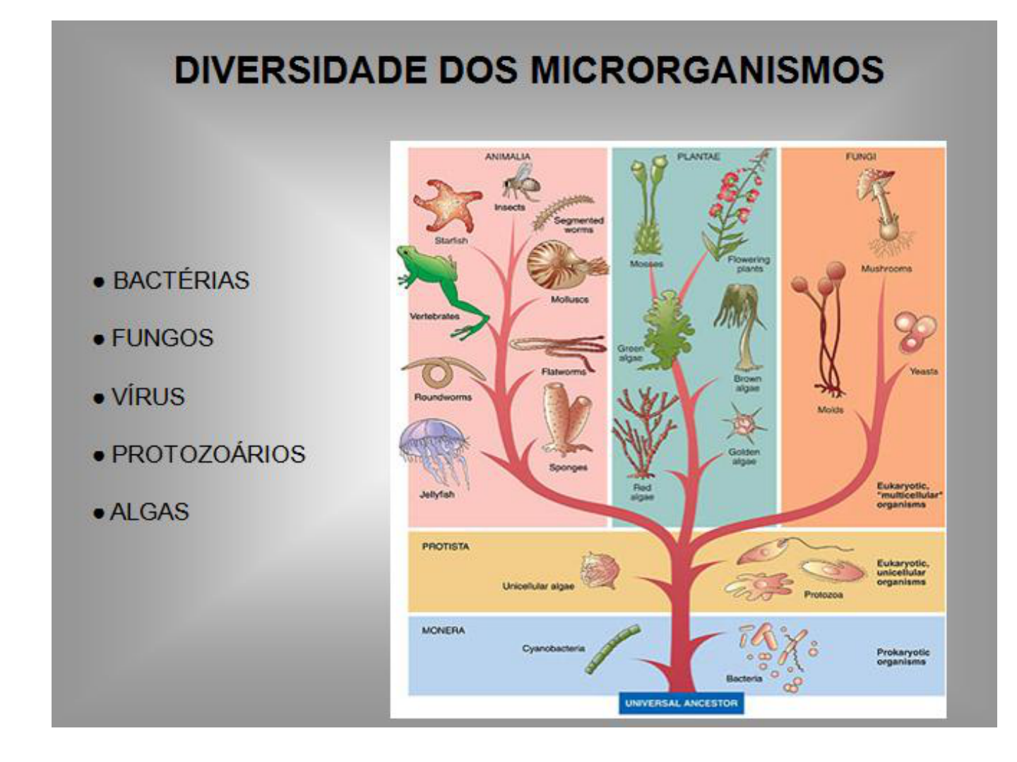 DOMÍNIOS Bacteria (todas as bactérias procariontes) Eukarya (todos os eucariontes) Monera Archaea (procariontes que vivem em ambientes extremos da Terra arqueobactérias) Protoctista Fungi Planthae Animalia 5 REINOS POSIÇÃO DOS MICRORGANISMOS NA CLASSIFICAÇÃO DOS SV Vírus - acelular Relembrando Principais regras da nomenclatura científica: O nome do organismo é binominal, o primeiro indica o gênero e o segundo indica o epíteto específico. Ex. Phaseolus vulgares (feijão) O nome da espécie deve ser escrito em latim de origem ou, então, latinizados, itálico ou grifado (em separado). Ex. Trypanosoma cruzi ou Trypanosoma cruzi (protozoário causador da doença de Chagas) A inicial do termo indicativo do gênero deve ser escrito com letra maiúscula; a da espécie, com letra minúscula. Ex. Homo sapiens espécie Ex. Mycobacterium tuberculosis hominis (tuberculose humana) Mycobacterium tuberculosis bovis (tuberculose bovina) Mycobacterium tuberculosis avis (tuberculose aviária) Principais regras da nomenclatura científica: Quando o nome da espécie se refere a uma pessoa, a inicial pode ser maiúscula ou minúscula. Trypanosoma cruzi ou Trypanosoma Cruzi (o termo cruzi se refere ao médico Oswaldo Cruz) Quando aparece pela primeira vez em um texto, o nome científico deve ser escrito por extenso, nas demais vezes, pode-se abreviar o gênero. Ex. Felis catus (gato doméstico) F. catus Se desejarmos mencionar o autor da descoberta, seu nome virá após o termo binominal, sem pontuação e sem grafia diferenciada do texto. A data da descrição dessa espécie vem após o seu nome, separada por vírgula ou entre parênteses Ex. Zea mays Lineu, 1758 ou Zea mays Lineu (1758) - milho (geralmente) Canis sp. - Referência a uma única espécie do gênero Canis (ex. Canis familiares) Canis spp. - Referência a várias espécies do mesmo gênero (ex. Canis familiares - cão, C. lupus - raposa, C. latrans - coiote) • Montifringilla theresae • Sylvia nana theresae • Melierax metabates theresae • Alectoris barbata theresae • Scotocercainquieta theresae • Galerida theklae theresae • Oenanthe moesta theresae • Riparia rupestris theresae • Garrulus glandarius theresae • Turdus viscivorus theresae • Emberiza striolata theresae • Coccothraustes coccothraustes theresae Essa são algumas das várias espécies e subspécies de pássaros nomeados por Richard Meinertzhagen após conhecer Theresa Clay(“amiga” 33 anos mais jovem) CURIOSIDADE (vários pássaros) BACTÉRIAS Características gerais • Procariontes • Unicelulares • Heterótrofos (a maioria) • Autótrofos fotossintetizantes (alguns) • Autótrofos quimiossintetizantes (a minoria) As bactérias são os menores micro-organismos unicelulares existentes, medindo geralmente de 1 a 1,5 µm de largura por 2 a 6 µm de comprimento Bactérias - Morfologia (espiralada e rígida) Espiroqueta: Treponema pallidum (Sífilis) vibrião: Vibrio cholerae (cólera) Espirilo: Leptospira spp. Bactérias - Morfologia Arranjos cúbicos -8 Tamanhos: de 0,3 a 15µm bacilos cocos Diplococos – Neisseria gonorrheae (gonorreia) Estrutura e componentes bacterianos Estrutura e componentes bacterianos Nucleossomo DNA + histonas Recordando cromossomos Recordando MEMBRANA CITOPLASMÁTICA OU MEMBRANA PLASMÁTICA MEMBRANA CITOPLASMÁTICA OU MEMBRANA PLASMÁTICA – FUNÇÕES 1) TRANSPORTE DE SOLUTOS #A membrana plasmática atua como uma barreira altamente seletiva, impedindo a passagem livre de moléculas e íons, possibilitando a concentração de metabólitos específicos dentro da célula. # A excreção de substâncias inúteis também é feita através da membrana. # O transporte de substâncias através da membrana do meio externo para o interno acontece com o auxílio de “proteínas de transporte de membrana”. Transporte pela membrana plasmática osmose “proteínas de transporte de membrana” Transporte ativo osmose MEMBRANA CITOPLASMÁTICA OU MEMBRANA PLASMÁTICA – FUNÇÕES 2) PRODUÇÃO DE ENERGIA POR TRANSPORTE DE ELÉTRONS E FOSFORILAÇÃO OXIDATIVA # Função análoga à da membrana interna das mitocôndrias (células eucarióticas), devido a presença dos citocromos e de enzimas da cedeia de transporte de elétrons. 3) BIOSSÍNTESE # A membrana citoplasmática atua como sede de enzimas para formação da parede celular e de lipídios da membrana. MEMBRANA CITOPLASMÁTICA OU MEMBRANA PLASMÁTICA – FUNÇÕES 4) DUPLICAÇÃO DO DNA/DIVISÃO CELULAR # Algumas das proteínas do complexo de duplicação de DNA estão localizadas na membrana plasmática. 5) SECREÇÃO # A membrana está envolvida na secreção de enzimas hidrolíticas que têm como função degradar (romper) macromoléculas em subunidades que servirão como nutrientes. 6) QUIMIOTAXIA A resposta quimiotáxica envolve a atuação de proteínas de membrana. PAREDE CELULAR Composição química é diferente dos vegetais (celulose) e fungos (quitina). É formada basicamente por PEPTÍDEOGLICANO que são moléculas de carboidratos ligadas a aminoácidos. O PEPTÍDEOGLICANO é uma molécula constituída por 2 açúcares aminados N-acetil-glicosamina e o ácido N-acetil-murâmico, os quais estão ligados um ao outro, intercaladamente. Nas moléculas do ácido N-acetil-murâmico estão ligados os peptídeos. NAM NAG PAREDE CELULAR Pelo método de Gram, as bactérias podem ser classificadas em gram-positivas e gram-negativas. 70 a75% da parede é composta por peptidioglicano Ácido lipotecóico (possibilita a entrada de cátions) - Regulam a atividade das autolisinas durante a divisão celular (enzimas que rompem o peptidioglicano em pontos específicos) - Serve de sítio de ligação com o epitélio do hospedeiro em algumas bactérias patogênicas Parede celular de bactérias Gram-negativas - Mais complexas que as paredes celulares de G+, as paredes das G- possuem uma membrana externa cobrindo uma camada fina de peptideoglicano . - A camada de peptideoglicano das
