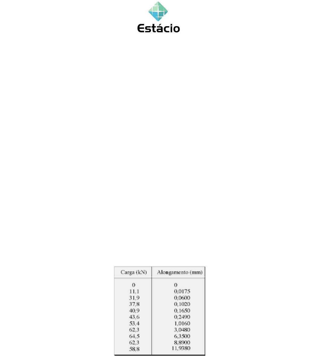 CURSO: ENGENHARIA MECÂNICA PROFESSOR (A): ELENILDO SILVA DISCIPLINA: ENSAIOS MECÂNICOS ALUNO(A):_______________________________________________________________ Exercícios 1 - Os ensaios mecânicos fornecem informações sobre as propriedades mecânicas dos materiais, quando submetidos a esforços externos, expressos na forma de tensões e deformações. Basicamente, o comportamento mecânico dos materiais depende da composição química, da microestrutura, da temperatura e das condições de carregamento. Tais informações são fundamentais para que o engenheiro projetista possa selecionar os materiais que contemplem as especificações mecânicas estabelecidas no projeto. Considerando o exposto, analise as afirmações a seguir. I. A tenacidade é uma medida da energia que material suporta antes da ruptura de um material. II. Um corpo de prova de material, quando submetido a um ensaio de torção, falha por cisalhamento. Esse fato é observado pelo rompimento do corpo de prova ao longo da superfície que forma um ângulo de 30° em relação ao eixo longitudinal. III. O ensaio de flexão permite a caracterização do comportamento dúctil frágil do material por meio da medição da energia absorvida pelo material até a fratura. IV. A partir do limite de escoamento do material, o material entra em colapso e deforma-se elasticamente. Isso se deve à redução do módulo de tenacidade. É correto apenas o que se afirmar em: a) I e IV. b) I e III. c) II e III. d) I e IV. e) II, III e IV. 2 - Foi realizado um teste de tensão em um corpo de prova de aço com diâmetro original de 12,5mm e comprimento de referência de 50 mm. Os dados estão relacionados na tabela. Construir o diagrama tensão-deformação e determinar aproximadamente o módulo de elasticidade e a tensão de engenharia. 3 - O que caracteriza um material frágil é o fato do ensaio de tração: a) apresentar ruptura após grandes deformações. b) apresentar escoamento definido. c) mostrar um limite de proporcionalidade plenamente definido. d) não apresentar um escoamento definido. e) apresentar ruptura sem que ocorra antes uma deformação visível. 4 - Uma barra de aço com 100 mm de comprimento e que possui uma seção reta quadrada com 20 mm de aresta é puxada em tração com uma carga de 89000 N, e experimenta um alongamento de 0,1 mm. Admitindo que a deformação é inteiramente elástica, calcule o módulo de elasticidade do aço. 5 - Um corpo de prova em ferro fundido dúctil, que possui uma seção reta retangular com dimensões de 4,8 mm x 15,9 mm, é deformado em tração. Usando os dados de carga-alongamento tabulados abaixo, responda às questões a seguir: (a) Plote os dados na forma de tensão x deformação; (b) Calcule o módulo de elasticidade; 6- Qual a diferença entre os ensaios destrutiveis e não destrutiveis? 7 - Um corpo de prova de aço comum (0,2%C) com as mesmas dimensões da questão 1 é ensaiado por tração. Qual o alongamento sofrido pelo corpo de prova se a carga aplicada no ensaio atingir 31,7 kN? Qual o comprimento final da parte útil do corpo de prova ? 8 - Identifique os pontos mostrados no gráfico. 9 – O que é o ensaio de compressão e como ele é realizado? 10 - Sabendo que um ferro fundido apresenta 200 MPa de resistência à tração, qual o valor aproximado da resistência à compressão deste material?
