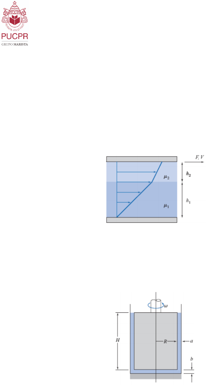 Página 1 Pontifícia Universidade Católica do Paraná – PUCPR Escola Politécnica Campus Sede – Curitiba/PR Engenharia de Computação / Elétrica / Eletrônica / Cont. e Automação / Ambiental / Produção Disciplina de Introdução aos Fenômenos de Transporte Professor: Leonardo Cavalheiro Martinez Parte 1 – Mecânica dos Fluidos – Lista de Exercícios Nome do(a) Aluno(a): ______________________________________________________Data: ___/___/______ --------------------------------------------------------------------------------------------------------------------------------------------------- Conceitos Introdutórios de Mecânica dos Fluidos Questão 01 - Dois fluidos distintos com viscosidades 1μ 0,1N s / m² e 2μ 0,15N s / m² estão contidos entre duas placas (cada paca tem área de 1 m²), conforme mostrado na Figura 1. As espessuras são 1h 0,5mm e 2h 0,3mm , respectivamente. Dessa forma, determine (a) a velocidade do fluido na interface entre os dois fluidos e (b) a força F necessária para fazer com que a placa superior se mova a uma velocidade de 1 m/s. Figura 01 – Referente à Questão 01 Questão 02 - Um viscosímetro de cilindros concêntricos é mostrado na Figura 02. O torque viscoso é produzido pela folga anular em torno do cilindro interno. Um torque viscoso adicional é produzido pelo fundo plano do cilindro interno à medida que gira acima do fundo plano do cilindro externo estacionário. Obtenha expressões algébricas para (a) o torque viscoso devido ao escoamento na folga anular de largura “a” e para (b) o torque viscoso devido ao escoamento na folga do fundo de altura “b”, sabendo que neste ponto a distribuição de velocidades varia em função do raio. Figura 02 – Referente à Questão 02 Questão 03 - Um eixo com diâmetro externo de 18 mm gira a 20 rotações por segundo dentro de um mancal de sustentação estacionário de 60 mm de comprimento. Uma película de óleo com espessura de 0,2 mm preenche a folga anular entre o eixo e o mancal. O torque necessário para girar o eixo é de 0,0036 N.m. Estime a viscosidade do óleo que preenche a folga anular. Questão 04 - Um bloco de massa “M” desliza sobre uma fina película de óleo. A espessura da película é “h” e a área do bloco é “A”. Quando liberada, a massa “m” exerce tração na corda, causando a aceleração do bloco. Despreze o atrito na polia e a resistência do ar. Faça o que se pede: (a) Desenvolva uma expressão algébrica para a força viscosa que atua sobre o bloco quando ele se move à velocidade “V”. (b) Deduza uma equação Página 2 diferencial para a velocidade do bloco como uma função do tempo. (c) Obtenha uma expressão algébrica para a velocidade do bloco em função do tempo. Figura 03 – Referente à Questão 04 Equações Integrais de Conservação de Massa e Quantidade de Movimento Questão 05 - Considere o escoamento incompressível e permanente através do dispositivo mostrado na Figura 04. Determine o módulo e o sentido da vazão volumétrica através da Porta 3. Figura 04 – Referente à Questão 05 Questão 06 - Um fluido com massa específica de 1040 kg/m³ flui em regime permanente através da caixa retangular mostrada na Figura 05. Dados A1 = 0,046 m², A2 = 0,009 m², A3 = 0,056 m², ⃗⃗ m/s e ⃗⃗ m/s. Considerando estas informações, determine ⃗⃗ . Figura 05 – Referente à Questão 06 Questão 07 - No escoamento incompressível através do dispositivo mostrado na Figura 06, as velocidades podem ser consideradas uniformes em todas as seções de entrada e de saída. As seguintes condições são conhecidas: A1 = 0,1 m², A2 = 0,2 m², A3 = 0,15 m², m/s e m/s (t em segundos). (a) Obtenha uma expressão para a velocidade na Seção 3. (b) Determine a vazão volumétrica total média na Seção 3. Figura 06 – Referente à Questão 07 Questão 08 - Óleo escoa em regime permanente formando uma fina camada em um plano inclinado para baixo. Expresse a vazão mássica por unidade de largura em termos de O perfil de velocidade é dado por: Página 3 2ρgsenθ y u hy μ 2 Figura 07 – Referente à Questão 08 Questão 09 - Água escoa em regime permanente através de um tubo de comprimento L e raio R = 75 mm. Calcule a velocidade de entrada uniforme, U, se máxu 3m / s e considerando que a distribuição de velocidade através da saída é dada por: 2 máx u r 1 u R Figura 08 – Referente à Questão 09 Questão 10 - Calcule a força requerida para manter o tampão cilíndrico fixo na saída do tubo de água. A vazão é 1,5 m3/s e a pressão manométrica a montante é 3,5 MPa. Figura 09 – Referente à Questão 10 Questão 11 - Uma placa vertical tem um orifício de bordas vivas no seu centro. Um jato de água com velocidade V atinge a placa concentricamente. Obtenha uma expressão para a força externa xR requerida para manter a placa no lugar, se o jato que sai do orifício também tem velocidade V. Figura 10 – Referente à Questão 11 Questão 12 - A água escoa em regime permanente para cima no interior do tubo vertical de 0,1 m de diâmetro e é descarregada para a atmosfera através do bocal que tem 0,05 m de diâmetro. A velocidade média do escoamento na saída do bocal deve ser de 20 m/s. Calcule a pressão manométrica mínima requerida na Seção 1. Página 4 Figura 11 – Referente à Questão 12 Questão 13 - Um bocal é um dispositivo para medir a vazão em um tubo. Este bocal específico deve ser usado para medir um escoamento de ar com baixa velocidade para o qual a compressibilidade pode ser desprezada. Durante a operação, as pressões p1 e p2 são registradas. Determine uma equação para a vazão mássica na Seção 2 em função de Δp = p2 − p1 e os diâmetros do dispositivo, D1 e D2. Considere o escoamento sem atrito e despreze os efeitos da gravidade. Figura 12 – Referente à Questão 13 Escoamento Viscoso e Incompressível Questão 14 - Medidas foram feitas para a configuração d
