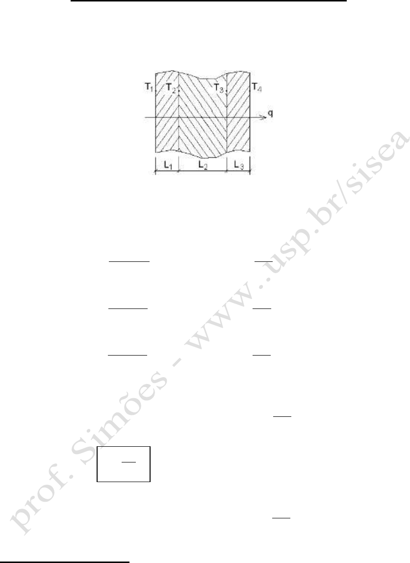 Notas de aula de PME 3361 – Processos de Transferência de Calor ____________________________ http://www.usp.br/sisea/- © José R. Simões Moreira – atualização Agosto/2016 21 AULA 4 – PAREDES PLANAS COMPOSTAS Condução unidimensional, regime permanente, sem geração de calor – paredes compostas. Para resolver de forma rápida e simples este problema, note que o fluxo de calor q é o mesmo que atravessa todas as paredes. Assim, para cada parede pode-se escrever as seguintes equações: - parede 1: 1 21 1 )( L TT Akq    Ak qL TT 1 1 21  - parede 2: 2 32 2 )( L TT Akq    Ak qL TT 2 2 32  - parede 3: 3 43 3 )( L TT Akq    Ak qL TT 3 3 43  Assim, somando os termos _____________ de todas as paredes: Ak L qTT i i 41 ou, simplesmente, R T q   Onde, T refere-se à diferença total de temperaturas da duas faces externas e R é a resistência térmica da parede composta, dada por Ak L R i i ANALOGIA ELÉTRICA Nota-se que existe uma analogia elétrica perfeita entre fenômenos elétricos e térmicos de condução de calor, fazendo a seguinte correspondência: qi  TU  TÉRMICOÔHMICO RR  Notas de aula de PME 3361 – Processos de Transferência de Calor ____________________________ http://www.usp.br/sisea/- © José R. Simões Moreira – atualização Agosto/2016 22 Por meio de analogia elétrica, configurações mais complexas (em série e paralelo) de paredes podem ser resolvidas. Circuito elétrico equivalente Fluxo de calor que é: T total R T q   5//1 RRRRT  com 432// 1111 RRRR  Resistência térmica de contato Quando as superfícies de dois sólidos são colocadas em contato para formar uma parede composta, a região interfacial entre eles pode ter uma resistência térmica de contato, 𝑅𝑡,𝐶 " , devido ao fato de que não existe uma contato “perfeito” entre as duas superfícies, como ilustrado abaixo, devido à rugosidade superficial. A transferência de calor se dará por condução nos pontos de contato dos picos das rugosidades e pela condução através do fluido que preenche o espaço entre as superfícies. Radiação térmica também pode estar presente. q Notas de aula de PME 3361 – Processos de Transferência de Calor ____________________________ http://www.usp.br/sisea/- © José R. Simões Moreira – atualização Agosto/2016 23 A resistência térmica de contato é dada por 𝑅𝑡,𝐶 " = 𝑇𝐴 − 𝑇𝐵 𝑞𝑥" Alguns valores de resistência térmica estão indicados na Tabela 3.2 do livro do Incropera, reproduzida a seguir. CONDUÇÃO EM PLACA PLANA COM GERAÇÃO INTERNA DE CALOR Geração interna de calor pode resultar da conversão de uma forma de energia em calor. Exemplos de formas de energia convertidas em calor: 1. Geração de calor devido à conversão de energia elétrica em calor (efeito Joule) 2RIP  (W) Onde: P : potência elétrica transformada em fluxo de calor por efeito Joule (W) R : resistência ôhmica ( ) I : corrente elétrica (A) Ainda, U : diferença de potencial elétrico (V) UIP  ou R U P 2  Em termos volumétricos, ''' Gq )/( 3mW , V P qG  ''' (W/m 3 ), onde V : volume onde o calor é gerado. 2. Geração de calor devido a uma reação química exotérmica )0( ''' Gq como, por exemplo, o calor liberado durante a cura de resinas e concreto. Já, no caso de uma reação endotérmica, 0 ''' Gq . 3. Outras formas tais de geração de calor devido à absorção de radiação, nêutrons, etc... Notas de aula de PME 3361 – Processos de Transferência de Calor ____________________________ http://www.usp.br/sisea/- © José R. Simões Moreira – atualização Agosto/2016 24 Parede (placa) plana com geração de calor uniforme (resistência elétrica plana). Lb  T1 T2 2 L 2b i Equação geral t T k q T G     1 ''' 2 , sendo que 0   t T (regime permanente) 0 ''' 2  k q T G )(xTT  Condições de contorno: (1) Lx  1TT  (2) Lx  2TT  Solução Seja a seguinte mudança de variável (apenas por conveniência): dx dT  , Então k q dx d G '''    Integrando essa equação por partes, vem:     1 ''' Cdx k q d G , mas como 1 ''' então , Cx k q dx dT dx dT G  Notas de aula de PME 3361 – Processos de Transferência de Calor ____________________________ http://www.usp.br/sisea/- © José R. Simões Moreira – atualização Agosto/2016 25 Integrando novamente: Obs.: Trata-se de uma distribuição parabólica de temperaturas.  Como no caso da resistência elétrica ''' Gq (geração de calor) é positivo e, claro, k também é positiva, a constante que multiplica o termo 2x é negativa  parábola com a concavidade voltada para baixo. Por outro lado, se ''' Gq for negativo, o que pode ocorrer com processos de curas de algumas resinas (processos endotérmicos), então a concavidade será voltada para cima. Determinação das constantes 1C e 2C : Condições de contorno (1) 21 2''' 1 2 CLC k Lq T G  - temperatura da face esquerda conhecida (2) 21 2''' 2 2 CLC k Lq T G  - temperatura da face direita conhecida Somando (1)+(2), vem: 2 2''' 21 2C k Lq TT G     k LqTT C G 22 2''' 21 2    . Substituindo em (1) ou (2), tem-se L TT C 2 12 1   Então, a distribuição final de temperaturas é:  CASOS: (A) Suponha que as duas faces estejam à mesma temperatura: STTT  21 . Daí, resulta que: 21 2''' 2 )( CxC k xq xT G    22 )( 2 )( )( 2112 22''' TT L x TT k xLq xT G     S G T k xLq xT    2 )( )( 22''' Notas de aula de PME 3361 – Processos de Transferência de Calor ____________________________ http://www.usp.br/sisea/- © José R. Simões Moreira – atualização Agosto/2016 26 É uma distribuição simétrica de temperaturas. A máxima temperatura, nesse caso, ocorre no plano central, onde 0x (note a simetria do problema). Se for o caso pouco comum de uma reação endotérmica, ou ''' Gq < 0, a concavidade seria voltada para abaixo e, no plano central, haveria a mínima temperatura. Também poderia se chegar a essa expressão usando 0 dx dT S G CMÁX T k Lq TT  2 2''' O fluxo de calor (lei de Fourier) dx dT kAq  ou, o fluxo de calor por unidade de