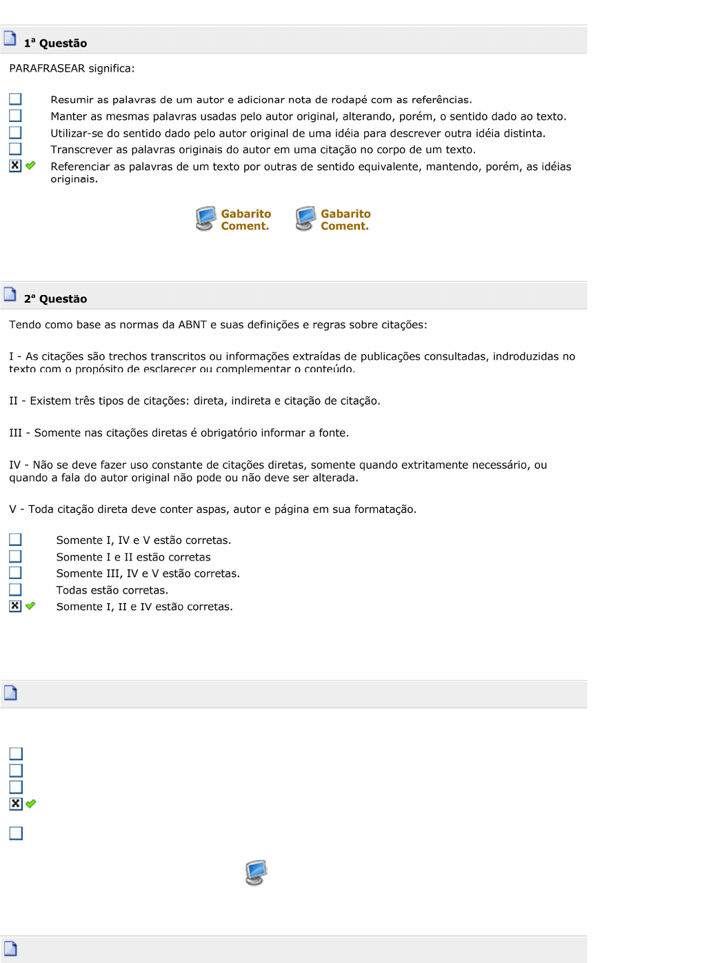 Transcrição ou cópia literal de parágrafo, de frase ou de expressão usando exatamente as mesmas palavras usadas pelo autor do trabalho consultado. Essa é a definição de: Citação de citação. Citação parafraseada. Citação direta. Citação indireta. Citação longa.