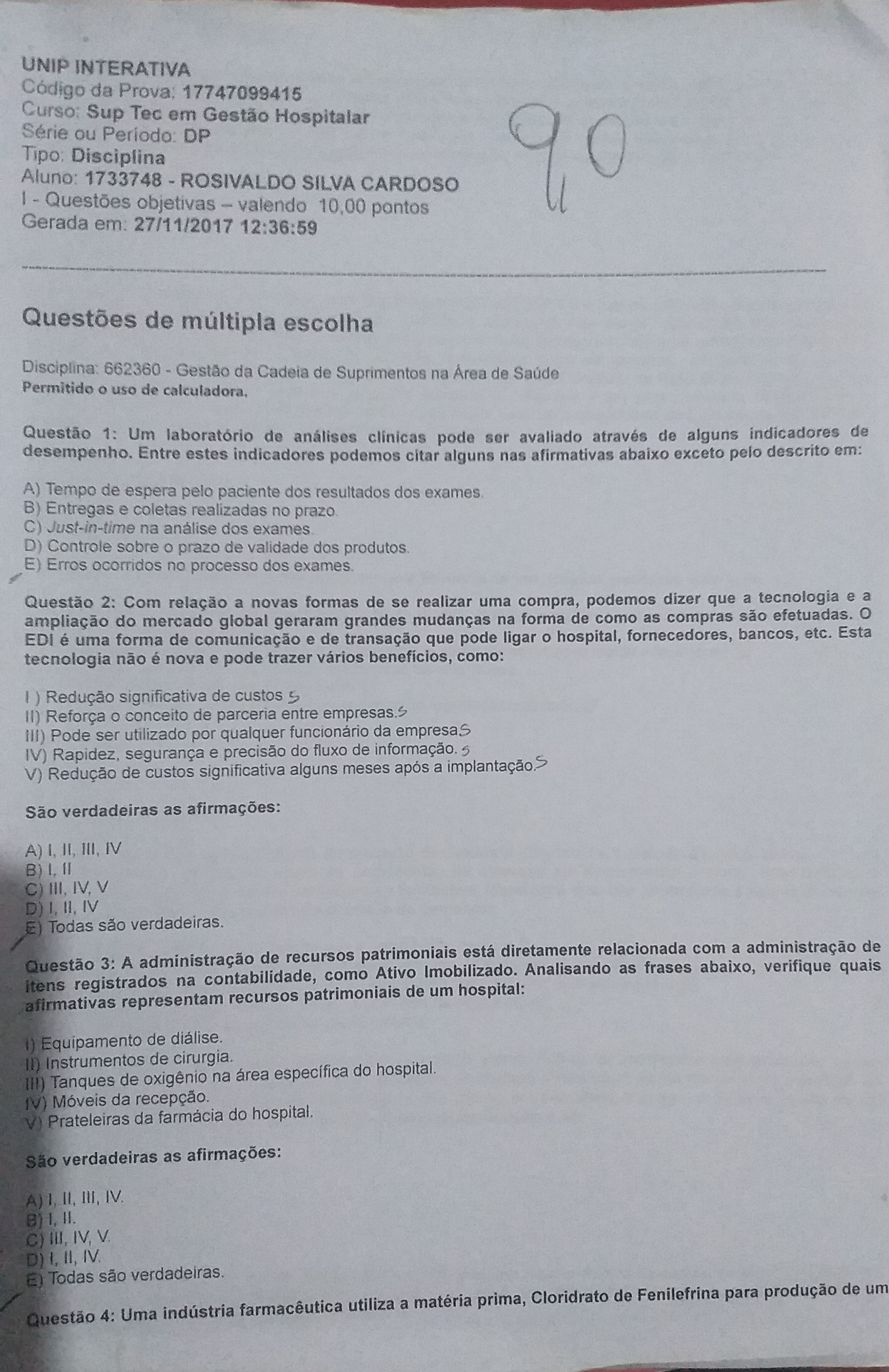 Com relacao a novas formas de se realizar uma compra, podemos dizer que a tecnologia e a ampliacao do mercado global geraram grandes mudancas na forma de como as compras sao efetuadas. EDI uma forma de comunicacao e de transacao que pode ligar hospital, fornecedores, bancos, etc. Esta tecnologia nao e nova e pode trazer varios beneficios, como: Reducao significativa de custos. sao verdadeiras as afirmacoes: I) Reforca conceito de parceria entre empresas. II) Pode ser utilizado por qualquer funcionario da empresas. III) Rapidez, seguranca e precisao do fluxo de informacao. IV) Reducao de custos significativa alguns meses apos a implantacao. A) II, III, IV B) 11 C) III, IV, V D) IV E) Todas sao verdadeiras.