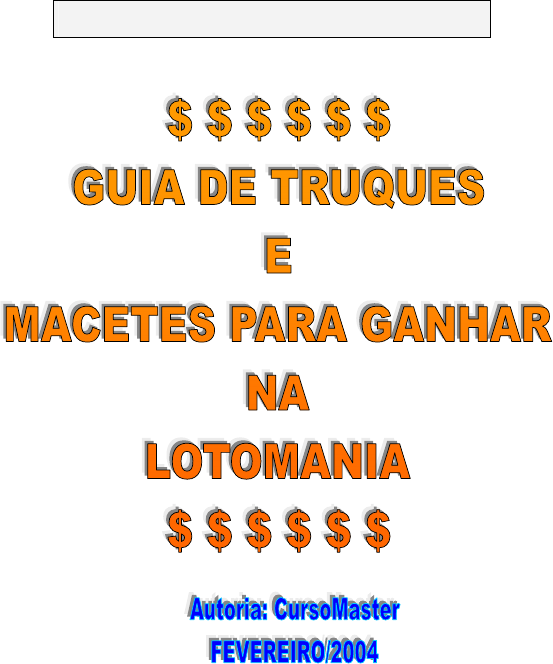 Este arquivo compõe a coletânea Mega Cursos – www.megacursos.com.br - 9 APRESENTAÇÃO O CursoMaster vem mais uma vez preparar um produto para seus leitores e clientes. O “Guia de Truques e Macetes para Ganhar na Lotomania” foi criado para auxiliar os apostadores de loteria a ter uma chance a mais na hora de fazer suas apostas. Isto não significa que você ganhará logo na primeira tentativa, mas é uma chance maior na hora de apostar, pois você o auxílio do guia. Neste Guia você encontrará tudo o que precisa para fazer 16, 17 e 18 pontos e sair do sufoco ☺. AS 30 DEZENAS MAIS IMPORTANTES DA LOTOMANIA 01, 05, 10, 11, 12, 14, 16, 18, 20, 26, 31, 33, 35, 39, 41, 42, 44, 45, 51, 53, 64, 73, 74, 79, 86, 92, 97, 98, 99, 00 Como conseguir 16 pontos garantidos? Essa técnica vai auxilia você de modo que consiga um bom resultado. Como funciona? Excluímos algumas dezenas do conjunto abaixo, e o que restou fica como volante para você fazer suas apostas. NA PRÁTICA DE 100 DEZENAS, COMBINAMOS 80 DEZENAS PARA GARANTIR 16 PONTOS COM APENAS 5 CARTELAS. Exemplo: 1 2 3 4 5 6 7 8 11 12 13 14 15 16 17 18 21 22 23 24 25 26 27 28 31 32 33 34 35 36 37 38 41 42 43 44 45 46 47 48 51 52 53 54 55 56 57 58 61 62 63 64 65 66 67 68 71 72 73 74 75 76 77 78 81 82 83 84 85 86 87 88 91 92 93 94 95 96 97 98 Agora é a sua Vez. Faça as suas apostas. 1 1 2 3 4 5 6 7 8 11 12 13 14 15 16 17 18 21 22 23 24 25 26 27 28 31 32 33 34 35 36 37 38 41 42 43 44 45 46 47 48 51 52 53 54 55 56 57 58 61 62 63 64 65 66 67 68 71 72 73 74 75 76 77 78 81 82 83 84 85 86 87 88 91 92 93 94 95 96 97 98 2 1 2 3 4 5 6 9 10 11 12 13 14 15 16 19 20 21 22 23 24 25 26 29 30 31 32 33 34 35 36 39 40 41 42 43 44 45 46 49 50 51 52 53 54 55 56 57 58 59 60 61 62 64 65 66 67 69 70 72 73 75 76 77 79 80 81 82 83 84 86 87 89 90 91 92 94 95 97 98 99 3 1 2 3 4 7 8 9 10 11 12 13 14 15 16 17 18 19 20 22 25 26 27 28 29 30 33 34 35 36 37 38 39 44 45 46 48 48 49 50 51 52 53 54 55 56 57 58 59 60 61 62 63 64 65 66 67 69 71 72 73 75 76 77 78 79 80 85 86 87 88 89 90 91 92 93 94 95 97 98 00 4 2 3 4 6 9 10 12 13 14 15 16 18 19 20 21 22 23 24 26 28 29 30 31 33 34 35 36 37 38 39 40 41 42 43 45 46 48 49 50 52 53 54 56 59 60 61 62 63 65 68 69 70 71 72 73 74 75 76 77 78 79 80 81 82 83 84 85 86 87 88 89 90 91 92 93 94 95 96 97 00 5 2 3 4 5 6 7 8 9 12 15 16 18 19 20 21 22 23 24 25 26 27 28 29 30 31 33 34 35 36 38 39 40 41 42 45 46 48 49 51 53 54 55 56 57 59 60 61 62 63 64 65 66 69 70 72 73 74 75 76 77 78 79 80 81 82 84 85 86 87 88 89 91 92 93 94 95 96 97 98 99 Como conseguir 17 pontos garantidos? Essa técnica vai auxilia você de modo que consiga um bom resultado. Como funciona? Excluímos algumas dezenas do conjunto abaixo, e o que restou fica como volante para você fazer suas apostas. NA PRÁTICA DE 96 DEZENAS, COMBINAMOS 80 DEZENAS PARA GARANTIR 17 PONTOS COM APENAS 6 CARTELAS. Exemplo: 2 3 4 5 6 7 8 9 10 13 14 16 17 19 20 21 22 24 25 27 29 30 31 32 33 34 36 37 39 40 41 42 43 44 45 46 47 48 49 50 51 52 53 54 55 56 57 58 60 61 62 66 67 68 69 70 71 72 73 74 75 77 78 79 80 81 82 83 85 86 87 88 89 90 91 92 93 94 95 96 Agora é a sua Vez. Faça as suas apostas. 1 3 4 5 6 7 8 9 10 12 15 16 18 19 20 25 26 27 28 29 30 31 32 33 34 35 36 37 38 39 40 42 43 45 46 47 48 49 50 51 52 53 54 55 56 57 58 59 60 61 62 63 64 65 66 68 69 70 73 74 75 76 77 79 80 81 82 83 84 85 86 87 88 89 90 91 92 93 94 95 96 2 1 3 4 5 6 7 10 11 12 13 14 15 16 18 19 20 22 23 24 25 26 27 28 29 30 31 32 35 36 38 39 40 42 43 44 45 46 48 49 50 51 52 53 54 56 58 59 60 61 62 63 64 65 66 67 68 69 70 71 72 73 74 75 76 77 79 80 81 82 83 85 86 87 88 89 91 93 94 95 96 3 2 3 4 5 6 9 10 12 13 14 15 16 17 18 19 20 21 22 23 24 25 26 27 28 29 30 33 34 35 36 37 38 39 40 42 43 45 46 48 49 50 52 53 55 56 58 59 60 61 62 63 64 65 66 67 68 69 70 72 73 75 76 77 78 79 80 82 83 84 85 86 87 88 89 90 91 92 93 94 95 4 3 4 5 6 9 10 12 13 14 15 17 18 19 20 21 22 23 24 27 28 29 30 31 33 34 35 36 37 38 39 40 41 42 43 45 46 48 49 50 51 52 53 54 56 57 58 59 60 62 63 64 65 66 67 68 69 70 71 72 73 75 76 77 78 79 80 82 83 84 85 86 87 88 89 90 91 92 93 95 96 5 1 2 3 4 5 6 7 8 9 10 11 12 13 14 16 18 19 20 22 23 24 25 26 27 28 29 30 31 32 33 34 35 36 37 38 39 40 41 42 43 44 45 46 48 49 50 52 53 54 55 56 57 59 60 62 63 65 68 69 70 72 73 74 75 76 77 78 79 80 82 83 85 86 87 88 89 90 93 94 95 6 2 3 4 5 6 7 8 9 10 11 12 13 14 15 16 18 19 20 21 23 24 25 26 27 28 29 30 31 32 33 34 35 36 37 38 39 40 41 42 45 46 47 48 49 50 52 53 54 55 56 57 58 59 60 61 62 63 65 68 69 71 72 73 74 77 78 79 80 81 82 83 85 86 87 88 89 90 92 93 94 Como conseguir 18 pontos garantidos? Essa técnica vai auxilia você de modo que consiga um bom resultado. Como funciona? Excluímos algumas dezenas do conjunto abaixo, e o que restou fica como volante para você fazer suas apostas. NA PRÁTICA DE 98 DEZENAS, COMBINAMOS 84 DEZENAS PARA GARANTIR 18 PONTOS COM APENAS 7 CARTELAS. Exemplo: 2 3 4 5 6 7 8 9 10 13 14 16 17 19 20 21 22 24 25 26 27 29 30 31 32 33 34 36 37 39 40 41 42 43 44 45 46 47 48 49 50 51 52 53 54 55 56 57 58 59 60 61 62 66 67 68 69 70 71 72 73 74 75 76 77 78 79 80 81 82 83 85 86 87 88 89 90 91 92 93 94 95 96 98 Agora é a sua Vez. Faça as suas apostas. 1 1 2 3 4 5 6 7 8 10 12 13 14 15 16 17 18 19 20 21 23 24 25 26 30 32 34 35 36 37 38 39 40 42 43 44 45 46 47 49 50 51 52 53 54 55 56 57 58 59 60 62 63 64 65 66 68 69 70 71 72 73 74 75 76 77 79 80 81 82 83 84 85 86 87 88 89 90 91 92 93 94 95 97 98 2 2 3 4 5 6 7 10 12 13 14 15 16 18 19 20 22 23 24 25 29 30 31 32 33 34 35 36 37 39 40 42 43 45 46 47 48 49 50 51 52 53 54 55 56 57 58 59 60 61 62 63 64 65 66 67 68 69 70 71 72 73 75 76 77 78 79 80 81 82 83 85 86 87 88 89 90 91 92 93 94 95 96 97 98 3 1 2 3 4 5 6 10 12 13 15 18 19 20 21 22 23 24 25 26 28 29 30 31 32 33 34 35 36 37 38 39 40 42 43 44 45 49 50 51 52 53 54 55 56 57 58 59 60 61 62 63 64 65 66 67 68 69 70 71 72 73 74 75 76 77 79 80 81 82 83 84 85 86 87 88 89 90 91 92 93 94 95 96 98 4 3 4 5 6 7 8 9 11 13 14 15 16 18 19 20 21 22 23 25 26 29 30 32 33 34 35 36 3