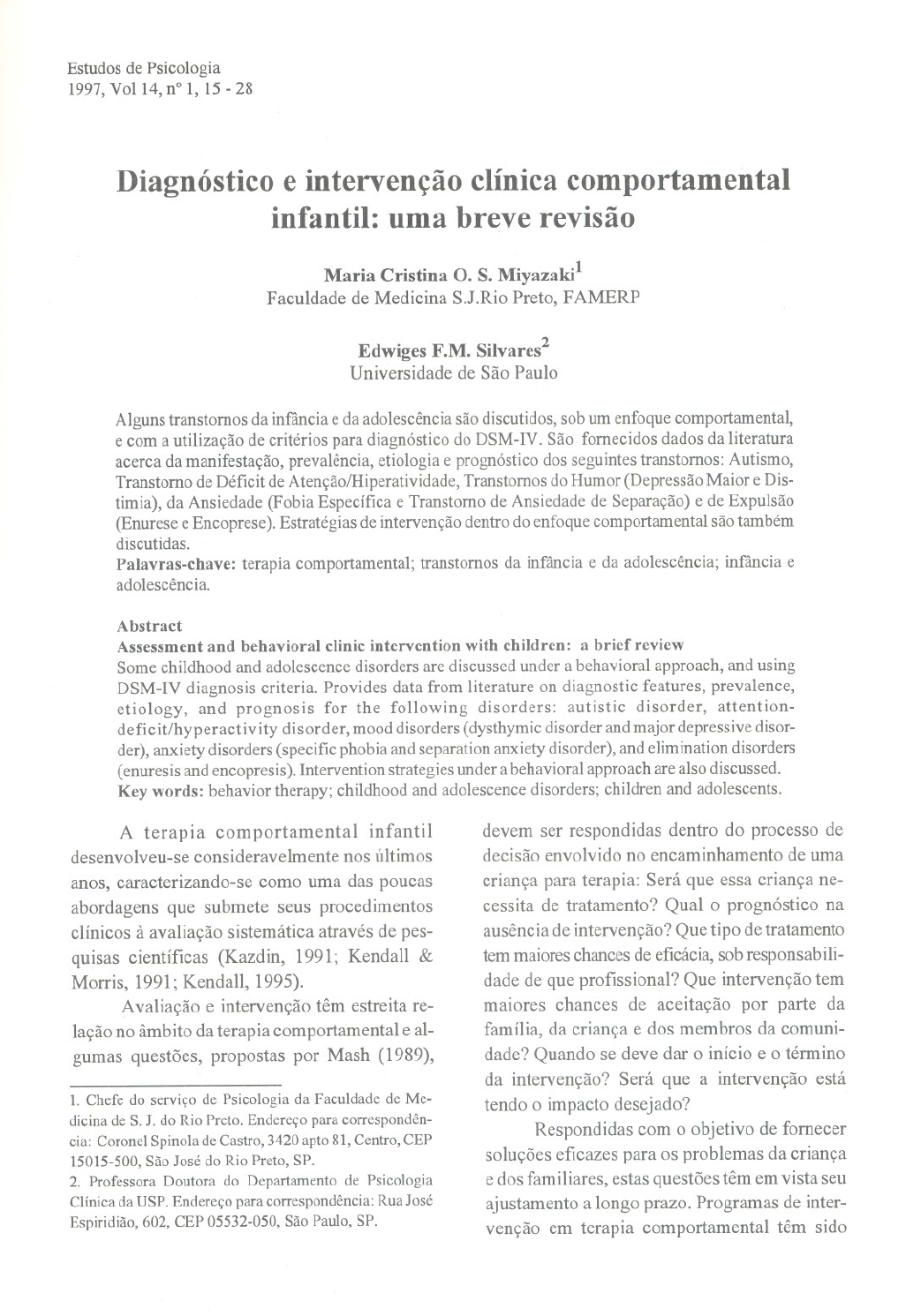 EstudosdePsicologia 1997,Vo114,n° 1, 15-28 Diagnósticoeintervençãoclínicacomportamental infantil:umabreverevisão MariaCristinaO.S.Miyazaki1 FaculdadedeMedicinaS,J.Rio Preto,FAMERP EdwigesF.M. Silvares2 UniversidadedeSãoPaulo Algunstranstornosdainf'anciaedaadolescênciasãodiscutidos,sobumenfoquecomportamental, ecomautilizaçãodecritériosparadiagnósticodoDSM-IV. São fornecidosdadosdaliteratura acercadamanifestação,prevalência,etiologiaeprognósticodosseguintestranstornos:Autismo, TranstornodeDéficitdeAtenção/Hiperatividade,TranstornosdoHumor(DepressãoMaioreDis- timia),daAnsiedade(FobiaEspecíficaeTranstornodeAnsiedadedeSeparação)e deExpulsão (EnureseeEncoprese).Estratégiasdeintervençãodentrodoenfoquecomportamentalsãotambém discutidas. Palavras-chave:terapiacomportamental;transtornosda infânciae daadolescência;infânciae adolescência. Abstract Assessmentandbehavioralclinicinterventionwithchildren:abrieCreview Somechildhoodandadolescencedisordersarediscussedunderabehavioralapproach,andusing DSM-IV diagnosiscriteria.Providesdatafromliteratureondiagnosticfeatures,prevalence, etiology, and prognosis for the following disorders:autistic disorder, attention- deficit/hyperactivitydisorder,mooddisorders(dysthymicdisorderandmajordepressivedisor- der),anxietydisorders(specificphobiaandseparationanxietydisorder),andeliminationdisorders (enuresisandencopresis).Interventionstrategiesunderabehavioralapproacharealsodiscussed. Keywords:behaviortherapy;childhoodandadolescencedisorders;childrenandadolescents. A terapiacomportamentalinfantil desenvolveu-seconsideravelmentenosúltimos anos,caracterizando-secomoumadaspoucas abordagensquesubmeteseusprocedimentos clínicosàavaliaçãosistemáticaatravésdepes- quisascientíficas(Kazdin,1991;Kendall& Morris,1991;Kendall,1995). Avaliaçãoe intervençãotêmestreitare- laçãonoâmbitodaterapiacomportamentaleal- gumasquestões,propostasporMash(1989), 1.ChefedoserviçodePsicologiadaFaculdadedeMe- dicinadeS.1.doRioPreto.Endereçoparacorrespondên- cia:CoronelSpinoladeCastro,3420apto81,Centro,CEP 15015-500,SãoJosédoRioPreto,SP. 2. ProfessoraDoutorado DepartamentodePsicologia ClínicadaUSP.Endereçoparacorrespondência:RuaJosé Espiridião,602,CEP 05532-050,SãoPaulo,SP. devemserrespondidasdentrodoprocessode decisãoenvolvidonoencaminhamentodeuma criançaparaterapia:Seráqueessacriançane- cessitadetratamento?Qualo prognósticona ausênciadeintervenção?Quetipodetratamento temmaioreschancesdeeficácia,sobresponsabili- dadedequeprofissional?Queintervençãotem maioreschancesde aceitaçãopor parteda família,dacriançaedosmembrosdacomuni- dade?Quandosedevedaro inícioeotérmino da intervenção?Seráquea intervençãoestá tendoo impactodesejado? Respondidascomoobjetivodefornecer soluçõeseficazesparaosproblemasdacriança edosfamiliares,estasquestõestêmemvistaseu ajustamentoalongoprazo.Programasdeinter- vençãoemterapiacomportamentaltêmsido Maria CristinaO. S. Miyazaki eEdwigesF. M. Silvares norteadospordadosadvindosdedesenvolvi- mentosnaárea,comocompreensãofuncional doproblema(O'Neilletai., 1990;Silvares, 1991),utilizaçãodeumaperspectivasistêmica (Emeryet ai., 1992;Fauber& Long,1991; Kazdin,1994;Silvares,1989;1991;1995), consideraçõesacercadoestágiodedesenvolvi- mentodopaciente(Rutter,1986;Petersonet ai., 1989),impactodediferençasindividuais, inclusiveaspectosbiológicos,nosresultadosdo tratamento(Russo& Bud,1987),utilizaçãode diagnósticosclínicosesistemasclassificatórios comoauxiliaresnoprocessodedecisãodetrata- mento(Silvares,1991;Trad,1989),ênfaseem prevenção(Silvares,1995), proliferaçãode procedimentoscomportamentaisem insti- tuiçõesdesaúde(Amaral&Yohida,1993;Do- mingos,1993;Miyazaki& Amaral,1995; Silvares& Miyazaki,1994;Tarnowski& Brown,1995)eumacrescenteaceitaçãodeque tratamentosindividualizadosdevemserde- lineadostambémparapopulaçõesespecíficas, istoé,enfocandoaspectosrelevantesdedeter- minadostranstornosdainfânciaeadolescência ( Mash,1989;Kendall,1995).Exemplificando oatualestadodeconhecimentosnaáreadetera- piacomportamentalinfantil,algunstranstornos serãorevistosaseguir. Autismo Criançasautistasapresentamcomo característicasprincipaisumacentuadodéficit ouinadequaçãoparainteraçõessociaisecomu- nicação,bemcomoumrepertórioexcessiva- menterestritode interessese atividades.De acordocomoDSM-IV (APA, 1994),oautismo envolveprejuízoqualitativonainteraçãosocial e na comunicação,bemcomointeresses, atividadesepadrõescomportamentaisrestritos e estereotipados.Atualmente,a maioriados autoresconsideraautismoumtranstornodode- senvolvimentodeterminadopor fatores 16 biológicos ( Newson & Rincover, 1989; Rimland,1991;Schwarztman,1993)eestudos epidemiológicossugeremqueexistemdoisa cincocasosdeautismoparacada10000in- divíduos(APA, 1994). Pesquisasindicamquecriançascomesse diagnósticopodemser divididasem dois grandesgrupos,combaseemseurendimento intelectual.Oprimeiroécompostoporcrianças comretardomentalseveroe profundo,com prognóstico,portanto,reservado,necessitando cuidadosbásicosportodaavida.Estratégiasde intervençãoemrelaçãoaessegrupovisampro- porcionaro maisaltograupossívelde inde- pendência(ex.:habilidadede autocuidados, compreensãoe obediênciaa ordenssimples, comportamentossociaisbásicos,comporta- mentosdebrincarapropriadose reduçãodos comportamentosautodestrutivos).Umtrabalho comospaisénecessário,eenvolvetreiná-los paraensinarhabilidadesbásicasàcriança,con- trolarcomportamentosinadequadoseresolver problemasdeordemprática.Alémdisso,éne- cessáriotambémensinarospaisaapreciarem progressos,independentedestesseremlentose empequenonúmero,bemcomoavalorizarem ascaracterísticasúnicasepositivasdacriança (Johnson& Werner,1984;Lipp,1981;Lovaas, 1987).O segundogrupoéconstituídoporcri- ançasqueapresentamnívelintelectualnormal ouretardomentalleveoumoderado.Paraeste grupo,alémdosobjetivoscitadosparaogrupo anterior,háumaênfasenodesenvolvimentode um repertórioverb