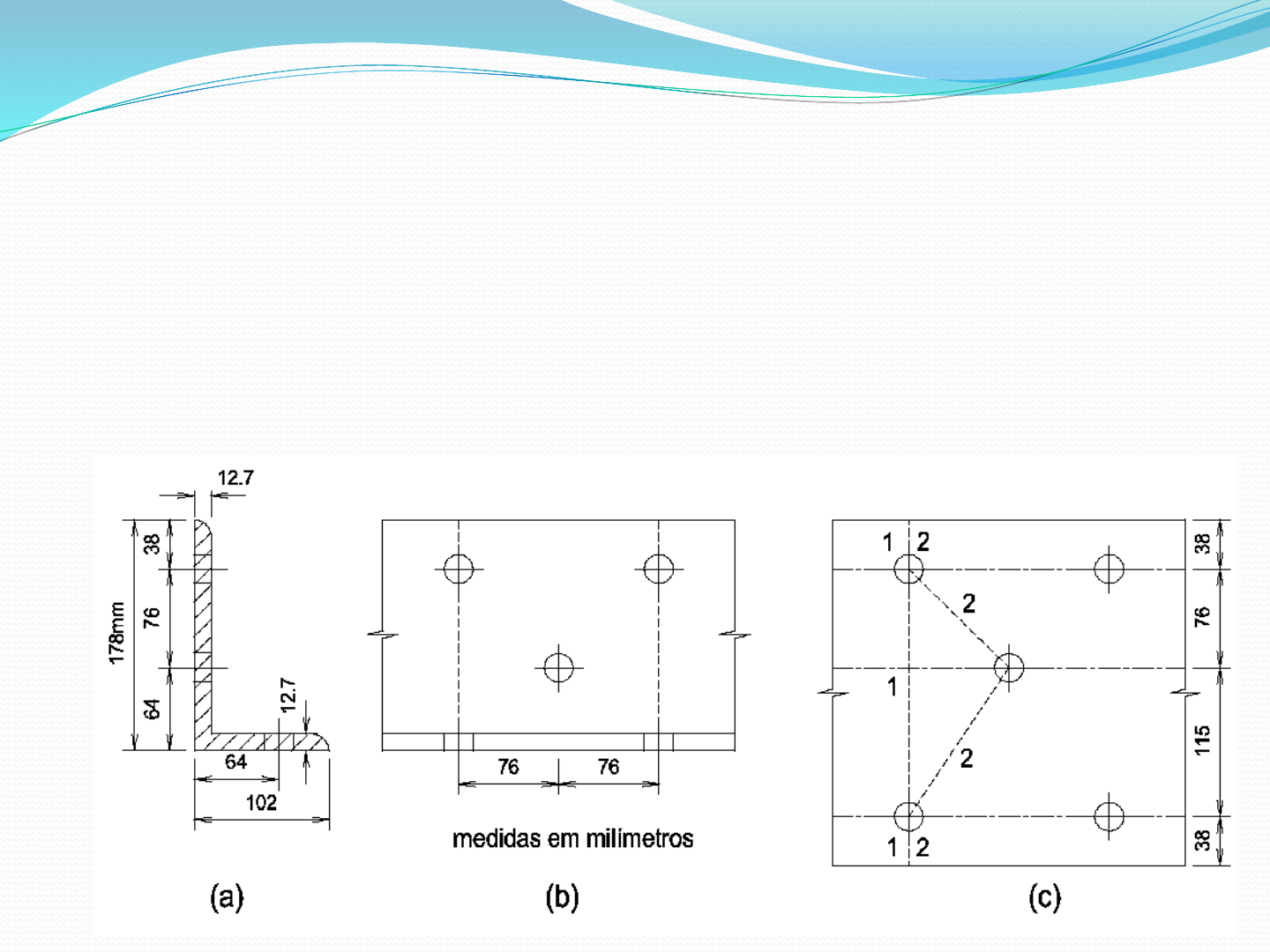Exercícios 4. Para a cantoneira [L 178 x 102 x 12,7] (7” x 4” x l/2”) indicada na Figura, determinar: a) a área líquida, sendo os conectores de diâmetro d = 22 mm (7/8"); b) o maior comprimento admissível, para esbeltez máxima l = 240. Peças Tracionadas Solução 4. O cálculo pode ser feito rebatendo-se a cantoneira segundo seu eixo (Figura c). Peças Tracionadas Peças Tracionadas Solução 4. Exercícios 5. Dimensionar a diagonal de apoio da treliça da figura abaixo , onde foi definida uma seção dupla de cantoneira 2L 63 x 4,75 mm em aço ASTM A36. O detalhe de ligação na extremidade da barra também é apresentado na Figura . O esforço de calculo a tração a ser considero é de Nsd=109 kN. Dado: Aço: ASTMA36: fyd= 250 MPa fuk = 400 MPa Peças Tracionadas Exercícios 5. As propriedades geometrias da seção são as apresentadas abaixo Peças Tracionadas Exercícios 5. Verificação do ELU: Escoamento da seção bruta: Ruptura da seção líquida: An = Ag – 2.(d+3,5). t = 11,6 + 2.(1,25+,35).0,475 = 10,08 cm² An,e = Ct x An e An,e = 0,78 x 10,08 = 7,86 cm² Peças Tracionadas Exercícios 5. Verificação do ELU: Ruptura da seção líquida: Verificação do ELS: Comprimentos de flambagem Peças Tracionadas Exercícios 5. Conclusões A resistência de cálculo à tração do elemento é Nt,Rd = 233kN . Sendo assim, como a força atuante de tração de cálculo é Nt,Sd = 109kN, temos que Nt,Sd < Nt,Rd ➔ ok! No estado limite de serviço a esbeltez da seção composta, por dupla cantoneira, não poderá superar 300. A esbeltez de uma cantoneira isolada em relação ao eixo de menor inercia também não poderá superar 300. Portanto, a seção 2L 63 x 4,75 mm esta verificada para os estados limites últimos e de serviço. Peças Tracionadas