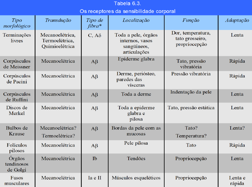 Fisiologia Capítulo 46 RECEPTORES SENSORIAIS E CIRCUITOS NEURONAIS PARA O PROCESSAMENTO DAS INFORMAÇÕES São os receptores que detectam estímulos como dor, luz, frio, calor, tato e som. Mecanorreceptores – detectam compressão mecânica ou o estiramento do receptor ou dos tecidos adjacentes Termorreceptores – detectam alterações na temperatura, alguns frio outros calor Nociceptores – (dor) detctam danos físicos ou químicos nos tecidos Receptores eletromagnéticos – detectam luz que incide na retina Quimiorreceptores – detectam gosto na boca, cheiro no nariz, nível de oxigênio no sangue arterial, a osmolalidade dos líquidos corpóreos, concentração de dióxido de carbono e outros fatores que compõem a química do corpo. Sensibilidade diferenciada é o mecanismo o qual dois tipos de receptores sensoriais detectam diferentes estímulos. Cada tipo de sensibilidade – dor, tato, visão, som, etc- é considerado uma modalidade sensorial. É possível transmitir diferentes modalidades sensoriais uma vez que diferentes fibras nervosas as transmitem e terminam em áreas específicas do sistema nervoso. Princípio das vias rotuladas: especificidade das fibras nervosas para transmitir apenas uma modalidade sensorial. Transdução dos estímulos sensoriais em impulsos nervosos Qualquer alteração do potencial da membrana do receptor – potencial receptor. Mecanismo dos potenciais receptores: podem ser excitados por: 1- deformação mecânica do receptor, que distende e abre canais iônicos. 2- aplicação de substâncias químicas na membrana que também abre os canais iônicos. 3- alteração na temperatura da membrana que altera permeabilidade. 4- radiação eletromagnética que altera as características da membrana do receptor. A causa básica de alteração no potencial da membrana é a alteração da permeabilidade da membrana que permite que os íons se difundam através da membrana, alterando desse modo o potencial transmembrana. Os receptores se adaptam aos estímulos constantes depois de um certo período. Adaptação dos diferentes tipos de receptores Alguns mecanorreceptores são considerados receptores que não se adaptam, pois precistam de horas ou dias para fazê-lo. Sensações somáticas I. Organização geral, as sensações de tato e de posição corporal Classificação das Sensações Somáticas Podem ser classificadas em 3 tipos fisiológicos: Sensações somáticas mecanorreceptivas: incluem as sensações de tato e de posição do corpo Sensações termorreceptivas: detectam frio e calor Sensação da dor: ativada por fatores que lesionam os tecidos Outras Classificações das Sensações Somáticas Sensações exterorreceptivas: sensações somáticas provenientes da superfície do corpo. Sensações proprioceptivas: sensações somáticas relacionadas com o corpo, sensações de posição, de pressão na sola do pé, de equilíbrio. Sensações viscerais: provenientes das vísceras (órgãos internos) Sensações profundas: proveniente de tecidos profundos, fáscias, músculos e ossos. Incluem a pressão “profunda” a dor e a vibração. Detecção e transmissão das sensações táteis Tato, pressão e vibração são detectados pelo mesmo receptor. Para diferenciá-los: Tato: estimulação dos receptores logo abaixo da pele Pressão: deformação dos tecidos mais profundos Vibração: sinais sensoriais repetitivos e rápidos Receptores táteis Terminações nervosas livres – detecta tato e pressão. Encontrado em toda pele e córnea. Corpúsculo de Meissner – detecta tato e pressão vibratória. É uma terminação nervosa grossa mielinizada alongada encapsulada presente na pele glabra – pontas dos dedos, lábios e lugares muito sensíveis as sensações táteis. Receptores táteis com terminação expandida – DISCO DE MERKEL: tato preciso na superfície do corpo. Se organiza num órgão receptor – receptor em Cúpula de Iggo; É um receptor extremamente sensível. Órgão terminal do pelo – detecta movimento de qualquer pelo do corpo. Receptor que se adapta rapidamente. Terminações de Ruffini – detecta sinais de tato e pressão intensos e prolongados. Importante para sinalização das deformações contínuas do tecido, além de sinalizar no grau de rotação articular. É um receptor que se adapta lentamente. Corpúsculos de Paccini – detecta vibração. Está nos tecidos das fáscias, é estimulado por compressão local rápida. Transmissão de Sinais Meissner, pilosos, cúpula de Iggo, Paccini e Ruffini = Fibra nervosa A3; Velocidade de 30m/s até 100m/s. Terminações Nervosas Livres Táteis = fibra amielínica do tipo C; Velocidade 1m/s até 2m/s. Terminações Nervosas Livres -= fibra mielinizada tipo A; Velocidade de 5 a 30m/s. Via Sensorial Para a Transmissão dos Sinais Somáticos Vias sensoriais: cadeia de neurônios relacionada a um determinado receptor sensorial. Transdução: é a transformação de um estimulo externo, qualquer que seja, em um estimulo receptor, que altera a voltagem inicial e pode gerar o estímulo Codificação: é a interpretação desse sinal e que ocorre logo no primeiro neurônio. Ordem de neurônios Terminação sensitiva Neurônio sensorial de 1 ordem (conduz o impulso para o SNC) Neurônio sensorial de 2 ordem (coluna posterior da medula, núcleos de nervos cranianos, exceto vias olfatórias e visual) Neurônio sensorial de 3 ordem (tálamo) Neurônio sensorial de 4 ordem (córtex sensorial, área de projeção sensorial primária) Vias sensoriais Todas as informações entram na medula espinhal pelas raízes dorsais dos nervos espinhais. Porém, da medula até o encéfalo os sinais sensoriais são conduzidos por uma entre duas vias sensoriais, que são: SISTEMA EPICRÍTICO: responsável pelo tato fino. Transmite os sinais ascendentes até o bulbo, depois que fazem sinapse cruzam para o lado oposto no bulbo e seguem pelo tronco cerebral até o tálamo, pelo lemnisco mediai. Caracterí