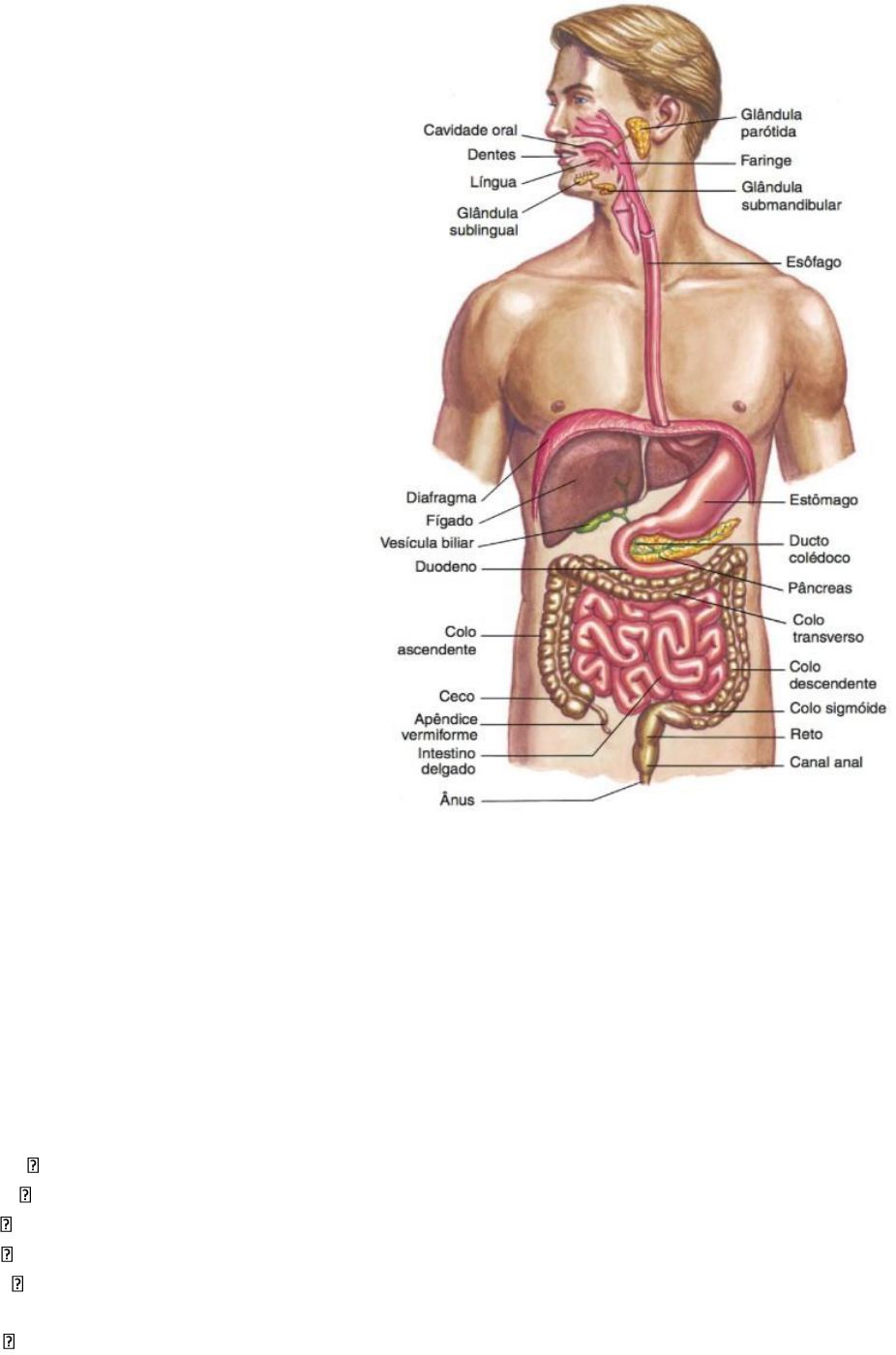 1. Sistema Digestório O trato digestório e os órgãos anexos constituem o sistema digestório. O trato digestório é um tubo oco que se estende da cavidade bucal ao ânus, sendo também chamado de canal alimentar ou trato gastrintestinal. As estruturas incluem: boca, faringe, esôfago, estômago, intestino delgado, intestino grosso, reto e ânus. O comprimento do trato gastrintestinal, medido no cadáver, é cerca de 9 metros. Na pessoa viva, porém, é menor devido à existência de um estado de précontração da musculatura lisa dos órgãos, chamado tônus muscular. Os órgãos digestórios acessórios são os dentes, a língua, as glândulas salivares, o fígado, vesícula biliar e o pâncreas. Os dentes auxiliam no rompimento físico do alimento e a língua auxilia na mastigação e na deglutição. Os demais nunca entram em contato direto com o alimento. Produzem ou armazenam secreções que passam para o tubo digestivo e auxiliam a decomposição química do alimento. Divisão - Canal alimentar - Órgãos anexos 1.1. Funções do sistema digestório Destina-se ao aproveitamento pelo organismo, de substâncias estranhas ditas alimentares, que asseguram a manutenção de seus processos vitais; Transformação mecânica e química das macromóléculas alimentares ingeridas (proteínas, carboidratos, etc.) em moléculas de tamanhos e formas adequadas para serem absorvidas pelas paredes do trato; Transporte de alimentos digeridos, água e sais minerais da luz intestinal para os capilares sanguíneos da mucosa do intestino; Eliminação de resíduos alimentares não digeridos e não absorvidos, juntamente com restos de células descamadas da parte do trato gastrintestinal e substâncias secretadas na luz do intestino. Mastigação desintegração parcial dos alimentos, processo mecânico e químico. Deglutição condução dos alimentos através da faringe para o esôfago. Ingestão introdução do alimento no estômago. Digestão desdobramento do alimento em moléculas mais simples. Absorção processo através do qual as partes digeridas são transportadas para os capilares através da parede dos órgãos. Excreção eliminação de substâncias não digeridas pelo trato gastrintestinal. 2. Boca ou cavidade oral A boca, também referida como cavidade oral ou bucal, é formada pelas bochechas (formam as paredes laterais da face e são constituídas externamente por pele e internamente por mucosa), pelos palatos duro (osso) e mole (músculo), e pela língua (importante para o transporte de alimentos, paladar e fala). O palato mole se estende posteriormente na cavidade bucal como a úvula, que é uma estrutura com forma de letra V e que está suspensa na região superior e posterior da cavidade bucal. A cavidade oral é onde o alimento é ingerido e preparado para a digestão no estômago e intestino delgado. O alimento é mastigado pelos dentes, e a saliva, proveniente das glândulas salivares, facilita a formação de um bolo alimentar controlável. A deglutição é iniciada voluntariamente na cavidade da boca. A fase voluntária do processo empurra o bolo da boca para a faringe – a parte expandida do trato digestório – onde ocorra a fase automática da deglutição. A cavidade da boca consiste em duas partes: o vestíbulo da boca e a cavidade própria da boca. O vestíbulo da boca é o espaço semelhante a uma fenda entre os dentes e a gengiva e os lábios e as bochechas. A cavidade própria da boca é o espaço entre os arcos dentais superior e inferior. É limitada lateral e anteriormente pelos arcos alveolares maxilares e mandibulares que alojam os dentes. O teto da cavidade da boca é formado pelo palato. Posteriormente, a cavidade da boca se comunica com a parte oral da faringe. Quando a boca está fechada e em repouso, a cavidade da boca é completamente ocupada pela língua. 2.1. Dentes Os dentes são estruturas cônicas, duras, fixadas nos alvéolos da mandíbula e maxila que são usados na mastigação e na assistência à fala. Crianças têm 20 dentes decíduos (primários ou de leite). Adultos normalmente apresentam 32 permanentes (secundários). Como possuímos duas dentições, uma primária e uma secundária, por isso somos conhecidos como difiodontes. Na época em que a criança está com 2 anos de idade, provavelmente já estará com um conjunto completo de 20 dentes de leite. Quando um adulto jovem já está entre 17 e 24 anos, geralmente está presente em sua boca um conjunto completo de 32 dentes permanentes. Possuímos também a heterondontia, o que nos permite ter dentes com diferentes conformações. (VAN DE GRAAFF, 2003) Dentição primária - constituída por 20 dentes (4 incisivos, 2 caninos e 4 molares). Dentição secundária - constituída por 32 dentes (4 incisivos, 2 caninos, 4 pré- molares, 6 molares). A coroa a dentina é revestida pelo esmalte e na raiz pelo cemento. 2.2. Lingua A língua é o principal órgão do paladar e um importante órgão da fala, além de auxiliar na mastigação e deglutição dos alimentos. Localiza-se no assoalho da boca, dentro da curva do corpo da mandíbula. A raiz é a parte posterior, por onde se liga ao osso hióide pelos músculos hioglosso e genioglosso, e pela membrana glossohióidea; à epiglote, por três pregas da mucosa; ao palato mole, pelos arcos palatoglossos, e à faringe, pelos músculos constritores superiores da faringe e pela mucosa. O ápice é a extremidade anterior, um tanto arredondada, que se apoia contra a face lingual dos dentes incisivos inferiores. A face inferior possui uma mucosa entre o assoalho da boca e a língua, na linha mediana, que forma uma prega vertical nítida, o frênulo da língua. No dorso da língua, encontramos um sulco mediano que divide a língua em duas partes simétricas. Nos 2/3 anteriores do dorso encontramos as papilas linguais. Já no terço posterior encontramos numerosas glândulas mucosas e folículos linfáticos (tonsila lingual). Papilas linguais - enc