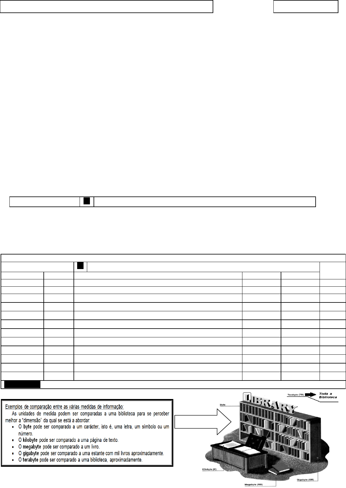 Arco Ocupacional de Telemática CONCEITOS: Peopleware: São as pessoas envolvidas no desenvolvimento ou utilização do sistema de computação. Hardware: Corresponde à parte física do computador como o monitor, o teclado, o gabinete, o mouse, fios, cabos e outros. Exemplo: monitor, o teclado, o gabinete, o mouse, fios, cabos e outros. Software: Corresponde a parte lógica - Chamado de softwares, que são programas para computador. Exemplo: Word, Excel, jogos, Windows, Messenger e outros. Adware: Também são gratuitos, mas trazem publicidade em forma de banners ou links. Opensource: São programas gratuitos que possuem o código-fonte aberto. Exemplos: Navegador de internet Mozilla Firefox, Linux e Android. Shareware (gratuito para testar): São programas que após um determinado tempo de uso ou número de utilizações, ele perde algumas ou todas os seus funcionalidades. Demo: Aplicado a jogos, que só demonstra uma fração do mesmo. Não há opção para registrar o programa. Trial: É semelhante ao tipo DEMO, mas se aplica a programas. Você pode testar o programa em sua totalidade, com todos os recursos e por quanto tempo quiser, mas geralmente não poderá salvar ou exportar os trabalhos feitos. Não há opção para registrar o programa. Freeware (grátis): Pode-se usar plenamente as funções do programa sem nenhum custo. O QUE É BIT? Unidade mínima de informação possível de ser interpretada e armazenada pelo computador. Um bit pode assumir apenas um de dois valores: 1 (um/ligado) ou 0 (zero/desligado). BIT ( Assumi valores de 0 e 1. É a menor capacidade medida de uma determinada informação. O QUE É BYTE? Significa Binary digit (Digito Binário). É um Conjunto de oito bits. Cada byte corresponde a um caracter gráfico (letra, número, sinal de pontuação, acentuação, etc.). Exemplo: para armazenar o nome próprio Maria na memória do computador precisamos de 5 bytes para cada letra. Representação da unidade de medidas de armazenamento utilizadas na Informática BIT ( Assumi valores de 0 e 1. É a menor capacidade medida de uma determinada informação. POTÊNCIA DE 10N UNIDADES SÍMBOLO CAPACIDADE DESCRITA POR EXTENSO LEITURA Equivale ( a: Bit - Menor unidade de informação 0 e 1 - - - 1 Byte B 1 Conjunto de 8 bits = 1 caracter. Oito 1 Caracter 100 1 kilobyte KB ( : 1.000 bytes. Mil Mil Caracteres 103 1 Megabyte MB ( : 1.000.000 de bytes. Milhão Milhão de Caracteres 106 1 Gigabyte GB ( : 1.000.000.000 de bytes. Bilhão Bilhão de Caracteres 109 1 Terabyte TB ( : 1.000.000.000.000 de bytes. Trilhão Trilhão de Caracteres 1012 1 Petabyte PB ( : 1.000.000.000.000.000 de bytes. Quatrilhão Quatrilhão de Caracteres 1015 1 Exabyte EB ( : 1.000.000.000.000.000.000 de bytes. Quintilhão Quintilhão de Caracteres 1018 1 Zettabyte ZB ( : 1.000.000.000.000.000.000.000 de bytes. Sextilhão Sextilhão de Caracteres 1021 1 Yottabyte YB ( : 1.000.000.000.000.000.000.000.000 de bytes. Septilhão Septilhão de Caracteres 1024 1 Brontobyte BB ( : 1.000.000.000.000.000.000.000.000.000 de bytes. Octilhão Octilhão de Caracteres 1027 1 Geopbyte GeB ( : 1.000.000.000.000.000.000.000.000.000.000 de bytes. Nonilhão Nonilhão de Caracteres 1030 LEGENDA ( ( Significa Aproximadamente TRABALHANDO COM USO DO MOUSE Aluno (A): TURMA: Comparando a uma Biblioteca 1 Petabyte ( Equivale a aproximadamente a 8,5 bilhões de fotos do Facebook. 1 Exabyte ( Mais de 1 trilhão de livros 1 Zettabyte ( Equivale a aproximadamente 13 bilhões de dispositivos conectados. 1 Yottabyte ( Todo o universo digital 2015 ou 250 Trilhões de DVDs. 1 Brontobyte (Todo o universo digital de hoje 2016. 1 Geopbyte ( Isto corresponderá a todo o nosso universo digital em 2025. 2- Assistam ao vídeo da historia do computador em segundos faça um resumo destacando os principais pontos observados no vídeo sobre a evolução dos computadores. R= (Faça no caderno) (Depois de escrito _______________