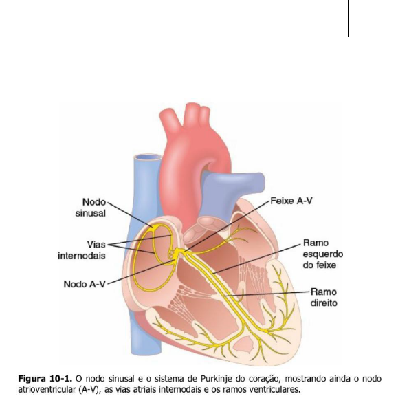 Excitação Rítmica do Coração – CAPÍTULO 10 - Guyton Hyana Morato 1 O Sistema Excitatório e Condutor Especializado do Coração A figura mostro sistema especializado condutor e excitatorio do coração que controla as contrações. A figura mostra o nodo sinusal( também chamado de nodo sinoatrial ou nodo S-A), no qual é gerado impulso rítmico normal. As vias intermodais que conduzem o impulso do nodo sinusal ao nodo atrioventricular ( nodo A-V); o próprio nodo A-V , no qual os impulso, vindo dos átrios, é retardado antes de passar para os ventrículos. O feixe A-V, que conduz o impulso dos átrios ate os ventrículos e ramos direito e esquerdo do feixe de fibras de Purkinje, que conduzem o impulso cardíaco para todas as partes dos ventrículos. Nodo Sinusal (Sinoatrial) O nodo sinusal é uma faixa pequena, achatada e elipsóide, de músculo cardíaco especializado, com aproximadamente 3 milímetros de largura por 15 milímetros de comprimento e 1 milímetro de espessura. Esta situado na parede póstero-lateral superior do átrio direito e abaixo, e pouco lateral a abertura da veia cava superior. As fibras do nodo sinusal se conectam, diretamente, as fibras musculares atriais, de modo que qualquer potencial de ação que se inicie no nodo sinusal se difunde para a parede do músculo atrial. Ritmicidade Elétrica Automática das Fibras Sinusais Algumas fibras cardíacas têm capacidade de auto-excitação, processo que pode causar descarga automática rítmica e conseqüentemente, contrações rítmicas. Por essa razão, o nodo sinusal controla, normalmente, a freqüência dos batimentos de todo o coração. Mecanismo da Ritmicidade do Nodo Sinusal A figura 10-2 mostra potenciais de ação, registrados no interior de uma fibra do nodo sinusal, de três batimentos cardíacos e, como comparação, apenas um potencial de ação de fibra muscular ventricular. Note que entre as descargas, o “potencial de repouso da membrana” da fibra sinusal tem negatividade de aproximadamente -55 a -60 milivolts, comparada com -85 a -90 milivolts da fibra muscular ventricular. A explicação para essa menor negatividade é que as membranas celulares das fibras sinusais são por natureza mais permeáveis ao Excitação Rítmica do Coração – CAPÍTULO 10 - Guyton Hyana Morato 2 cálcio e ao sódio , e as cargas positivas desses íons que cruzam a membrana neutralizam boa parte da negatividade intracelular. O miocárdio apresenta três tipos de canais iônicos nas suas membranas que desempenham papéis importantes para deflagrar as variações das voltagens do potencial de ação. Eles são: 1. Canais rápidos de sódio 2. Canais lentos de sódio-cálcio 3. Canais de potássio A abertura dos canais rápidos de sódio, já é responsável pelo potencial em ponta rápido do potencial de ação observado no músculo ventricular, por causa da entrada rápida de íons de sódio positivos para o interior da fibra. Em seguida, o “platô” do potencial de ação ventricular é originado, pela abertura mais vagarosa dos canais de sódio-cálcio lentos. Por fim, a abertura dos canais de potássio permite a difusão de grandes quantidades de íons positivos de potássio para o exterior da fibra muscular, trazendo o potencial de membrana de volta a seu nível de repouso. Existe uma diferença no funcionamento desses canais nas fibras do nodo sinusal, pois o seu valor “de repouso” é bem menos negativo. Auto-excitação das Fibras do Nodo Sinusal Em virtude da alta concentração de íons sódio no líquido extracelular, por fora da fibra nodal, alem do número de canais de sódio já abertos, os íons positivos de sódio tendem a vazar para o interior dessas células. É por isso que, entre o batimentos cardíacos , o influxo de sódio positivamente carregado, provoca lento aumento do potencial da membrana de repouso, em direção aos valores positivos. Basicamente, é o vazamento inerente das fibras do nodo sinusal que causa a auto- excitação. As Vias Internodais e a Transmissão do Impulso Cardíaco pelos Átrios Excitação Rítmica do Coração – CAPÍTULO 10 - Guyton Hyana Morato 3 As extremidades das fibras do nodo sinusal conectam-se diretamente ao tecido muscular atrial. Por tanto, potenciais de ação, originados no nodo sinusal, se propagam para diante por essas fibras musculares atrais. O potencial de ação se espalha por toda a massa muscular atrail até o nodo A-V. A banda interatrial anterior, cursa pela paredes anteriores dos átrios, alcançando o átrio esquerdo. Três outras pequenas bandas teciduais se curvam pelas paredes anterior, lateral, e posterior dos átrios, terminando no nodo A-V. elas são denominadas vias internodais anterior, media e posterior. A causa da maior velocidade de condução, nessas faixas, é a presença de fibras condutoras especializadas, essas fibras se assemelham as fibras de purkinje ventriculares, de condução mais rápida. O Nodo Atrioventricular e o Retardo da Condução do Impulso dos Átrios para os Ventrículos Os responsáveis pelo retardo da transmissão para os ventrículos são principalmente, o nodo A-V e suas fibras condutoras adjacentes. O nodo A-V está situado na parede posterior do átrio direito, atrás da valva tricúspide. A figura 10-3 mostra um diagrama das diversas porções desse nodo, alem das suas conexões com as fibras das vias internodais atriais aferentes e para a saída dele, o feixe A-V. Causa da Condução Lenta A condução lenta, nas fibras transicionais, nodias e do feixe penetrante A-V, é explicada pelo reduzido numero de junções comunicantes (gap junctions) entre as sucessivas células das vias de condução, de modo que existe grande resistência para a passagem de íons excitatórios de uma fibra condutora para a próxima. Cada célula é mais lenta em sua ativação. Transmissão Rápida no Sistema de Purkinje Ventricular A condução do nodo A-V, pelo feixe A-V, para os ventrículos é feita pelas f