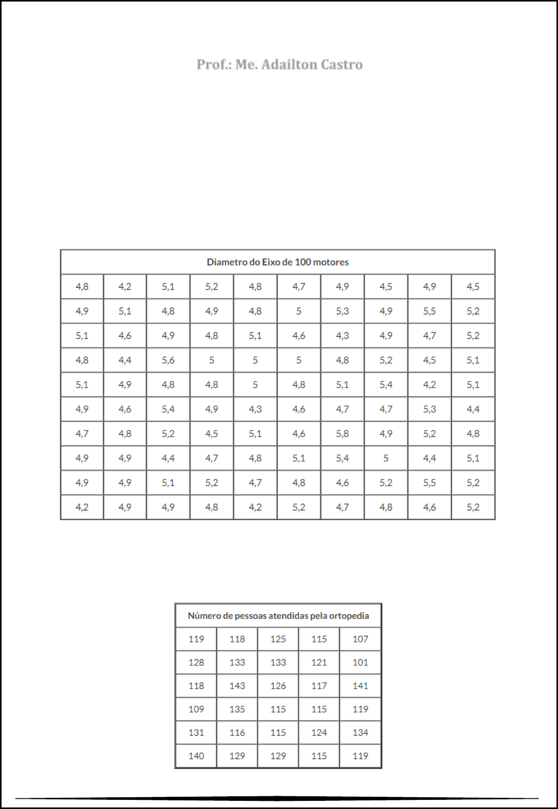 1. Numa fábrica de motores elétricos, o gerente de produção precisa avaliar o problema de ruído excessivo do motor. Uma das possíveis causas está associada com variações no diâmetro do eixo. Assim, o gerente de produção mediu o diâmetro do eixo de 200 motores e o resultado está apresentado na Tabela a seguir. Os valores estão em milésimos de milímetros. Considerando os dados da tabela abaixo, monte a distribuição de frequências e construa o histograma correspondente. 2. Em um hospital, foram contabilizados o número de pessoas atendidas pela ortopedia durante os 30 dias de um mês. Os valores observados estão apresentados na tabela a seguir. Determine a média, a moda e a mediana. R: �̅� = 𝟏𝟐𝟑, 𝑴𝒐 = 𝟏𝟏𝟓 e 𝑴𝒅 = 𝟏𝟐𝟎 Aluno (a):................................................................................................................................. RA:........................ Atividade Avaliativa - ESTATÍSTICA Assunto: Distribuição de frequências / Medidas de Tendência Central e Dispersão Prof.: Me. Adailton Castro Universidade Paulista (UNIP) Goiânia 18/03/2019 3. Consideremos o exercício 2, em que foram contabilizados o número de pessoas atendidas pela ortopedia durante os 30 dias de um mês. Para os valores observados, determine: o desvio padrão, variância e o coeficiente de variação. R: 𝑺 = 𝟏𝟎, 𝟑𝟑, 𝑺𝟐 = 𝟏𝟎𝟔, 𝟕𝟓 e 𝒄𝑽 = 𝟖, 𝟑𝟗% 4. Numa turma foram registradas as idades de todos os 25 alunos. Qual a frequência absoluta e a frequência relativa do número de alunos de 14 anos: R: 𝒇𝑨 = 𝟓 e 𝒇𝑹 = 𝟐𝟎% 15 16 16 15 14 15 17 16 14 14 14 17 15 16 15 16 14 15 15 15 16 15 15 16 17 5. Uma amostra apresentou a seguinte distribuição de frequências: Classes Frequências 2 ⊢ 6 7 6 ⊢ 10 5 10 ⊢ 14 10 14 ⊢ 18 8 18 ⊢ 22 4 22 ⊢ 26 6 Calcule a média e variância. R: �̅� = 𝟏𝟑, 𝟓 e 𝑺𝟐 = 𝟒𝟑, 𝟐 6. Identifique o tipo de amostragem utilizado em cada caso. I) Ao escalar uma comissão para atuar em determinado projeto, uma empresa decidiu selecionar aleatoriamente 4 pessoas brancas, 3 pardas e 4 negras. II) Uma professora escreve o nome de todos os seus alunos em pedaços de papel e coloca em uma caixa. Depois de misturá-los, sorteia 10 nomes. III) Um administrador de uma sala de cinema faz uma pesquisa com as pessoas que estão na fila de espera para comprar ingresso, entrevistando uma pessoa a cada 10 presentes na fila. Marque a alternativa que contém os respectivos tipos de amostragem dos itens acima: a) ( ) Amostragem Estratificada, Amostragem Aleatória Simples, Amostragem Sistemática. b) ( ) Amostragem Estratificada, Amostragem Sistemática, e Amostragem Aleatória Simples. c) ( ) Amostragem Sistemática, Amostragem Aleatória Simples e Amostragem Estratificada. d) ( ) Amostragem Sistemática, Amostragem Estratificada e Amostragem Aleatória Simples. e) ( ) Amostragem por Conglomerados, Amostragem Sistemática e Amostragem Estratificada. 7. Defina: a) Estatística Descritiva b) Estatística Indutiva; c) Censo; d) População; e) Amostra; 8. Demonstre através de cálculos a posição da mediana nos dados informados: a) 25, 74, 65, 12, 33, 3, 76, 40, 56 b) 45, 12, 100, 05, 34, 2, 09, 19, 29, 1 9. João deseja calcular a média das notas que tirou em cada uma das quatro matérias a seguir. Calcule a média ponderada de suas notas, sendo que as duas primeiras provas valem 2 pontos e as outras duas valem 3 pontos: R: �̅�𝑰 = 𝟔,𝟓𝟖 e �̅�𝑷 = 𝟔,𝟕𝟑 Inglês 1ª prova 3,5 2ª prova 7,8 3ª prova 9,3 4ª prova 5,1 Português 1ª prova 7,8 2ª prova 8,3 3ª prova 3,5 4ª prova 8,2 10. Um levantamento dos preços à vista de gasolina e de álcool, em alguns postos da cidade, está mostrado na tabela abaixo (em R$). Gasolina 2,61 2,64 2,56 2,61 2,60 2,58 Álcool 1,90 1,79 1,88 1,81 1,88 1,84 a) Qual é a média, o desvio padrão e o coeficiente de variação dos preços de cada combustível? R: �̅�𝑮 = 𝟐, 𝟔𝟎, �̅�𝑨 = 𝟏, 𝟖𝟓, 𝑪𝑽𝑮 = 𝟏, 𝟎𝟔% e 𝑪𝑽𝑨 = 𝟐, 𝟑𝟖𝟏% b) Qual é o combustível que tem seus preços mais homogêneos? R: Gasolina