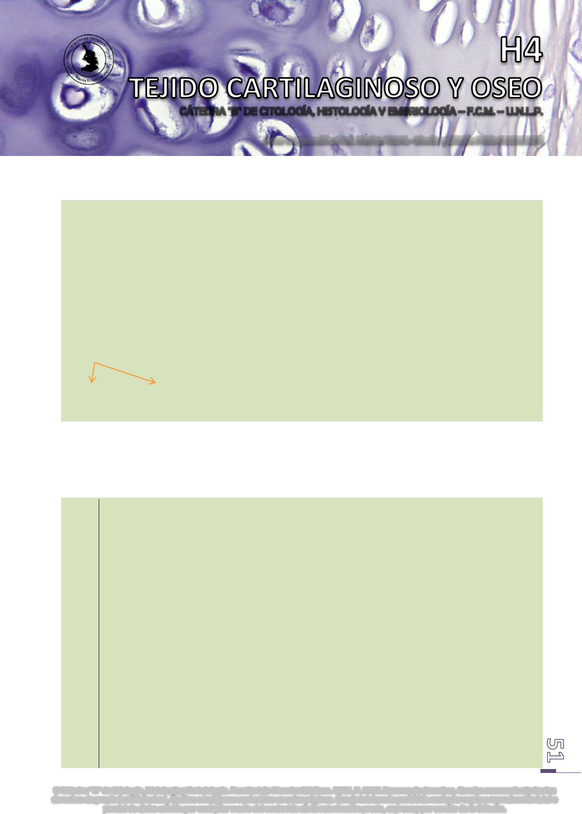 CÁTEDRA "B" DE CITOLOGÍA, HISTOLOGÍA Y EMBRIOLOGÍA – F.C.M. – U.N.L.P. Autor Responsable: Prof. Marhta VIDAL - Diseño y Edición Pablo DEGREGORI ® Cátedra “B” de Citología, Histología y Embriología. Facultad de Ciencias Médicas. U.N.L.P. 2017. Reserva de derechos. Quedan reservados todos los derechos de propiedad intelectual, diseños e imágenes contenidas en estas páginas. Queda totalmente prohibida cualquier copia o reproducción total o parcial de dicha edición por cualquier medio del contenido sin la autorización previa, expresa y por escrito de la Cátedra. MESODERMO TEJIDO CONECTIVO EMBRIONARIO M E S É N Q U I M A TEJIDO MUCOSO DEL CORDÓN UMBILICAL (gelatina de Wharton) TEJIDO CONECTIVO ADULTO O PROPIAMENTE DICHO TEJIDO CONECTIVO ESPECIALIZADO DENSO LAXO TEJIDO ADIPOSO TEJIDO CARTILAGINOSO TEJIDO ÓSEO TEJIDO LINFÁTICO TEJIDO HEMOPOYÉTICO (MO) TEJIDO SANGUÍNEO: SANGRE MODELADO (REGULAR) NO MODELADO (IRREGULAR) Ambos tejidos son especializaciones del conectivo y como él cuentan con células y matríz extracelular (sólida y relativamente rígida). Estructuralmente huesos y cartílagos son un soporte para el cuerpo, conformando el sistema esquelético. C É L U L A S - CFU-F (mesenquimática) - CONDROGÉNICAS PERICONDRIO CRECIMIENTO O FORMADORAS APOSICIONAL DE CARTÍLAGO - CONDROBLASTOS (CONDROCITOS JÓVENES) - CONDROCITO LAGUNA GRUPOS CRECIMIENTO INTERSTICIAL (CELULA MADURA) ISÓGENOS MATRIZ MATRIZ CAPSULAR TERRITORIAL MATRÍZ INTERTERRITORIAL CÁTEDRA "B" DE CITOLOGÍA, HISTOLOGÍA Y EMBRIOLOGÍA – F.C.M. – U.N.L.P. S U S T A N C IA I N T E R C E L U L A R O M A T R IZ E X T R A C E L U L A R M A T R IZ A M O R F A - AGUA (70 A 80%) - GAG GAG (no sulfatado) A. HIALURÓNICO (HIALURONANO) AGRECANOS GAGS CONDROITÍN SULFATO Son los que predominan QUERATÁN SULFATO - Proteoglucanos: GAGs + PROTEINA - CONDRONECTINA (más abundante), ANCORINA, TENASCINA. Todas estas son glucoproteínas de adhesión o anclaje entre células y fibras. - COLÁGENO TIPO II (40% del peso seco) - COLÁGENOS TIPO IX, X y XI (5 al 10% del colágeno) - COLÁGENO TIPO VI (en matríz capsular) - COLÁGENO TIPO I (en fibrocartílago) F IB R A S COLÁGENAS - C. HIALINO - C. FIBROSO ELÁSTICAS - C. ELÁSTICO ESQUEMA DE UN CORTE DE CARTÍLAGO. Los GAG, por su contenido en Aminoazúcares son Polisacáridos (anteriormente se denominaban Mucopolisacáridos, con carga altamente negativa) Los GAGS (Glucosaminoglucanos Sulfatados), están constituidos por cantidades equimoleculares de Ácido D-Glucurónico, D-Galactosamina. Sulfatos: Condroitín Sulfato - Queratán Sulfatos - Dermatán Sulfatos - Heparán sulfato. Características de las matrices capsular, territorial e interterritorial. ¿Qué componentes de la matríz cartilaginosa son responsables de su marcada basofilia? Concepto de grupo isógeno. ¿Como pueden organizarse? PROTEOGLICANOS 1 EJE CENTRAL GAGs (GLUCOSAMINOGLUCANOS) O O SULFATADOS PROTEOGLUCANOS MOLÉCULA PROTEICA = + FIG.4.1 TEJIDO CARTILAGINOSO Y OSEO – H4 GRUPO ISOGENO AXIAL (CARTÍLAGO HIALINO) (HE) 1000X GRUPO ISOGENO CORONARIO (CARTÍLAGO HIALINO) (HE) 1000X CÁTEDRA "B" DE CITOLOGÍA, HISTOLOGÍA Y EMBRIOLOGÍA – F.C.M. – U.N.L.P. CARTILAGO HIALINO (HE) 200X - ¿Qué células cartilaginosas son responsables del crecimiento aposicional? ¿De quiénes derivan dichas células? - ¿Qué células cartilaginosas son responsables del crecimiento intersticial? ¿De quiénes derivan dichas células? - ¿Qué tienen en común los tejidos cartilaginoso y epitelial? - importancia del pericondrio. ¿Cómo se realiza el aporte de nutrientes? ¿Qué células nuevas se generan? - Moléculas de Agrecano. ¿Cómo están constituidas? Hidratación de la matríz extracelular. - ¿Qué variedad de cartílago carece de pericondrio? ¿Por qué? - ¿Qué componentes de la matríz extracelular determinan su clasificación? EJEMPLOS DE LOS DIFERENTES TIPOS DE CARTÍLAGO. TEJIDO CARTILAGINOSO Y OSEO – H4 CARTILAGO FIBROSO (M-AZAN) 600X CARTILAGO ELÁSTICO (ORCEÍNA) 400X CÁTEDRA "B" DE CITOLOGÍA, HISTOLOGÍA Y EMBRIOLOGÍA – F.C.M. – U.N.L.P. I. TEJIDO OSEO C É L U L A S - CFU-F (mesenquimática) OSTEOPROGENITORAS (Indiferenciadas) PERIOSTIO (Capa Interna) FIBRAS DE SHARPEY OSTEOGÉNICAS (Formadoras de Hueso) OSTEOBLASTO (Célula Diferenciada) OSTEOCITO (Célula Madura) LAGUNA (OSTEOPLASTO) CANALÍCULO ÓSEO DE REABSORCIÓN (O de Degradación Ósea) OSTEOCLASTO (SFM) LAGUNA DE HOWSHIP S U S T A N C IA O M A T R IZ E X T R A C E L U L A R (M A T R IZ Ó S E A ) MATRIZ ORGÁNICA (35%) SUSTANCIA FUNDAMENTAL AMORFA: - PROTEOGLUCANOS (PG), HIALURONIDATOS (GAG) - GLUCOPROTEÍNAS DE ADHESION O ANCLAJE: OSTEOCALCINA OSTEOPONTINA OSTEONECTINA - COLÁGENO TIPO I (90%) - FIBRAS DE COLÁGENO - FACTORES DE CRECIMIENTO: TNFα, IGF, TGFβ, PDGF, BMP. - CITOCINAS: IL1, IL3, IL6 y IL11. MATRIZ INORGÁNICA (65% De su Peso Seco) - SALES DE FÓSFORO Y CALCIO (FOSFATO DE CALCIO) Como Cristales de HIDROXIAPATITA - POTASIO (K + ), SODIO (Na + ), MAGNESIO (Mg ++ ), FLUOR (F - ), CARBONATOS, FOSFATOS, CITRATOS IMPORTANCIA DEL PERIOSTIO Y DEL ENDOSTIO. ¿DÓNDE SE UBICAN? ¿QUÉ COMPONENTE DE LA MATRÍZ ÓSEA ES RESPONSABLE DE SU DUREZA CARACTERÍSTICA? PRODUCTOS SINTETIZADOS Y SECRETADOS POR LOS OSTEOBLASTOS COMPONENTES DE LA MATRIZ OSEA PG GAG GP DE ANCLAJE OSTEONECTINA, OSTEOPONTINA, OSTEOCALCINA COLAGENO TIPO I CITOCINAS IL1, IL3, IL6, IL11 FACTORES DE CRECIMIENTO TNFα, IGF-1 (SOMATOMEDINA C), TGFβ, PDGF, BMP RECEPTORES DE MEMBRANA PARA CITOCINAS, VITAMINAS Y PTH → FACTOR ESTIMULADOR OSTEOCLÁSTICO PROCOLAGENASACOLAGENASA ( PLASMINA) ACTIVADOR DEL PLASMINOGENO SERICO ( ) PLASMINÓGENO PLASMINA FOSFATASA ALCALINA - PIROFOSFATASA FACTOR DE CRECIMIENTO DE COLONIAS DE MACRÓFAGOS OSTEOPROTEGERINA TEJIDO CARTILAGINOSO Y OSEO – H4 ARQUITECTURA DEL HUESO. - HUESO COMPACTO O LAMINILLAR - HUESO ESPONJOSO O TRABECULAR ESQUEMA DE OSTEONA (SISTEMA LAMINILLAR CONCÉNTRICO) OSTEONA (CORTE TRANSVERSAL) SISTEMA