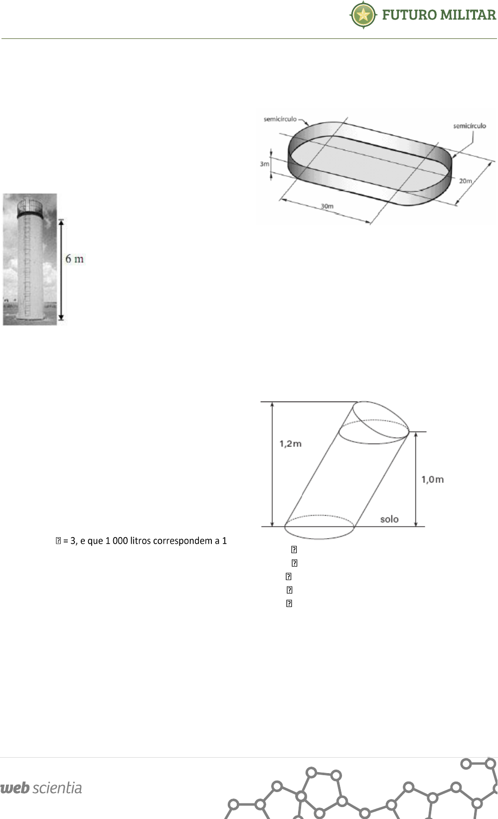 1 Geometria Espacial - Cilindros 1) (ENEM) A figura ao lado mostra um reservatório de água na forma de um cilindro circular reto, com 6 m de altura. Quando está completamente cheio, o reservatório é suficiente para abastecer, por um dia, 900 casas cujo consumo médio diário é de 500 litros de água. Suponha que, um certo dia, após uma campanha de conscientização do uso da água, os moradores das 900 casas abastecidas por esse reservatório tenham feito economia de 10% no consumo de água. Nessa situação, a) a quantidade de água economizada foi de 4,5 m3. b) a altura do nível da água que sobrou no reservatório, no final do dia, foi igual a 60 cm. c) a quantidade de água economizada seria suficiente para abastecer, no máximo, 90 casas cujo consumo diário fosse de 450 litros. d) os moradores dessas casas economizariam mais de R$ 200,00, se o custo de 1m3 de água para o consumidor fosse igual a R$ 2,50. e) um reservatório de mesma forma e altura, mas com raio da base 10% menor que o representado, teria água suficiente para abastecer todas as casas. 2) (VUNESP) A base metálica de um dos tanques de armazenamento de látex de uma fábrica de preservativos cedeu, provocando um acidente ambiental. Nesse acidente, vazaram 12 mil litros de látex. Considerando a aproximação m3, se utilizássemos vasilhames na forma de um cilindro circular reto com 0,4 m de raio e 1 m de altura, a quantidade de látex derramado daria para encher exatamente quantos vasilhames? a) 12. b) 20. c) 22. d) 25. e) 30. 3) (UEL) A capacidade aproximada de um aterro sanitário com a forma apresentada na figura a seguir é: a) 1135 m3 b) 1800 m3 c) 2187 m3 d) 2742 m3 e) 3768 m3 4) (UNIFESP) A figura indica algumas das dimensões de um bloco de concreto formado a partir de um cilindro circular oblíquo, com uma base no solo, e de um semicilindro. Dado que o raio da circunferência da base do cilindro oblíquo mede 10cm, o volume do bloco de concreto, em cm3, é a) 11000 . b) 10000 . c) 5500 . d) 5000 . e) 1100 . 5) (Faap) A razão na qual um comprimido de vitamina C começa a dissolver-se depende da área da superfície do comprimido. Uma marca de comprimido tem forma cilíndrica, comprimento 2 centímetros, com hemisférios de diâmetro 0,5 centímetro cada extremidade, conforme figura a seguir. Uma segunda marca de comprimido vai ser fabricada em forma cilíndrica, com 0,5 centímetro de altura. 2 Determine o diâmetro do segundo comprimido de modo que o seu volume seja igual ao do primeiro comprimido. a) 1 b) 12 11 c) 11 3 d) 2 1 e) 4 3 6) (UFES) A seção plana de um certo cilindro circular reto, ao longo do seu eixo, é um quadrado de área A. O volume desse cilindro é: a) 4 A3 b) 2 A3 c) 4 3A d) 2 3A 3A 7) (Fuvest) A uma caixa d'água de forma cúbica com 1 metro de lado está acoplado um cano com cilíndrico com 4 cm de diâmetro e 50 m de comprimento. Num certo instante, a caixa está cheia de água e o cano, vazio. Solta- se a água pelo cano até que fique cheio. Qual o valor aproximado da altura da água na caixa no instante em que o cano ficou cheio? a) 90 cm b) 92 cm c) 94 cm d) 96 cm e) 98 cm 8) (Covest) Aumentando-se o raio de um cilindro em 10% e diminuindo-se sua altura em 10%, podemos afirmar que: Assinale V ou F. ( ) A área total do cilindro aumenta em 10,5% ( ) O volume do cilindro aumenta em 33,1% ( ) A área de uma das bases do cilindro aumenta em 21% ( ) A área lateral do cilindro não varia. ( ) A soma do raio da base do cilindro com sua altura permanece inalterada. 9) (SpeedSoft) Calcule o volume do sólido gerado pela rotação da figura hachurada (ver abaixo) em torno de um eixo e. As medidas estão em cm e os ângulos são todos retos. 10) (SpeedSoft) Com o papel usado para cobrir completamente (e sem desperdício de papel) uma caixa de sapatos de dimensões 20cm, 8 cm e 15 cm, podemos cobrir um cilindro de raio 10 cm e com qual altura? (adote 11) (UFPR) Considerando o cilindro de revolução obtido pela rotação do retângulo ABCD em torno do lado AB e sabendo que os lados AB e BC do retângulo medem 4 cm e 2 cm, respectivamente, é correto afirmar: 01. A seção do cilindro por um plano que contém AB é um quadrado. 02. A seção do cilindro por um plano perpendicular a AB é um círculo. 04. Os planos que contêm as bases do cilindro são paralelos entre si. 08. A área total do cilindro é menor do que a área da superfície esférica de raio 2 cm. 16. O volume do cilindro é o dobro do volume do cone de revolução obtido pela rotação do triângulo ABD em torno de AB. Dê, como resposta, a soma das afirmações corretas. 12) (UFBA) Considerando-se C1 , C2 , C3 , ... cilindros com o mesmo volume, de modo que os respectivos raios das bases, medidos em centímetros, formem uma progressão 3 geométrica com o primeiro termo e razão iguais a 5 , é correto afirmar: 01. O número real 561 5 é o termo de ordem 122 da seqüência dos raios. 02. O termo geral da seqüência dos raios pode ser escrito como rk = 5 2 k 04. Considerando-se apenas os termos de ordem par da seqüência dos raios, obtém-se uma progressão geométrica de razão 5, em que todos os termos são números inteiros positivos. 08. A seqüência formada pelas alturas dos cilindros é uma progressão geométrica de razão 5 1 . 16. 20 cm3 , a área total do primeiro cilindro, expressa em cm2, é um número menor que 42. 13) (Vunesp) Considere dois canos, A e B, de PVC, cada um com 10 metros de comprimento, A possuindo r = 5cm de raio, e B, R = 15cm. O cano A é colocado no interior de B de forma que os centros coincidam, conforme a figura, e o espaço entre ambos é preenchido com concreto. Considerando = 3,14, a) calcule a área de uma das superfícies de concreto expostas, em cm2, quando um corte perpendicular ao comprimento do cano for feito; b) encontre o volume de concreto, em m3, para preencher toda a extensão de 10 metros entre os dois canos. 14) (FATEC) Considere o losango cujos dos medem 6 cm e