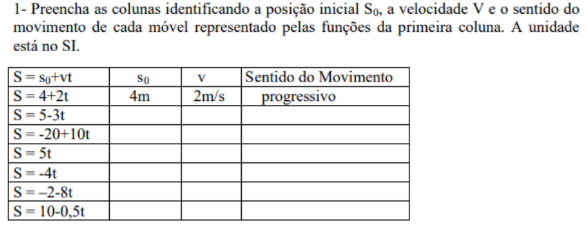 1) Um móvel descreve um MUV numa trajetória retilínea e sua posição varia no tempo de acordo com a expressão: s = 18 + 6t -2t². (SI)Determine: aposição inicial, a velocidade inicial e a aceleração. 2) É dado um movimento cuja função horária é: s = 26 -4t + 4t². (SI) Determine: aposição inicial, a velocidade inicial e a aceleração. 3) Um móvel parte do repouso da origem das posições com movimento uniformemente variado e aceleração igual a 2 m/s. Determine sua posição após 6 s.4) É dada a seguinte função horária da velocidade escalar de uma partícula em movimento uniformemente variado: v = 25 + 10t (SI) Determine: a) a velocidade inicial e a aceleração escalar da partícula; b) a velocidade escalar no instante 4 s; c) o instante em que a velocidade escalar vale 215 m/s. 4) A função horária da posição de um móvel é s = 2 - 3t + 2t² (posição em metros e tempo em segundos). A posição no instante t = 1 s, em metros, é: 5) A função horária da posição s de um móvel é dada por s=20+12t-t², com unidades do Sistema internacional. Nesse mesmo sistema, determine a velocidade depois de 5 S de movimento. 6) Um móvel descreve um MUV numa trajetória retilínea e sua posição varia no tempo de acordo com a expressão: s = 9 + 3t - 2t2. (SI) Determine: a posição inicial, a velocidade inicial e a aceleração. 7) Um móvel movimenta-se segundo a função horária das velocidades como V=5 – 2t no SI. Classifique o movimento para os instantes t=2s e t=4s : 8) O movimento de um corpo é descrito pela função horária S = − 10 + 4 t onde a posição está medida em quilômetros e o tempo em horas. Determinar: a) O espaço inicial; b) A velocidade; c) O instante em o corpo passa pela origem; d) A posição do corpo no instante 4 h; e) Caracterize o movimento deste corpo.