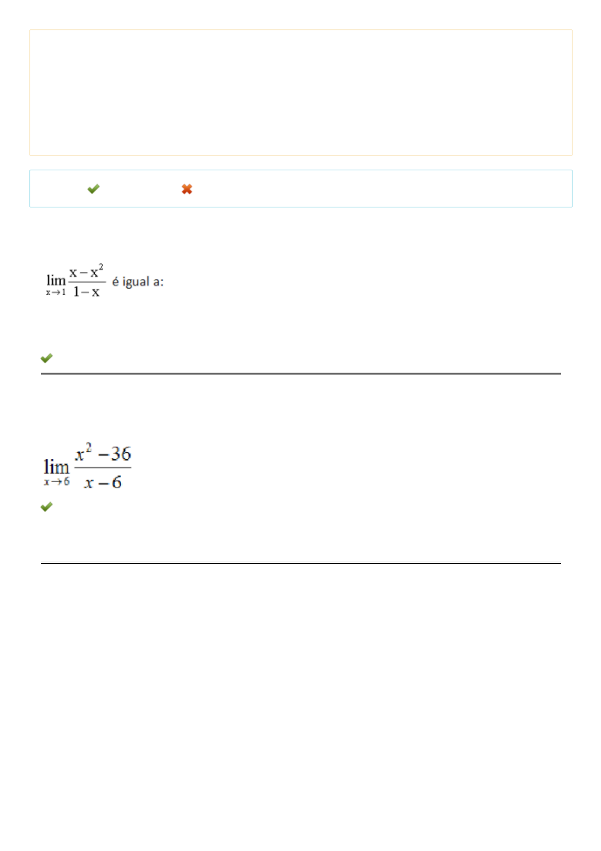 07/05/2019 UNIASSELVI - Centro Universitário Leonardo Da Vinci - Portal do Aluno - Portal do Aluno - Grupo UNIASSELVI https://portaldoalunoead.uniasselvi.com.br/ava/notas/request_gabarito_n2.php 1/4 Acadêmico: Ronildo Manoel Camilo (1190002) Disciplina: Cálculo Diferencial e Integral I (MAD101) Avaliação: Avaliação I - Individual FLEX ( Cod.:444804) ( peso.:1,50) Prova: 10634004 Nota da Prova: 10,00 Legenda: Resposta Certa Sua Resposta Errada 1. A definição de limite é utilizada no intuito de expor o comportamento de uma função nos momentos de aproximação de determinados valores. O limite de uma função possui grande importância no cálculo diferencial e em outros ramos da análise matemática, definindo derivadas e continuidade de funções. O resultado de a) Dois positivo. b) Zero. c) Um negativo. d) Um positivo. 2. O conceito de limites inaugura, dentro da história da ciência, um novo paradigma, em que as análises científicas ganham um grau de abstração muito maior. Podemos perceber este fato na definição de infinito. Neste sentido, vamos retomar os cálculos relacionados aos limites no infinito. Desta forma, calcule o valor do limite representado a seguir e assinale a alternativa CORRETA: a) O limite é 12. b) O limite é 15. c) O limite é 14. d) O limite é 6. 3. Um conceito fundamental no Cálculo, no que diz respeito ao estudo de funções, é o de continuidade de uma função num ponto de seu domínio. Observamos que, para questionarmos se uma dada função é contínua em determinado ponto, precisamos tomar o cuidado de verificar se esse ponto pertence ao domínio da função. Se tal ponto não está no domínio, a função não é contínua nesse ponto. Baseado nisto, classifique V para as sentenças verdadeiras e F para as falsas e, em seguida, assinale a alternativa que apresenta a sequência CORRETA: 07/05/2019 UNIASSELVI - Centro Universitário Leonardo Da Vinci - Portal do Aluno - Portal do Aluno - Grupo UNIASSELVI https://portaldoalunoead.uniasselvi.com.br/ava/notas/request_gabarito_n2.php 2/4 a) V - F - F - V. b) F - V - F - V. c) V - F - V - F. d) F - V - F - F. 4. Em matemática, o conceito de limite é usado para descrever o comportamento de uma função à medida que o seu argumento se aproxima de um determinado valor, assim como o comportamento de uma sequência de números reais. Calcule o limite da questão a seguir e assinale a alternativa CORRETA: a) Somente a opção IV está correta. b) Somente a opção I está correta. c) Somente a opção II está correta. d) Somente a opção III está correta. 5. Ao estudar limites de funções racionais no infinito, nos deparamos com a necessidade de utilizarmos as propriedades operatórias dos limites de uma função. No entanto, existem alguns dispositivos práticos que permitem sua resolução mediante uma análise do grau de cada termo da razão (numerador e denominador). Assinale a alternativa CORRETA que apresenta o valor do limite a seguir: a) 3. b) 0. c) Infinito. d) 1. 6. Dada uma expressão algébrica qualquer, podemos transformá-la, se possível, no produto de duas ou mais expressões algébricas. Este artifício tem uma aplicação relevante em limites, quando deparamos com alguma indeterminação. Assinale a alternativa CORRETA que apresenta este procedimento: a) Quadrado perfeito. b) Divisão de frações. c) Binômio de Newton. d) Fatoração. 07/05/2019 UNIASSELVI - Centro Universitário Leonardo Da Vinci - Portal do Aluno - Portal do Aluno - Grupo UNIASSELVI https://portaldoalunoead.uniasselvi.com.br/ava/notas/request_gabarito_n2.php 3/4 7. Os limites são usados no cálculo diferencial e em outros ramos da análise matemática para definir derivadas e a continuidade de funções. Aplicando as propriedades sobre limites, resolva a questão a seguir e assinale a alternativa CORRETA: a) Somente a opção I está correta. b) Somente a opção III está correta. c) Somente a opção IV está correta. d) Somente a opção II está correta. 8. Os limites são usados no cálculo diferencial e em outros ramos da análise matemática para definir derivadas e a continuidade de funções. Calcule o limite da questão a seguir, observe as opções e assinale a alternativa CORRETA: a) Somente a opção I está correta. b) Somente a opção II está correta. c) Somente a opção IV está correta. d) Somente a opção III está correta. 9. Em matemática, uma assíntota de uma curva é um ponto de onde os pontos da curva aproximam à medida que se percorre essa curva. Determine as assíntotas verticais da função a seguir e assinale a alternativa CORRETA: 07/05/2019 UNIASSELVI - Centro Universitário Leonardo Da Vinci - Portal do Aluno - Portal do Aluno - Grupo UNIASSELVI https://portaldoalunoead.uniasselvi.com.br/ava/notas/request_gabarito_n2.php 4/4 a) Somente a opção II está correta. b) Somente a opção III está correta. c) Somente a opção I está correta. d) Somente a opção IV está correta. 10. O conceito de limites inaugura, dentro da história da ciência, um novo paradigma, em que as análises científicas ganham um grau de abstração muito maior. Podemos perceber este fato na definição de infinito. Neste sentido, vamos retomar os cálculos relacionados aos limites no infinito. Desta forma, calcule o valor do limite a seguir e assinale a alternativa CORRETA: a) O limite é 12. b) O limite é 4. c) O limite é 3. d) O limite é 9. Prova finalizada com 10 acertos e 0 questões erradas.