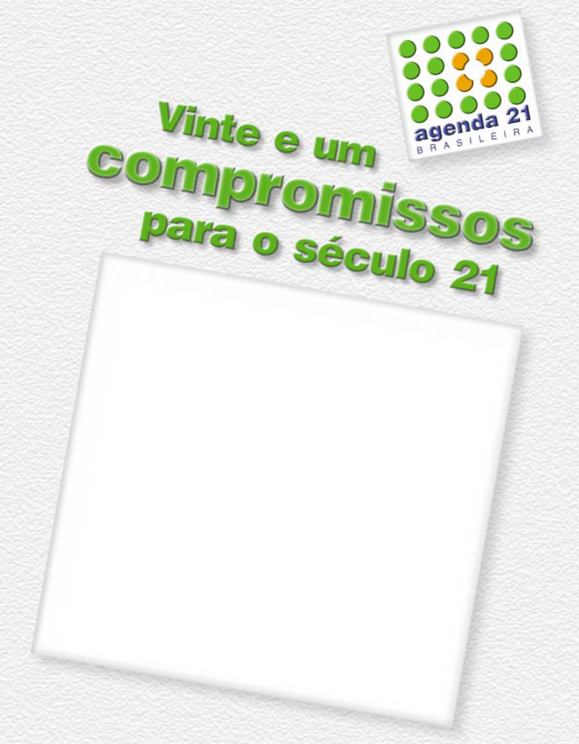 Produção e consumo sustentáveis, contra a cultura do desperdício. Ecoeficiência e responsabilidade social das empresas. Retomada do planejamento estratégico, infra-estrutura e integração regional.Energia renovável e biomassa. Informação e conhecimento para o desenvolvimento sustentável. Educação permanente para o trabalho e a vida. Promover a saúde e evitar a doença, democratizando o SUS. Inclusão social e distribuição de renda. Universalizar o saneamento ambiental, protegendo o ambiente e a saúde. Gestão do espaço urbano e a autoridade metropolitana. Desenvolvimento sustentável do Brasil rural. Promover a agricultura sustentável. Promover a Agenda 21 local e o desenvolvimento integrado e sustentável. Implantar o transporte de massa e a mobilidade sustentável. Preservar a quantidade e melhorar a qualidade da água nas bacias hidrográficas. Política florestal, controle do desmatamento e corredores da biodiversidade.Descentralização e pacto federativo: parcerias, consórcios e poder local. Modernização do Estado: gestão ambiental e instrumentos econômicos. Relações internacionais e governança global para o desenvolvimento sustentável. Cultura cívica e novas identidades na sociedade da comunicação. Pedagogia da sustentabilidade: ética e solidariedade. 1. 2. 3. 4. 5. 6. 7. 8. 9. 10. 11. 12. 13. 14. 15. 16. 17. 18. 19. 20. 21. Agenda 21 Brasileira: www.mma.gov.br http://www.mma.gov.br/estruturas/agenda21/_arquivos/reviport.pdf