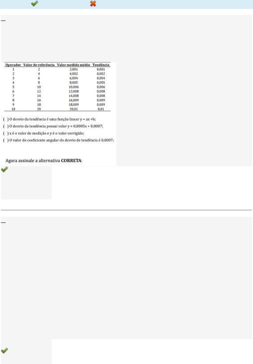 Disciplina: Análise dos Sistemas de Medição (CGQ05) Avaliação: Avaliação I - Individual FLEX ( Cod.:444031) ( peso.:1,50) Prova: 10633841 Nota da Prova: 10,00 Legenda: Resposta Certa Sua Resposta Errada Parte superior do formulário 1. O desvio linear de tendência está associado à forma como varia a tendência em função do valor da indicação. É utilizado quando há variação no valor da tendência, conforme a medição é realizada em diferentes regiões da faixa de medição de um sistema de medição. Considere uma situação onde operadores realizaram medidas do comprimento de peças para usinadas em um torno mecânico. Os valores de referência, valor médio medido por cada operador e a tendência estão apresentados na tabela a seguir. Sobre o exposto, classifique V para as sentenças verdadeiras e F para as falsas: a) V - V - V - F. b) F - V - V - V. c) V - F - V - V. d) V - F - F - F. 2. Existem uma série de conceitos e definições relacionados à análise de sistemas de medição que são importantes no momento da execução e determinação de um equipamento ou instrumentação, principalmente com relação às propriedades dos equipamentos como sensores e analisadores de amostras. Sobre o exposto, classifique V para as sentenças verdadeiras e F para as falsas: ( ) Precisão e exatidão: são expressões qualitativas que se referem ao grau de concordância entre diversas medições, assim como entre a medição e seu valor de referência. ( ) Rastreabilidade: propriedade de uma medição ou do valor de um padrão estarem relacionados a referências estabelecidas, geralmente padrões nacionais ou internacionais, por meio de uma cadeia contínua de comparações. ( ) Incerteza-padrão: é uma medida da intensidade da componente aleatória do erro de medição. ( ) Estabilidade: menor unidade de leitura do dispositivo de medição que limita o processo de detecção de variáveis entre os objetos medidos. Assinale a alternativa que apresenta a sequência CORRETA: a) V - F - F - F. b) V - V - V - F. c) V - F - V - V. d) F - V - V - V. 3. Na medição são abordados alguns conceitos básicos sobre características de um sistema de medição. Existem vários conceitos e características definidos a partir de diversos parâmetros. Sobre o exposto, analise as sentenças a seguir: I- Resolução: menor unidade de leitura do dispositivo de medição que limita o processo de detecção de variáveis entre os objetos medidos. II- Sensibilidade: cociente entre a variação da resposta (sinal de saída) e a correspondente variação do estímulo sinal de entrada. III- Curva de erros: um gráfico que representa os erros apresentados pelo sistema de medição como função da sua indicação. IV- Estabilidade: incerteza-padrão é uma medida da intensidade da componente aleatória do erro de medição. Assinale a alternativa CORRETA: a) As sentenças I, II e III estão corretas. b) As sentenças I, II e IV estão corretas. c) As sentenças II, III e IV estão corretas. d) As sentenças I, III, e IV estão corretas. 4. Para a análise do sistema de medição, existem ferramentas chamadas parâmetros de avaliação. Desta forma, diversos parâmetros foram desenvolvidos para avaliar o sistema de medição com base em um número finito de medições. Idealmente, deveríamos fazer infinitas medições para aferir o seu funcionamento, porém como isso não é possível, utilizamos a estatística como aliada para dar segurança aos dados coletados. Sobre esses parâmetros utilizados na análise dos sistemas de medição, analise as opções a seguir: I- Repetibilidade e reprodutibilidade. II- Estabilidade. III- Tendência. IV- Sensibilidade. Assinale a alternativa CORRETA: a) Somente a opção II está correta. b) As opções I, III e IV estão corretas. c) As opções I, II e III estão corretas. d) As opções II, III e IV estão corretas. 5. A ação de medir é quase natural nos seres humanos, serve como base para as mais variadas tarefas do dia a dia, tanto como economia e política. A medição é de grande importância, sobretudo no ambiente de produção industrial, onde diversos produtos estão sendo fabricados a cada minuto. Sobre a definição de "medir", assinale a alternativa CORRETA: a) Medir é a ação de atribuir um valor qualquer a um objeto. b) Medir é comparar uma característica de um objeto com outra, é atribuir um número e uma unidade de medida a um mensurando. c) Medir é realizar, apenas, a análise de comprimento de um determinado objeto. d) Medir é analisar a configuração física de um determinado objeto. 6. Como a determinação do resultado de uma medição (RM) depende de vários fatores, a sua determinação analítica da mesma requer procedimentos que envolvem cálculos matemáticos e estatísticos que levam em consideração tanto aspectos físicos do instrumento, bem como a existência de erros (SILVA; CIRILO, 2015, p. 4). Sobre as etapas para a determinação da repetibilidade de uma medição, classifique V para as sentenças verdadeiras e F para as falsas: ( ) Determinação da amplitude de medição para cada amostra, considerando o número de repetições. ( ) Determinação da média das amplitudes; ( ) Busca do coeficiente d2 na tabela, lembrando o número de repetições e g=nº de amostras multiplicado por nº de operadores. ( ) Cálculo do desvio padrão. ( ) Determinação da variação dimensional dos corpos de prova. Assinale a alternativa que apresenta a sequência CORRETA: FONTE: SILVA, N.; CIRILO, J. Estudo do erro sistemático ou tendência e repetitividade de um instrumento de medição. In: 8º Congresso Brasileiro de Metrologia. Anais. Bento Gonçalves, 2015. a) F - V - V - F - V. b) V - V - V - V - F. c) V - V - F - V - F. d) V - F - V - V - V. 7. Segundo Albertazzi e Sousa (2008), um gráfico representa a variação apresentada pelo sistema de medição como função da sua indicação. Para cada valor da indicação, o g
