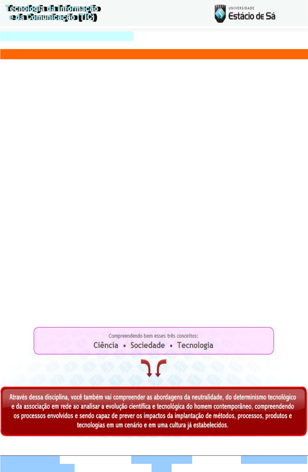 Rio de Janeiro 22 de Outubro de 2010 Aula 1: Ciência, Tecnologia e Sociedade Objetivo: 1. Conhecer a estrutura da disciplina Tecnologia da Informação e Comunicação, o plano de ensino e o mapa conceitual. 2. Compreender, diferenciar e relacionar os conceitos sobre ciência, tecnologia e sociedade. 3. Identificar as características da relação dialética entre ciência, tecnologia e sociedade, a partir do efeito de retroação. Seja bem-vindo à Tecnologia da Informação e da Comunicação! Os conceitos abordados na disciplina de Tecnologia da Informação e Comunicação estão organizados e estruturados no plano de ensino. Como forma de apresentação, discussão e desenvolvimento de nosso plano de ensino vamos orientar nossos encontros para a apresentação do contexto em que cada conceito está inserido, sua definição e aplicação na prática, através de exemplos e casos propostos no ambiente da disciplina e também trazidos e compartilhados por você em nossos fóruns. Através do mapa conceitual da disciplina, apresentado de forma gráfica, você poderá visualizar os principais conceitos da disciplina e seu relacionamento. Acesse, agora, o mapa conceitual e perceba que, para atuar profissionalmente de forma competente, ética e sustentável na área de Tecnologia da Informação, é muito importante que o estudante compreenda os conceitos de ciência, tecnologia e sociedade e suas relações, que são a base dessa disciplina. Ao projetar, desenvolver ou implementar um novo sistema, software, processo, metodologia ou produto tecnológico é oportuno que o profissional compreenda o cenário global mundial, bem como a cultura regional e organizacional onde atua, identificando os impactos de sua atuação nesse contexto e percebendo suas relações, o estudante será capaz de estabelecer relações de causa e efeito e compreender a relação dialética entre eles, ou seja, as influências mútuas que vão determinar avanços sociais, científicos e tecnológicos no mundo atual e que contribuíram para a revolução digital, período que vivenciamos atualmente. Raphael da Silva Roma 2º Período – 2º Módulo Sistemas de Informação Matrícula: 2010.01.50934-1 2010.4 4 Conceitos de Ciência, Tecnologia e Sociedade. Há conceitos variados sobre os termos ciência, sociedade e tecnologia. Se consultarmos o dicionário Aurélio, encontraremos as seguintes definições: Conjunto organizado de conhecimentos relativos a certas categorias de fatos ou fenômenos. Toda ciência, para definir-se como tal, deve necessariamente recortar, no real, seu objeto próprio, assim como definir as bases de uma metodologia específica: ciências físicas e naturais. Reunião de homens, de animais, que vivem em grupos organizados; corpo social. Conjunto de membros de uma coletividade, sujeitos às mesmas leis. Cada um dos diversos estágios da evolução do gênero humano. Estudo dos instrumentos, processos e métodos empregados nos diversos ramos industriais. Raphael da Silva Roma 2º Período – 2º Módulo Sistemas de Informação Matrícula: 2010.01.50934-1 2010.4 5 Nestas definições, podemos perceber claramente que a ciência está diretamente relacionada ao conhecimento, à sociedade, aos seres humanos e à tecnologia, às técnicas, aos métodos, processos e instrumentos. Nas diferentes definições encontradas na literatura publicada sobre esses termos, com particular observação da proposta de definição da UNESCO, podemos destacar algumas características relevantes em cada uma: Ciência: Constitui-se de um conjunto de conhecimentos organizados; Desenvolve-se através do tempo; Parte de mecanismos de causalidade dos fatos observáveis; Baseia-se no estudo objetivo de fenômenos empíricos; Está relacionada à comprovação de teorias; Está associada à publicação de artigos, teses, livros, etc.; Os conhecimentos criados são livremente veiculados e patrimônio da civilização. Sociedade: Constitui-se por um conjunto de pessoas; Desenvolve-se através do tempo; Baseia-se em um sistema de relacionamentos entre as pessoas; Seus membros compartilham propósitos, interesses, preocupações e costumes e interagem entre si, constituindo uma comunidade; Seus membros constroem conhecimentos e desenvolvem tecnologia. Tecnologia: Constitui-se de um conjunto de conhecimentos científicos ou empíricos; Desenvolve-se através do tempo; Baseia-se na aplicação dos conhecimentos na produção ou melhoria de bens e serviços; Está relacionada aos impactos socioeconômicos sobre uma comunidade; Seus resultados são obtidos a partir da aplicação de novos materiais, processos, métodos e produtos nos meios de produção; Está sintonizada com o desenvolvimento econômico e o bem-estar da sociedade; Seus produtos e processos são passíveis de negociação e de enquadramento como patentes. Consulte o material didático: Para entender os conceitos sobre ciência, tecnologia e sociedade, leia o conteúdo das páginas de 31 a 33 do livro Gestão da Inovação Tecnológica, 2ª Edição, de Dálcio Roberto dos Reis, apresentação de Gina Paladino. Editora Manole, 2008. Relação Dialética entre Sociedade, Ciência e Tecnologia. Dialética Do grego “dia” (troca) e “lekticós” (apto à palavra) o termo dialética tem a mesma raiz de diálogo. Uma relação dialética significa uma contínua relação recíproca, na qual nada pode ser entendido isoladamente, fora da realidade à sua volta e sem relações constantes de determinação mútua. Tudo e todos pertencem a uma "totalidade dialética" e fazem parte de uma estrutura. Dizer que a relação entre sociedade, ciência e tecnologia é dialética significa dizer que: Raphael da Silva Roma 2º Período – 2º Módulo Sistemas de Informação Matrícula: 2010.01.50934-1 2010.4 6 As setas com dupla direção indicam simultaneamente “determina e é determinada”. Para entendermos melhor essa relação dialética ou de retroação entre 