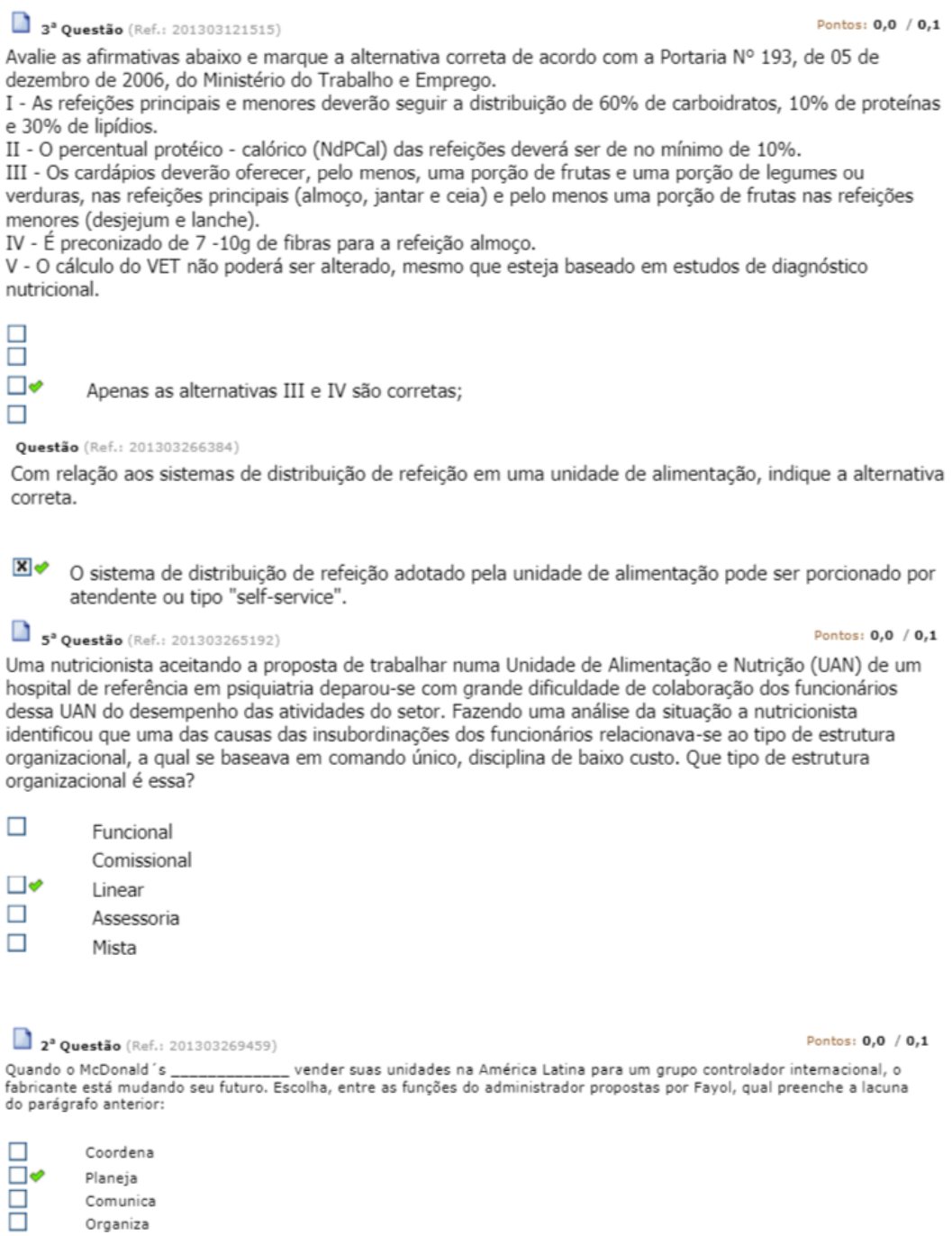 2a Questão (Ref.:201502320828) Acerto: 0,2 / 0,2 Qual a lei que fixa parâmetros para a gradação da multa administrativa variável prevista no art. 25 da Lei nº 7.998, de 11 de janeiro de 1990, pelo não cumprimento das obrigações relativas ao programa do seguro desemprego Resolução CFN nº 380 de 2005 PORTARIA Nº 193, DE 23 DE NOVEMBRO DE 2015 Lei nº 7.998 de 1990 PORTARIA Nº 193, DE 23 DE NOVEMBRO DE 2006 Resolução CRN nº 195 de 2013 3a Questão (Ref.:201502310080) Acerto: 0,2 / 0,2 Unidades de Alimentação e Nutrição devem possuir áreas operacionais que facilitem a produção de alimentos seguros. Quanto a este tema, marque a opção INCORRETA. O cálculo da área do refeitório baseado na acomodação de 1/3 dos comensais é justificado pela reutilização do espaço durante a distribuição das refeições. A política de compras e de abastecimento e o padrão de cardápios constituem fatores intervenientes no dimensionamento de áreas em Unidades de Alimentação e Nutrição. Para facilitar as operações de limpeza, é permitida a instalação de ralos, quando sifonados, no interior das câmaras frigoríficas e antecâmaras. A despensa ou almoxarifado não deve apresentar ralos para escoamento da água. A delimitação com paredes completas de áreas destinadas à higienização dos utensílios visa minimizar o risco de contaminação. 4a Questão (Ref.:201501480744) Acerto: 0,2 / 0,2 As várias funções do administrador, consideradas como um todo forma o processo administrativo. Planejamento, organização, direção e controle constituem as funções administrativas, que numa Unidade de Alimentação e Nutrição (UAN) é responsabilidade do nutricionista. Com base nessa premissa quanto à conceituação dessas funções quais dos itens abaixo apresentam somente proposições verdadeiras? I- Planejamento é a forma de racionar os objetivos com as condições disponíveis e determinar a melhor forma de execução das operações. II- Organizar é orientar e indicar o comportamento dos indivíduos e para isso três pontos são fundamentais: liderança, comunicação e motivação. III- Controle é assegurar se o que foi planejado, organizado e dirigido realmente atingiu os objetivos Somente I I e III apenas Somente II I, II e III II e III apenas 5a Questão (Ref.:201501336081) Acerto: 0,0 / 0,2 Avalie as questões abaixo e classifique como V (verdadeira ) e F(falsa): ( ) Para evitar problemas de U.A.N. uma boa iluminação é essencial. Para isso é relevante observar nas áreas que não haja ofuscamento, sobras, reflexos fortes. Não interferindo a cor da parede no tipo de iluminação. Outro detalhe é que as janelas ou outras aberturas deverão não incidir luz direta na superfície de trabalho. ( ) Nas áreas de preparações prévias de refeições, preparo de carnes, verduras sobremesas e sucos. Caso o serviço exija outras áreas (lanches desjejuns e dietas) devem ser dimensionadas. Porque nunca se pode usar uma área definida para um tipo de preparação, para outro tipo de pré-preparo. ( ) A localização da U.A.N. do hospital Santa Casa de Misericórdia em Ponta Grossa está no local inadequado fica no subsolo próximo a entrada e saída de carros, reduz trabalho desnecessário no recebimento de produtos, mas não facilita futuras instalações e o trabalho operacional. ( ) As principais áreas de uma U.A.N. podem ser divididas em: aprovisionamento, processamento, distribuição. Nessas as portas possuem borrachas de vedação; a ventilação pode ser cruzada, janelas teladas. ( ) Os tipos de distribuição podem ser: cafeteria refeição distribuída no balcão térmico, francesa e inglesa que usa garçom, americano com os alimentos dispostos em mesas. Sendo qualquer dessas formas de distribuição indicadas para pequenos e grandes números de refeições. Marque a sequência correta. V, V, F, F, F F, V, F, V, F F, V, V, F, V F, F, V, F, F V, F, F, F, F 6a Questão (Ref.:201501480069) Acerto: 0,2 / 0,2 Considerando a classificação de uma Unidade de Alimentação e Nutrição (UAN) quanto aos seus objetivos e forma de gestão, a empresa MAXLIMP, transportadora de produtos de higiene e limpeza, contratou uma nutricionista para gerenciar sua Unidade de Alimentação e Nutrição localizada no interior empresa. Durante a contratação foi explicado que a UAN tinha um regime de gestão no qual todos os equipamentos, recursos humanos e matéria-prima eram gerenciados pela própria empresa. Com base em tais informações, qual a classificação dessa UAN quanto aos objetivos e quanto a forma de gestão respectivamente? Social e refeição convênio Institucional e autogestão Industrial e concessão Hospitalar e concessão Autogestão e Industrial 7a Questão (Ref.:201501970209) Acerto: 0,2 / 0,2 A organização de qualquer empresa pode ser definida como o agrupamento das atividades necessárias à realização dos objetivos, bem como a atribuição dessas atividades a departamentos apropriados e aos passos necessários para delegação e coordenação da autoridade. Em uma Unidade de Alimentação e Nutrição, o fator a ser considerado na disposição eficiente das áreas de trabalho é: a planta física. o aspecto estético. a disponibilidade financeira. o layout. o fluxo de trabalho. 8a Questão (Ref.:201502316822) Acerto: 0,2 / 0,2 A normatização de todas as operações realizadas com vistas à produção e distribuição de refeições em Unidades de Alimentação e Nutrição deve estar respaldada nos seguintes elementos do processo administrativo: equilíbrio, segurança, ajuste e comando; organização, segurança, ajuste e responsabilidade. planejamento, organização, direção e controle; equilíbrio, responsabilidade, comando e controle; planejamento, ajuste, coordenação e direção; 9a Questão (Ref.:201502320827) Acerto: 0,2 / 0,2 De acordo com a Resolução CFN nº 380 de 2005, qual das opões abaixo faz parte das áreas de nutrição