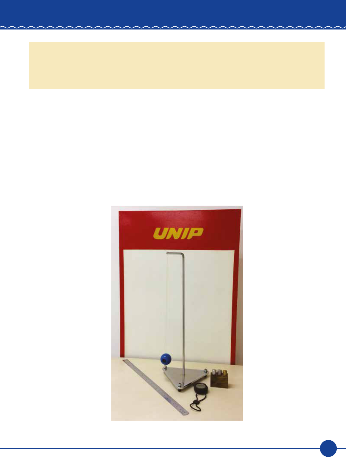115 FI S - Re vi sã o: R ic ar do - D ia gr am aç ão : F ab io - 0 3/ 07 /2 01 7 OSCILAÇÕES E ONDAS Unidade IV 7 ROTEIROS EXPERIMENTAIS I Apresentam-se nesta unidade duas experiências – pêndulo simples e pêndulo de mola – nas quais os conceitos desenvolvidos na teoria poderão ser verificados e explorados. É importante ter em mente que a Física é uma ciência experimental, que nasceu do estudo dos fenômenos naturais. Para explorá-los, utilizam-se recursos de laboratório e um método, o método científico, o qual é uma das principais contribuições para a ciência de Galileu, que foi quem deu início ao estudo de pêndulos simples. Lembre-se ainda de que se deve ser cuidadoso na tomada de dados experimentais, pois qualquer medida é acompanhada de incertezas e a intenção é sempre minimizá-las, aproximando-se do valor verdadeiro. 7.1 Pêndulo simples Figura 62 – Arranjo experimental: pêndulo simples com massa variável 116 FI S - Re vi sã o: R ic ar do - D ia gr am aç ão : F ab io - 0 3/ 07 /2 01 7 Unidade IV 7.1.1 Objetivo Estudar a relação entre o período de oscilações e a massa pendular e determinar a aceleração da gravidade local. 7.1.2 Introdução teórica Retomemos as forças atuantes no movimento de um pêndulo simples, descrito anteriormente: mg senθ mg cosθ m mg θ θ L Figura 63 – Representação do movimento de um pêndulo simples Para pequenas oscilações, o movimento de um pêndulo se aproxima de um movimento harmônico simples (MHS), e o período (T) pode ser calculado segundo a equação: L T 2 g = pi Em que g é a aceleração da gravidade local (em m/s2) e L o comprimento do fio (m). Lembrete A frequência angular (ou pulsação) ω foi assumida no desenvolvimento da teoria do pêndulo simples como: g L = ω 117 FI S - Re vi sã o: R ic ar do - D ia gr am aç ão : F ab io - 0 3/ 07 /2 01 7 OSCILAÇÕES E ONDAS A equação anterior pode ser utilizada para o cálculo da aceleração local, conhecidos o período (T) e o comprimento do fio (L). Observe que não existe nela um termo que dependa do ângulo θ formado entre o pêndulo e a linha vertical. Portanto, é de supor que os resultados sejam aceitáveis, com erros da ordem das incertezas dos aparelhos de medida apenas para pequenos ângulos. Esse fato também pode ser investigado experimentalmente, estudando-se a variação do período em função do ângulo de movimento. Calcula-se que, para amplitudes inferiores a 50o, o desvio no período seja inferior a 5%. Para ângulos maiores, a expressão anterior assume a forma: 2L T 2 1 g 16 θ = pi + Saiba mais O site a seguir permite simular a experiência do pêndulo simples: UNIVERSITY OF COLORADO BOULDER. PhET Interactive Simulations. Pendulum lab 2.3. Colorado, [s.d.]b. Disponível em: <https://phet.colorado. edu/sims/pendulum-lab/pendulum-lab_en.html>. Acesso em: 14 jun. 2017. 7.1.3 Material utilizado 1) Arranjo experimental com base, haste, fio e esfera para massas intercambiáveis. 2) Cilindros de densidades diferentes (alumínio: 1; ferro: 2; latão: 3). 3) Régua em milímetros. 4) Cronômetro. 5) Balança. 7.1.4 Procedimento experimental 1) Meça o comprimento L do pêndulo (até o centro de massa) e a massa dele. 2) Coloque o sistema para oscilar com uma pequena amplitude de movimento (com ângulo q1 < 10 o). 3) Meça o tempo de 10 oscilações completas (t10) e calcule o período (T). 4) Varie o ângulo de oscilação e repita os itens 2 e 3, preenchendo a Tabela 1. 118 FI S - Re vi sã o: R ic ar do - D ia gr am aç ão : F ab io - 0 3/ 07 /2 01 7 Unidade IV 5) Alterando a massa do sistema com a inserção dos cilindros 1, 2 e 3, repita os procedimentos 1, 2 e 3 e complete a Tabela 2. 6) Varie o comprimento L do pêndulo e preencha a Tabela 3. 7.1.5 Roteiro experimental: pêndulo simples 1. Qual é o objetivo do experimento? 2. Indicar os instrumentos de medida utilizados e suas respectivas precisões. 3. Preencher as tabelas com os valores experimentais coletados: Tabela 1 – Estudo da relação entre o ângulo e o período Comprimento L = _______m massa m = _________kg θ(o) t10(s) T(s) Tabela 2 – Estudo da relação entre a massa e o período Comprimento L = _______m m(kg) t10(s) T(s) 119 FI S - Re vi sã o: R ic ar do - D ia gr am aç ão : F ab io - 0 3/ 07 /2 01 7 OSCILAÇÕES E ONDAS Tabela 3 – Estudo da relação entre o comprimento e o período massa m = _________kg L(m) t10(s) T(s) T2(s2) 4. O que se pode afirmar sobre os resultados encontrados do período em relação ao ângulo inicial, registrados na Tabela 1? 5. O que se pode afirmar sobre os resultados encontrados do período em relação à massa, registrados na Tabela 2? 120 FI S - Re vi sã o: R ic ar do - D ia gr am aç ão : F ab io - 0 3/ 07 /2 01 7 Unidade IV 6. Construir em papel milimetrado o gráfico T(s) x L(m) com os dados registrados na Tabela 3. 7. Qual é a forma da curva obtida? Os resultados sugerem qual tipo de função que relaciona o período com o comprimento do fio? 121 FI S - Re vi sã o: R ic ar do - D ia gr am aç ão : F ab io - 0 3/ 07 /2 01 7 OSCILAÇÕES E ONDAS 8. Construir um gráfico dos dados da Tabela 3: T2(s2) x L(m) (quadrados dos períodos em função dos comprimentos do pêndulo). 9. A partir do gráfico obtido, determine o coeficiente angular da reta b. Com base na relação descrita na introdução teórica, calcule a aceleração gravitacional local g. g = 4p2/b g = ________________m/s2 122 FI S - Re vi sã o: R ic ar do - D ia gr am aç ão : F ab io - 0 3/ 07 /2 01 7 Unidade IV 10. Compare o resultado obtido experimentalmente para a aceleração da gravidade g com o valor encontrado na literatura para a sua região e comente possíveis discrepâncias. O cálculo do erro E (%) fornecerá a comparação. ( ) exp lit lit g g E % .100 g − = Observação A aceleração da gravidade não é constante na superfície da Terra. Pequenas variações ocorrem devido à altitude e à latitude local, entre outros fatore